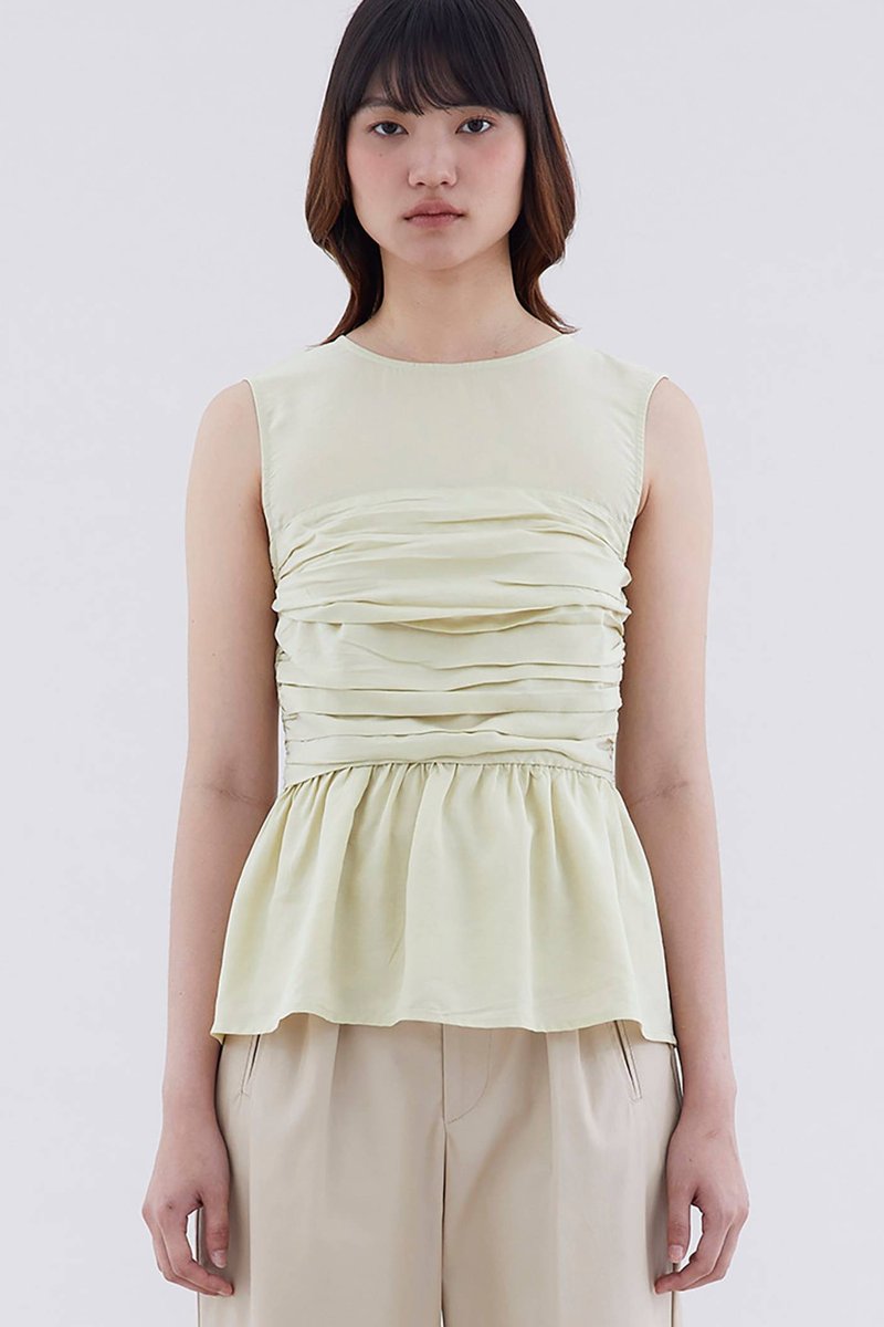 For the love of textures. Made from smooth and non-stretch fabric, this sleeveless top features a round neckline, ruched front and sides, back opening with a tie-strap, peplum hem and back zip closure. Worn in a slim fit.