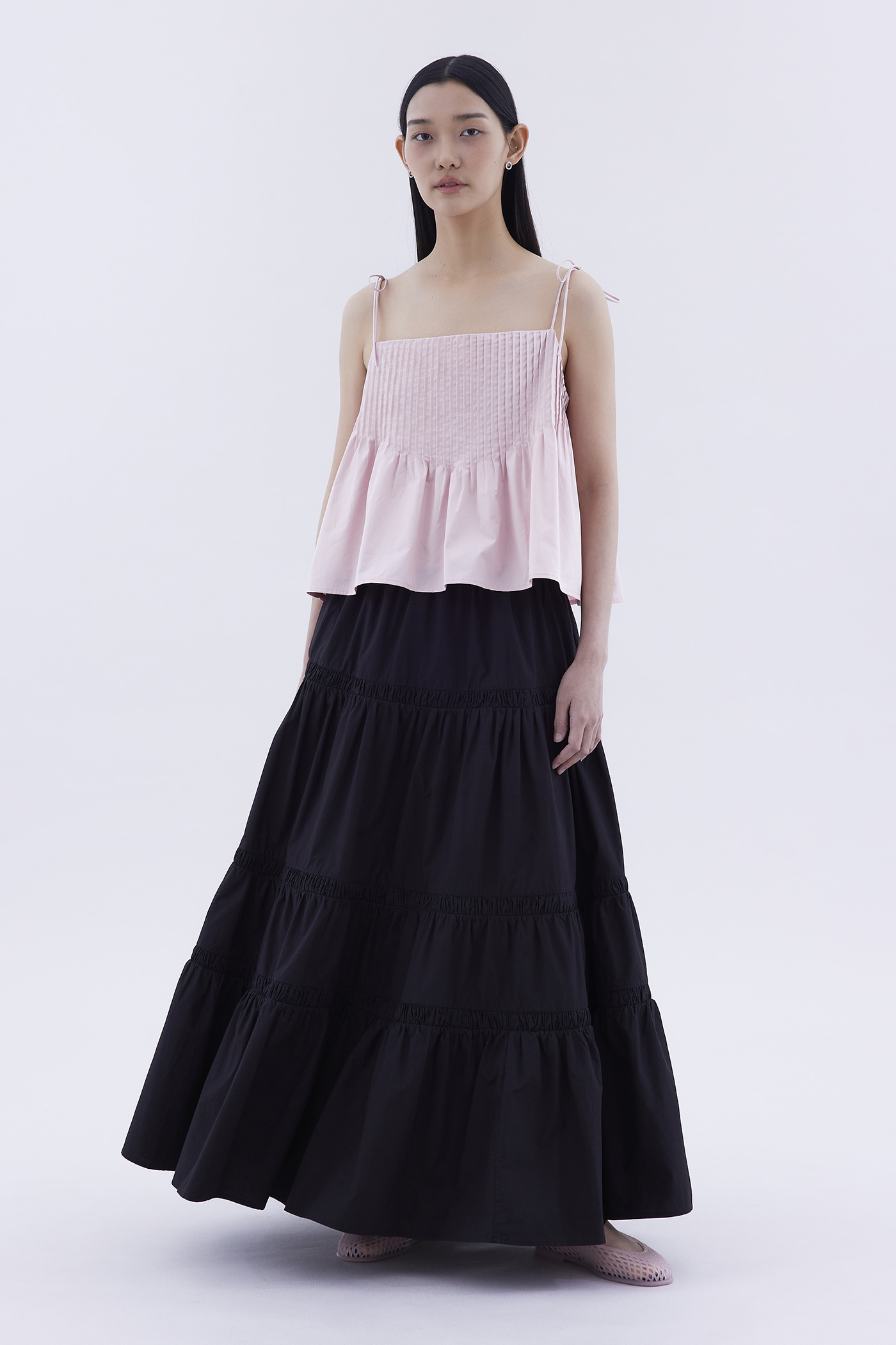 Tactile. Made from light and crisp cotton, this sleeveless top features pin-tuck pleats, a straight neckline and slim self-tying shoulder straps. Worn in a relaxed fit.