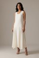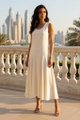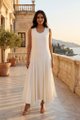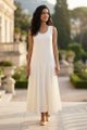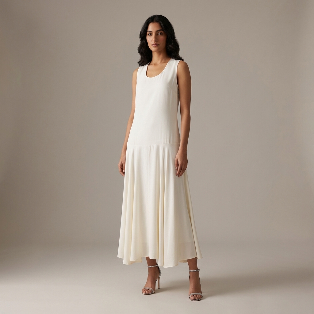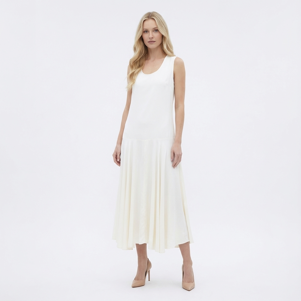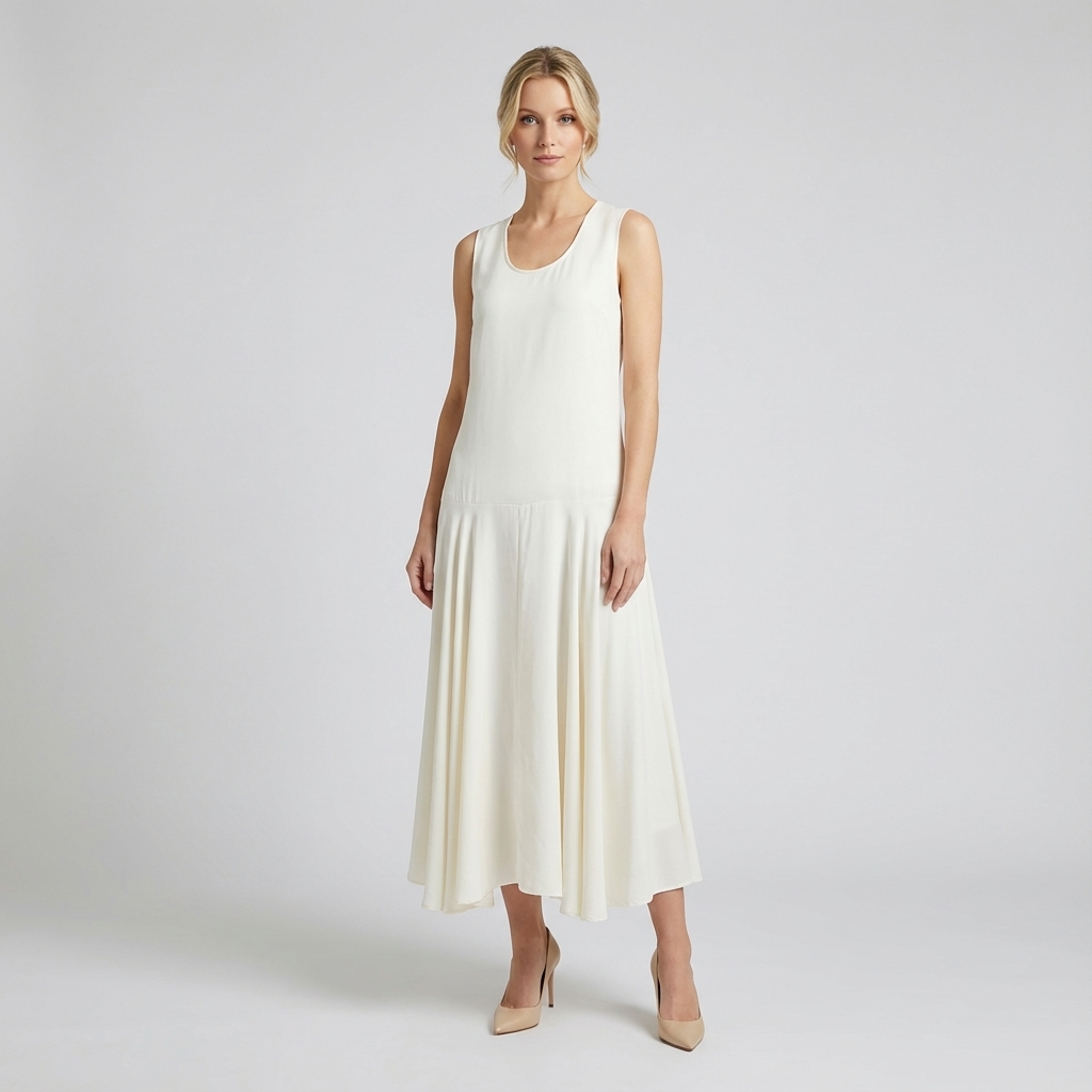 One and done. Made from smooth and drapey fabric, this sleeveless maxi dress features a flowy dropped waist, scoop neckline and back zip closure. Fits relaxed in a swing silhouette.