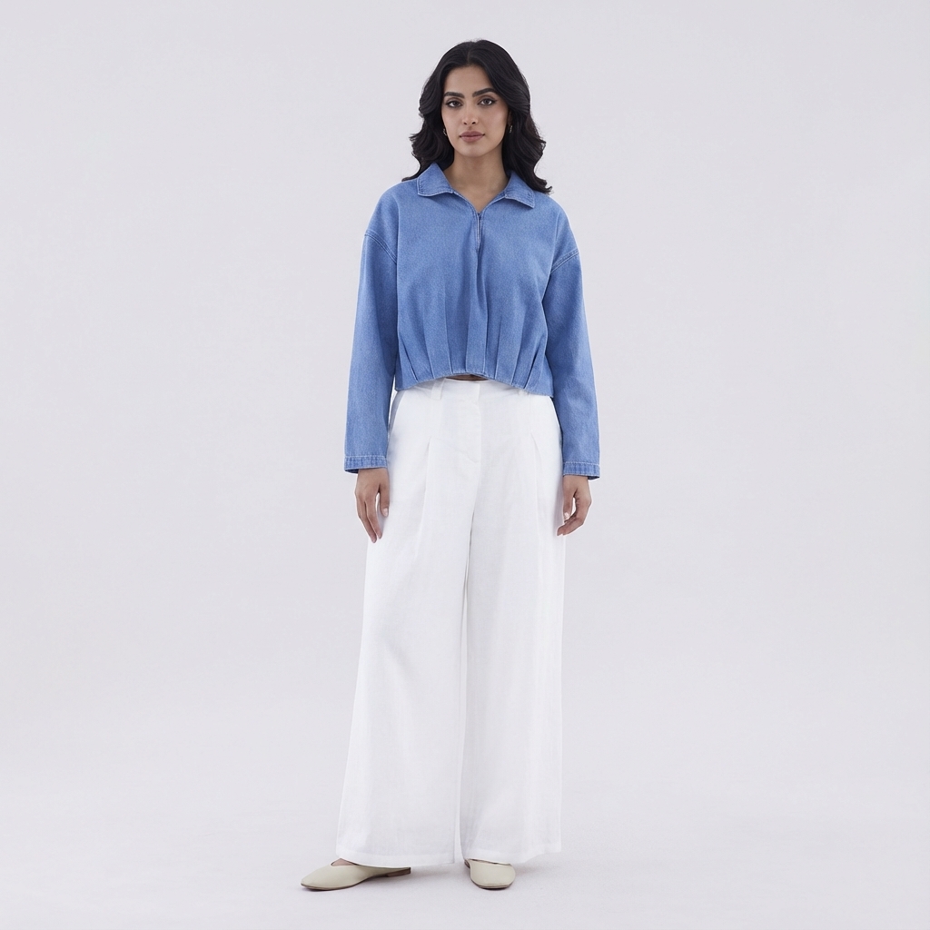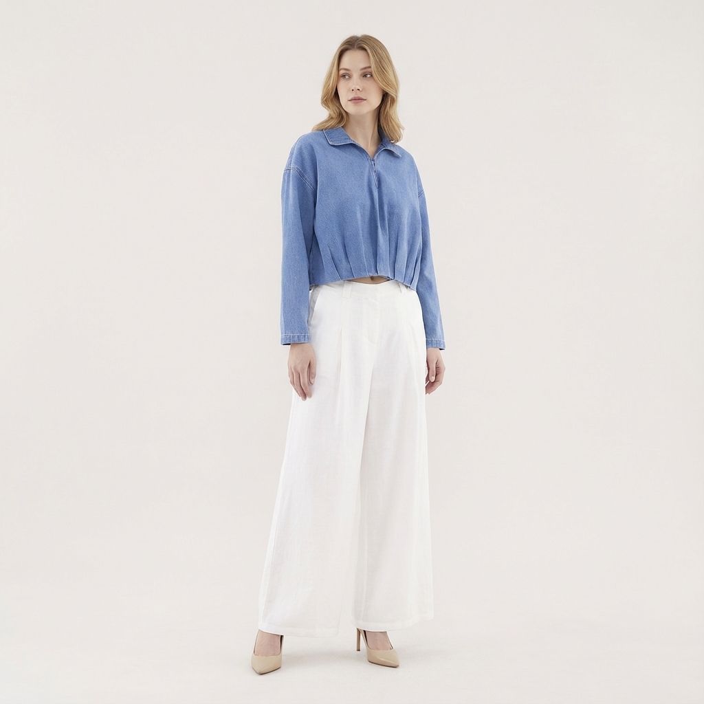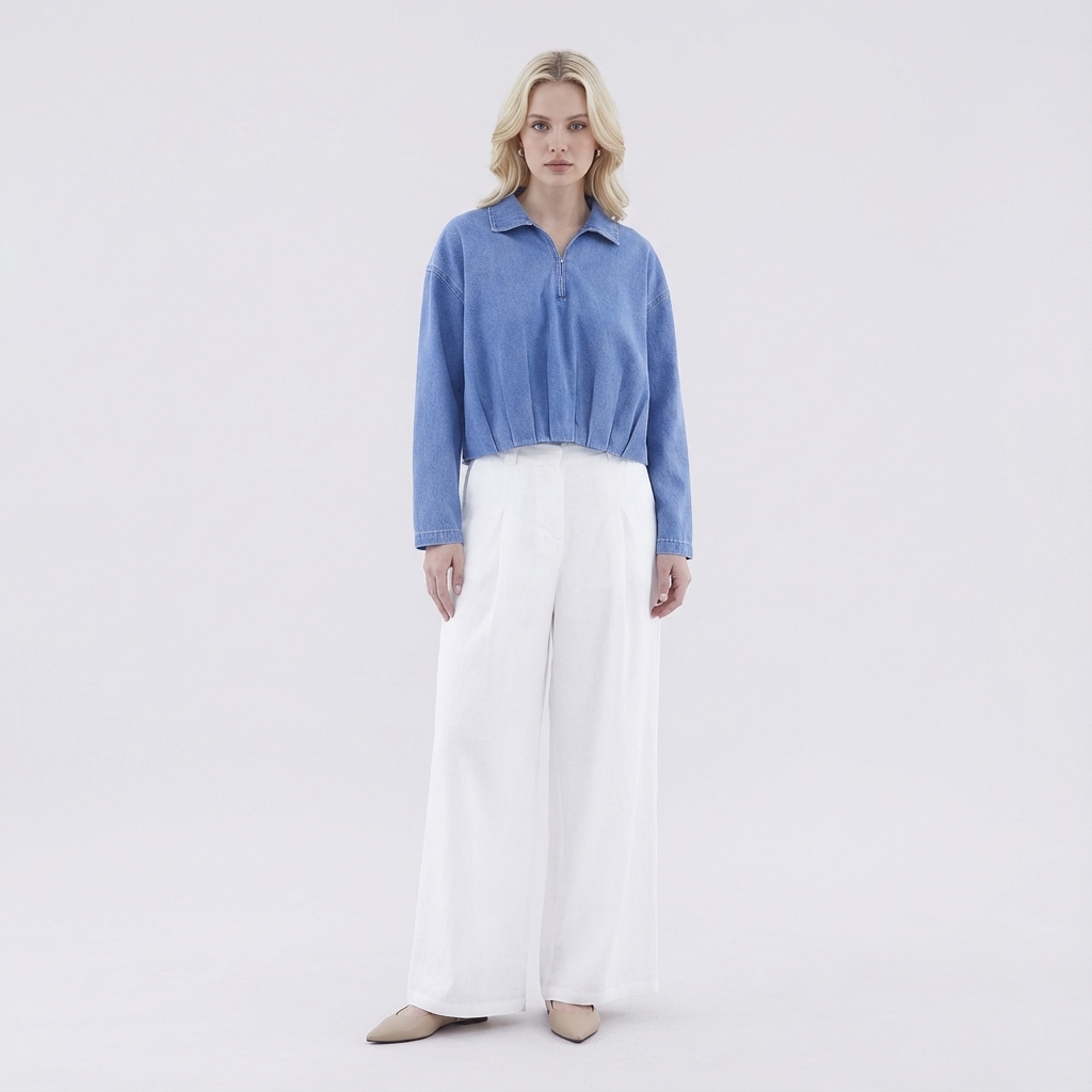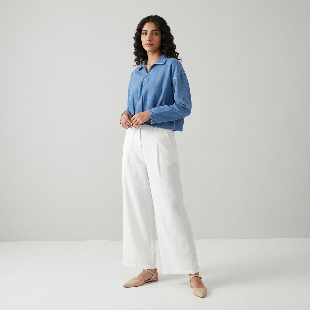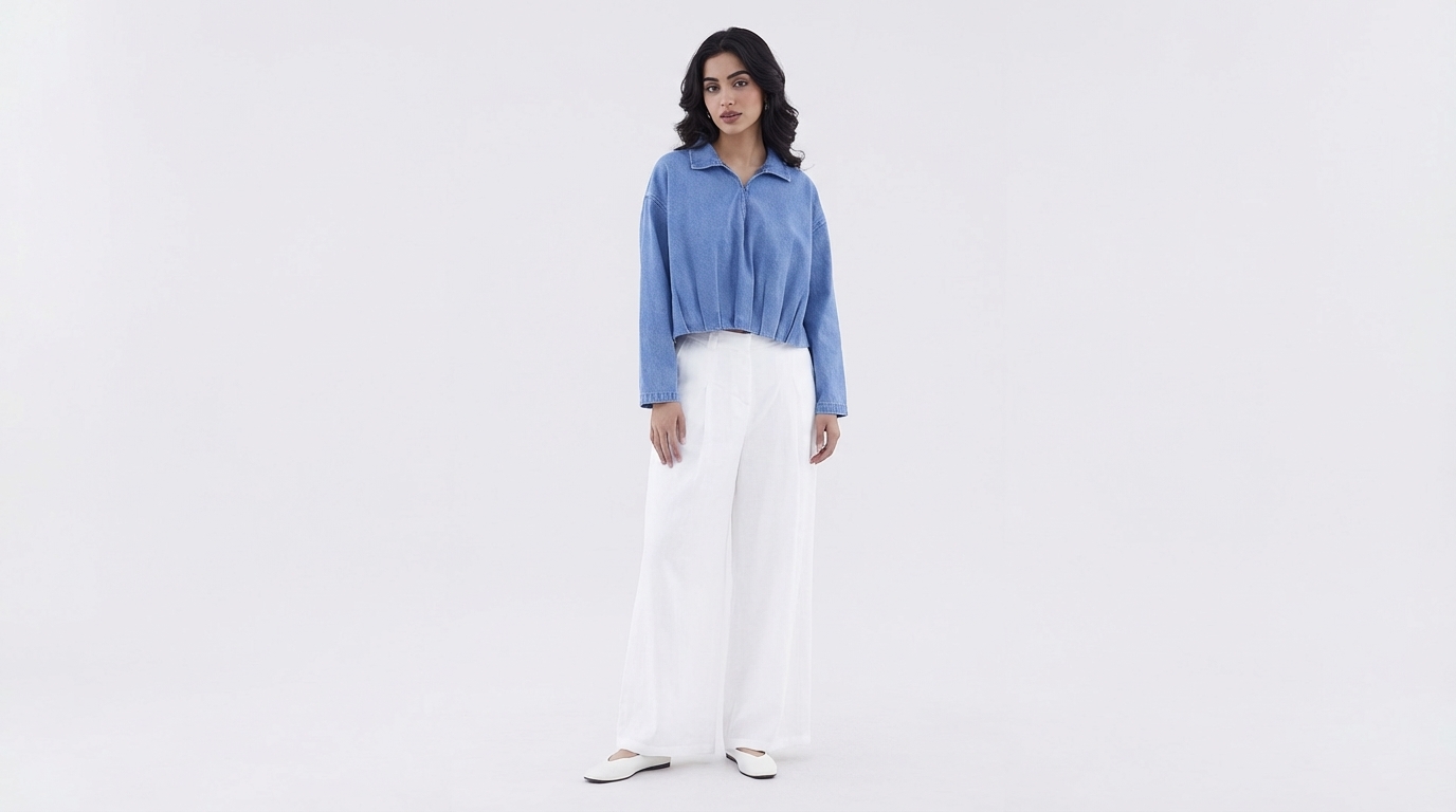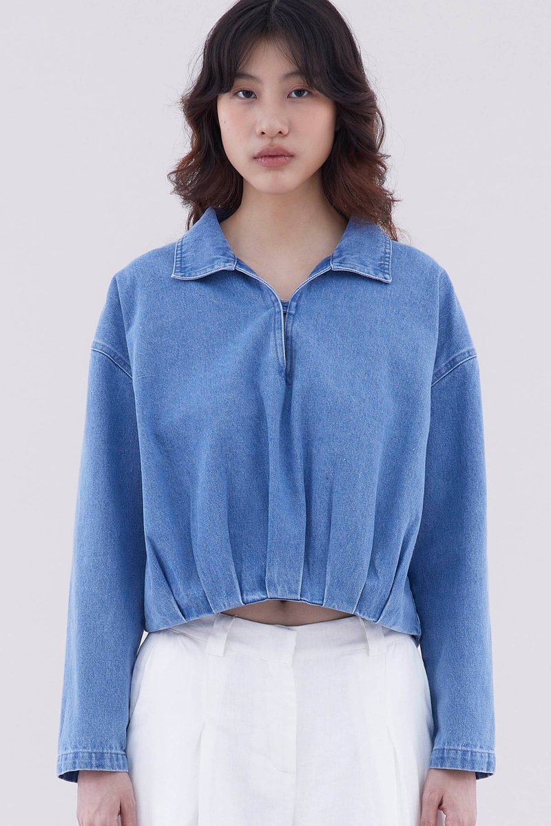 Refresh your denims. Cut from softly structured cotton denim, this top features a collared neckline with a front loop button, long sleeves and a pleated hem. Worn in a relaxed fit.