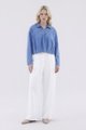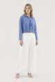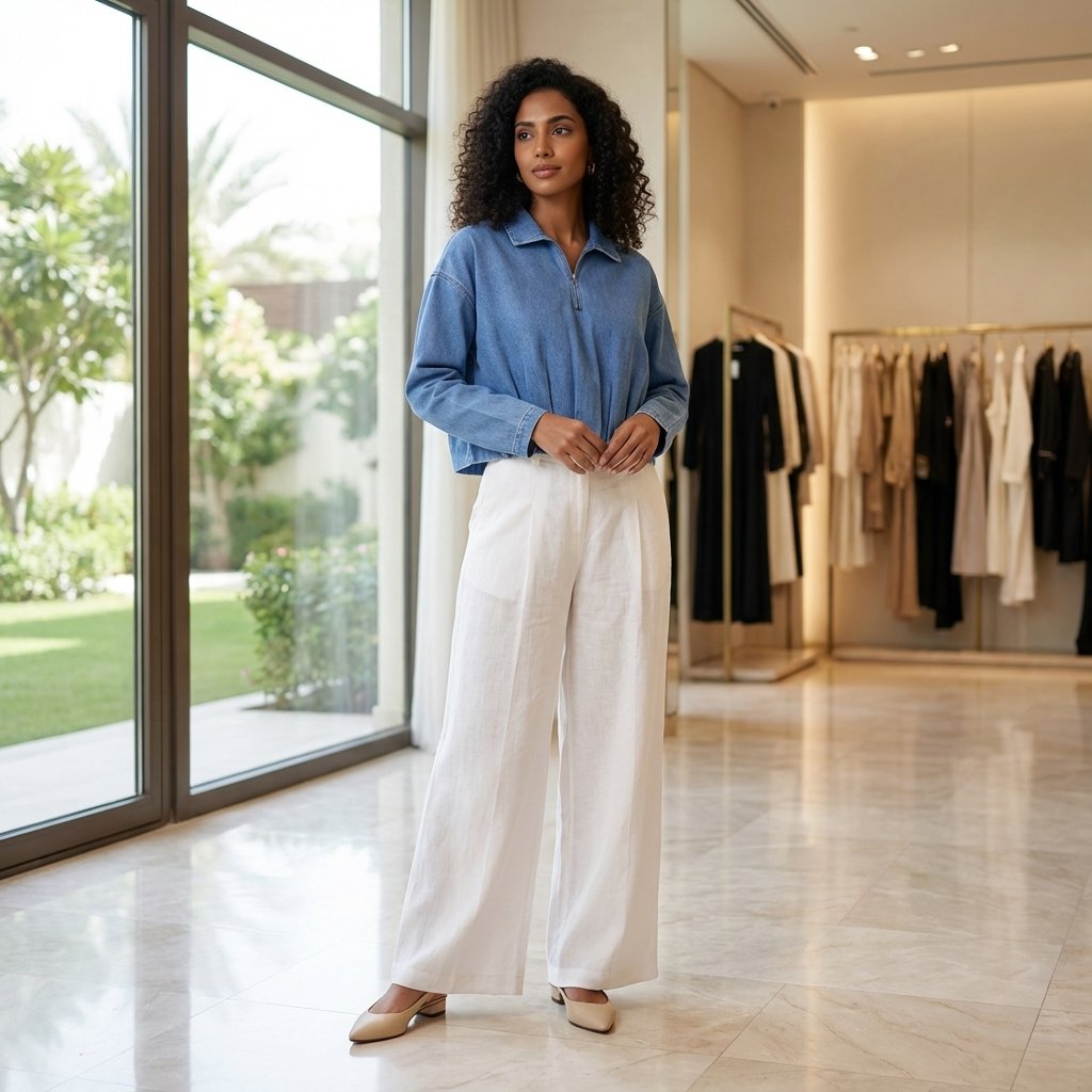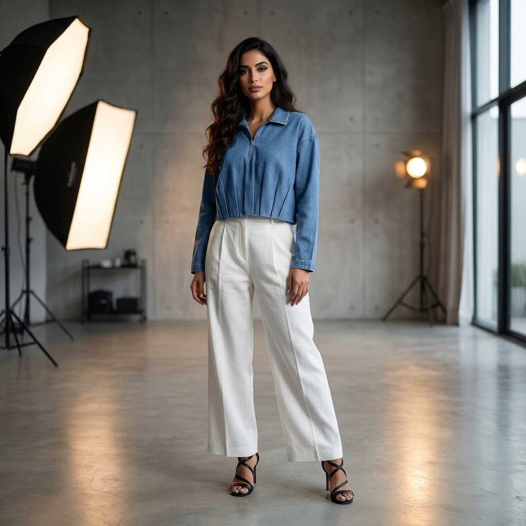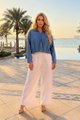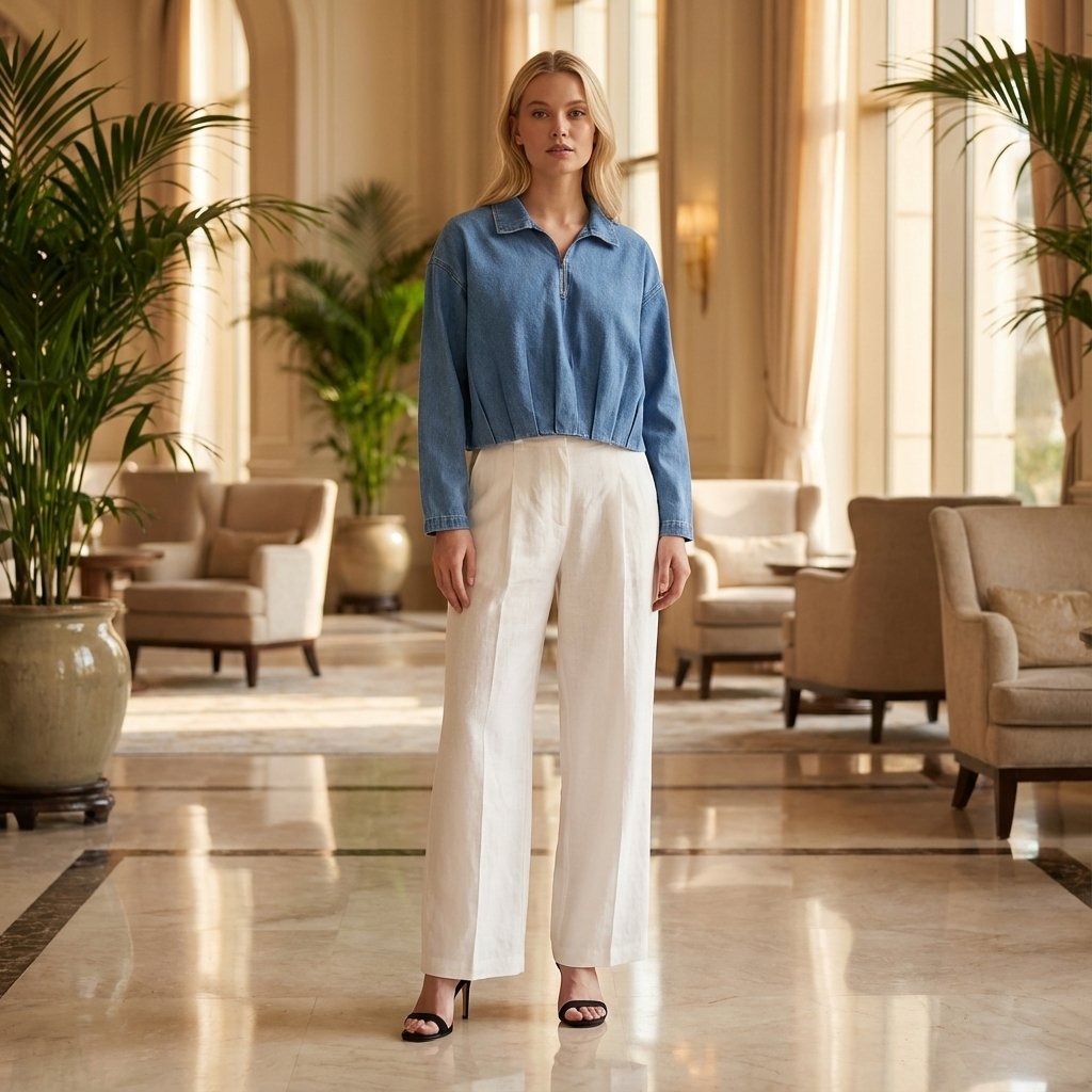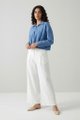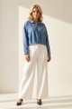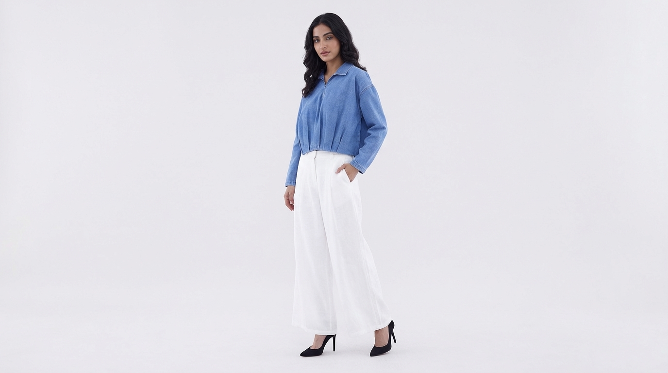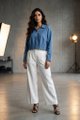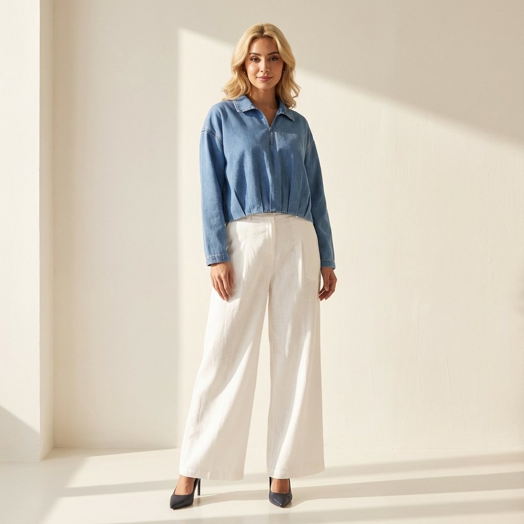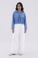Refresh your denims. Cut from softly structured cotton denim, this top features a collared neckline with a front loop button, long sleeves and a pleated hem. Worn in a relaxed fit.