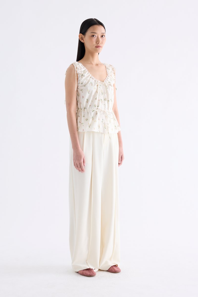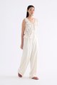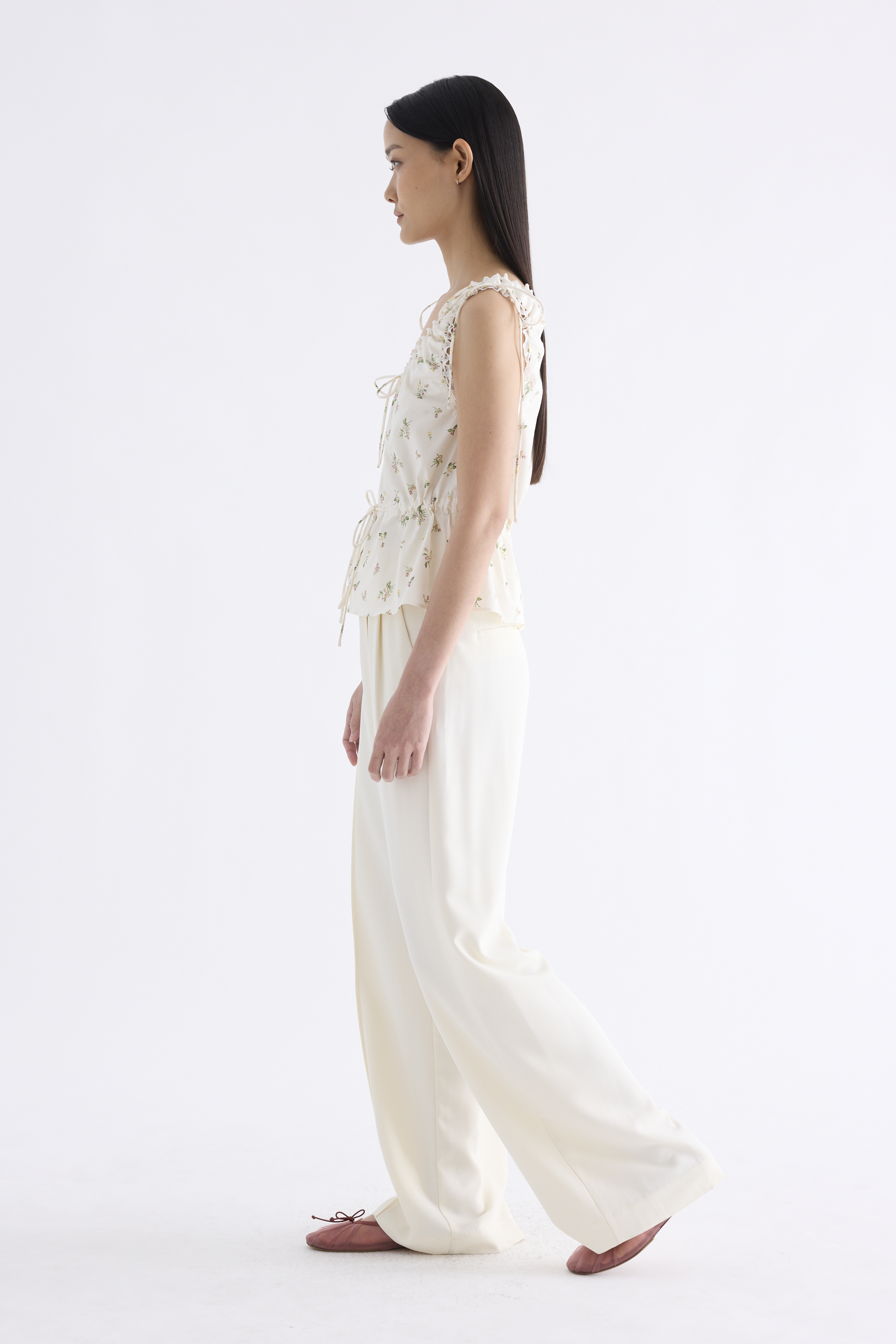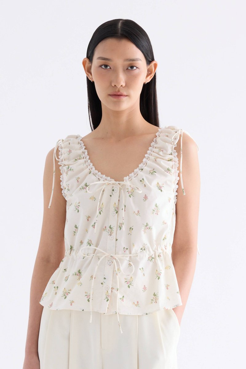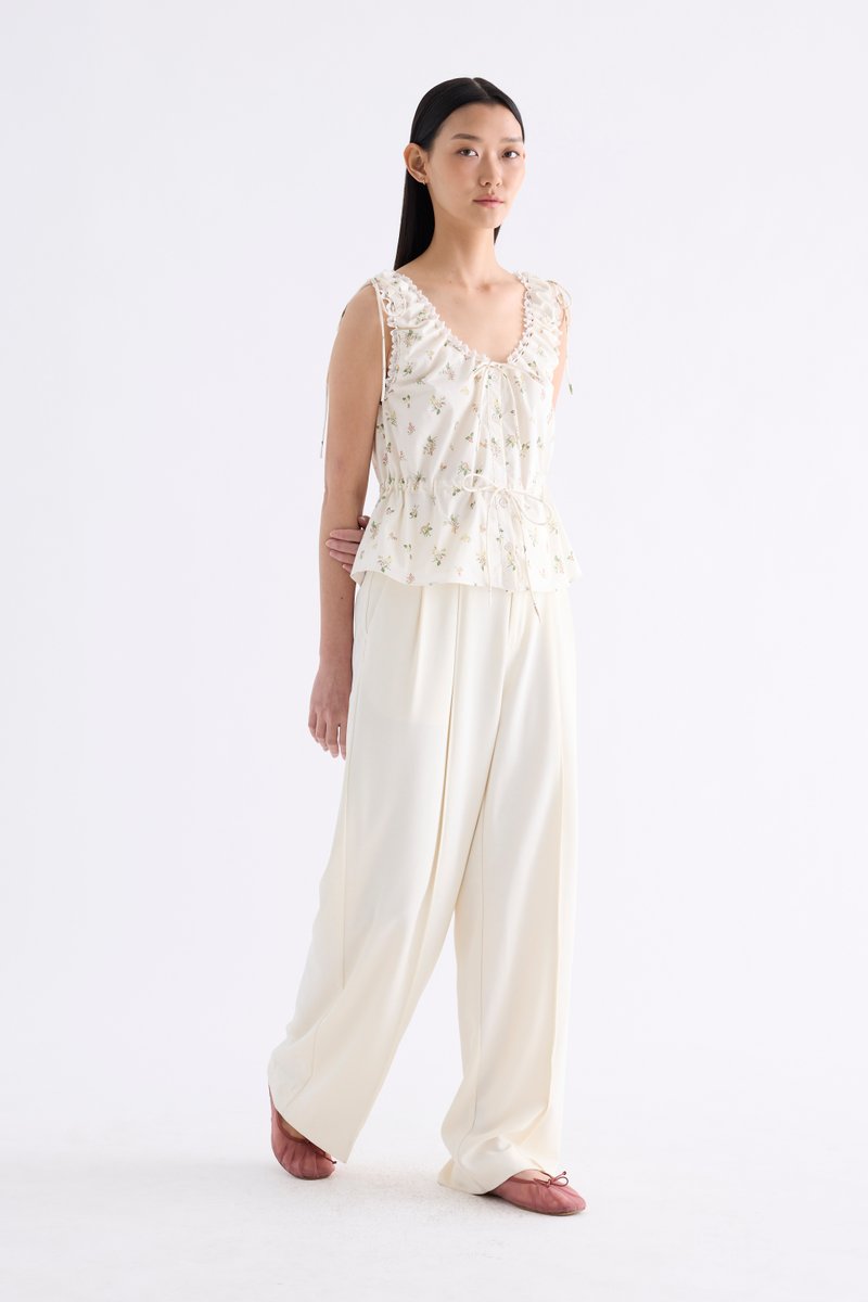 From the Postscript collection. This sleeveless top features a lace-trimmed, drawstring neckline with a front tie-strap, drawstring arm openings with shoulder tie-straps, as well as a button-down front. Its fit is adjustable via a drawstring waist tie.