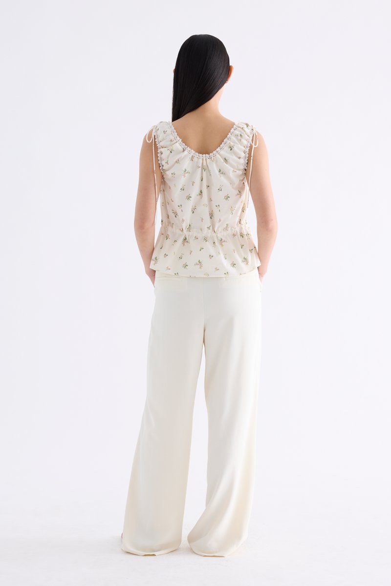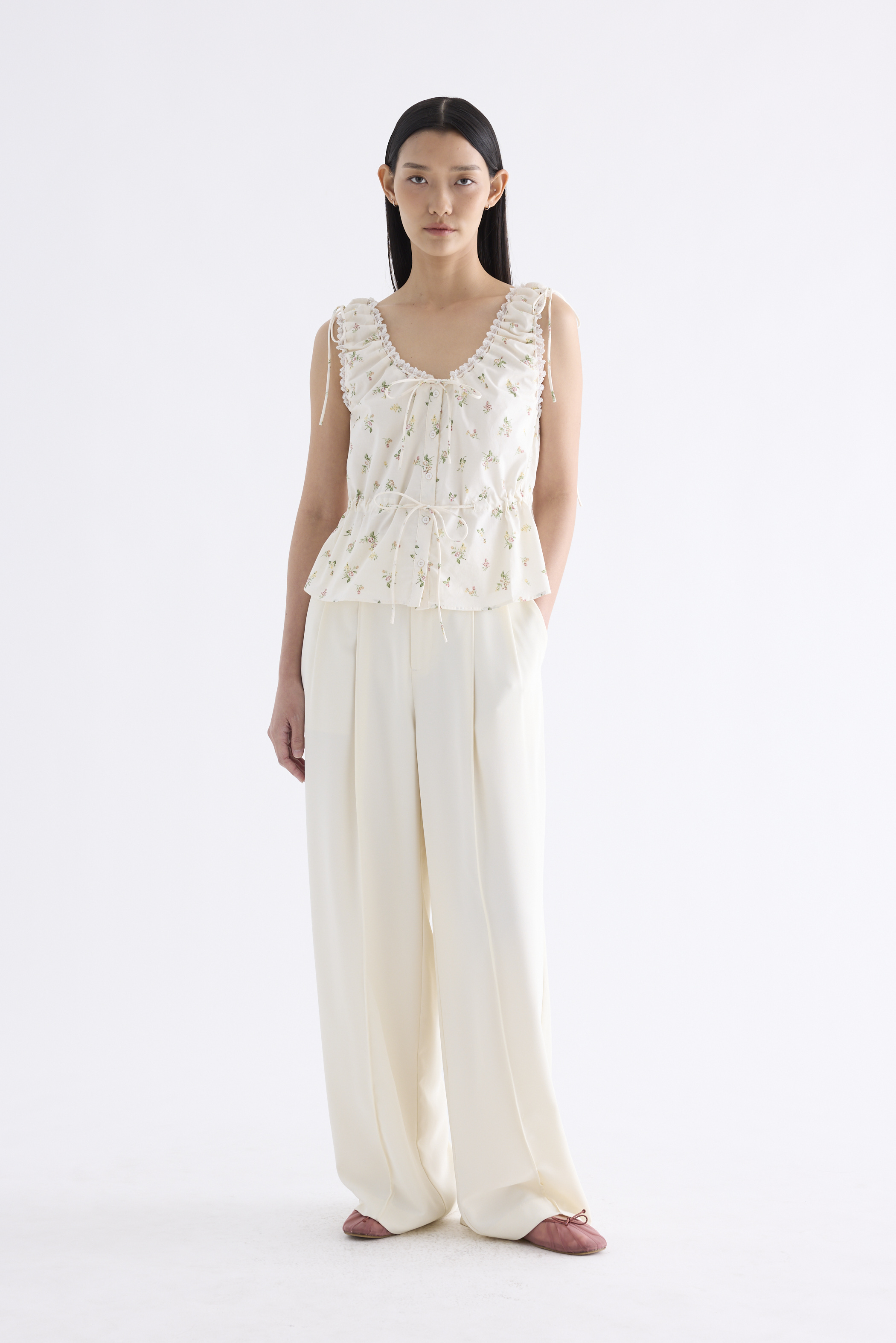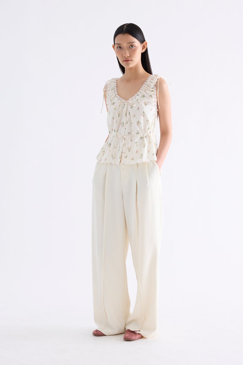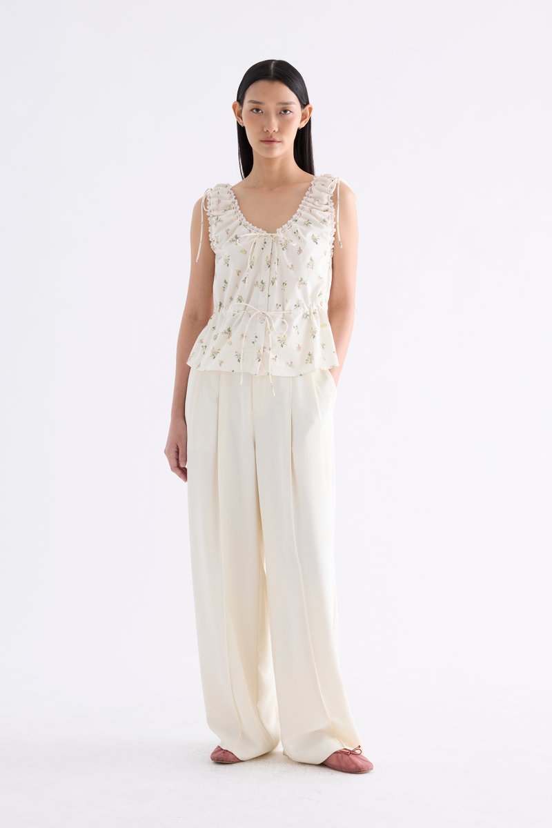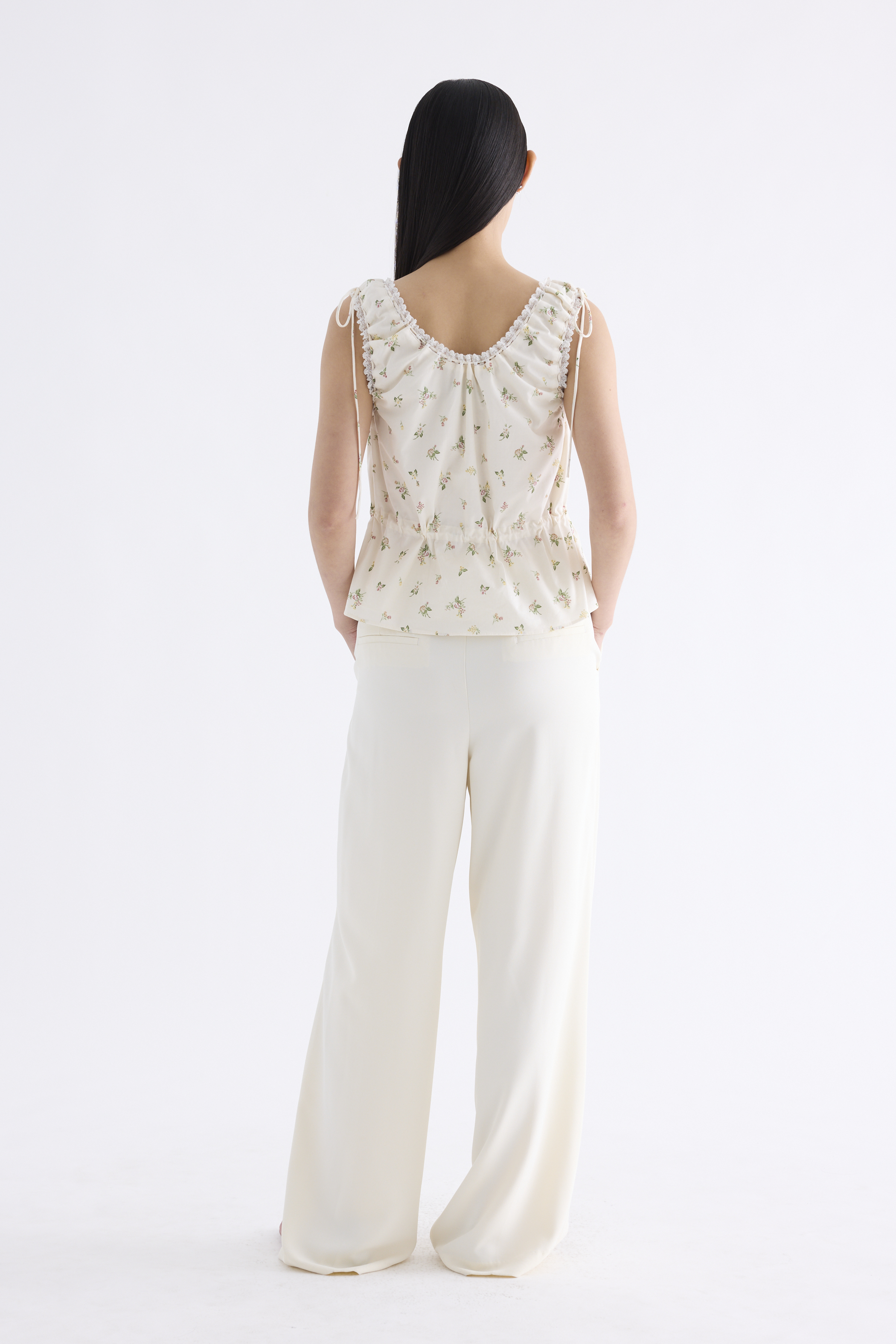From the Postscript collection. This sleeveless top features a lace-trimmed, drawstring neckline with a front tie-strap, drawstring arm openings with shoulder tie-straps, as well as a button-down front. Its fit is adjustable via a drawstring waist tie.