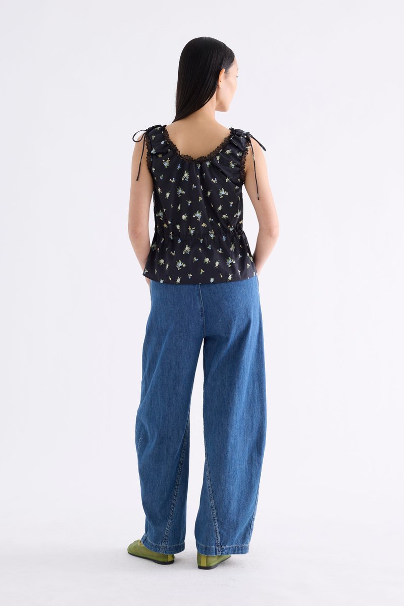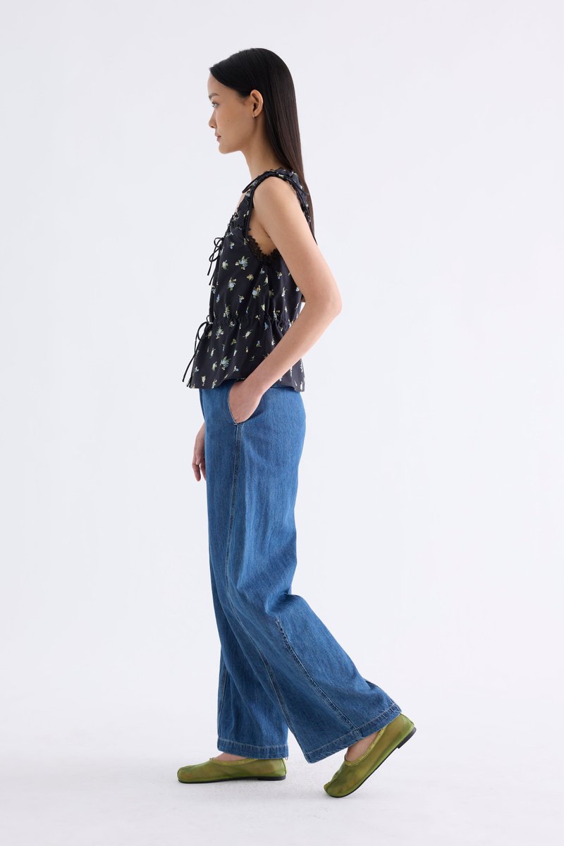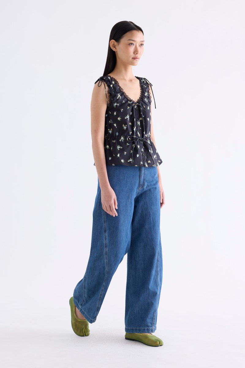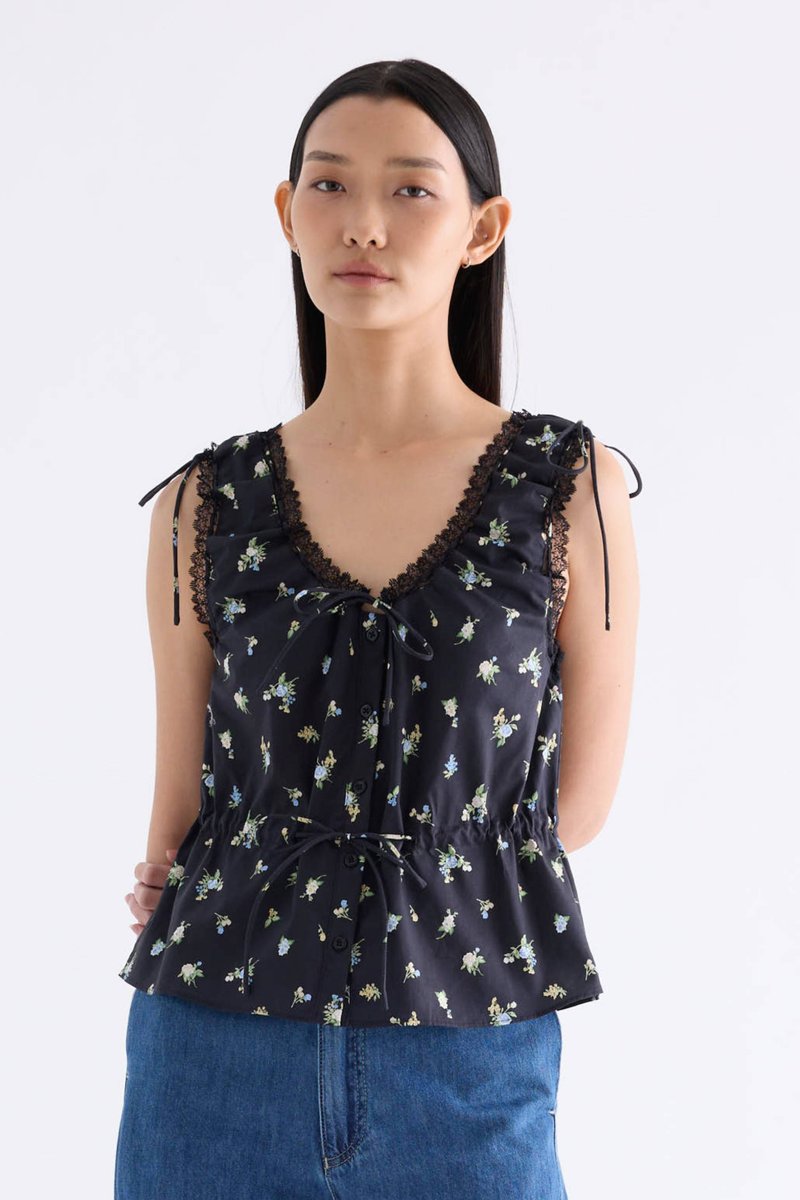 From the Postscript collection. This sleeveless top features a lace-trimmed, drawstring neckline with a front tie-strap, drawstring arm openings with shoulder tie-straps, as well as a button-down front. Its fit is adjustable via a drawstring waist tie.