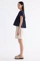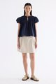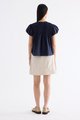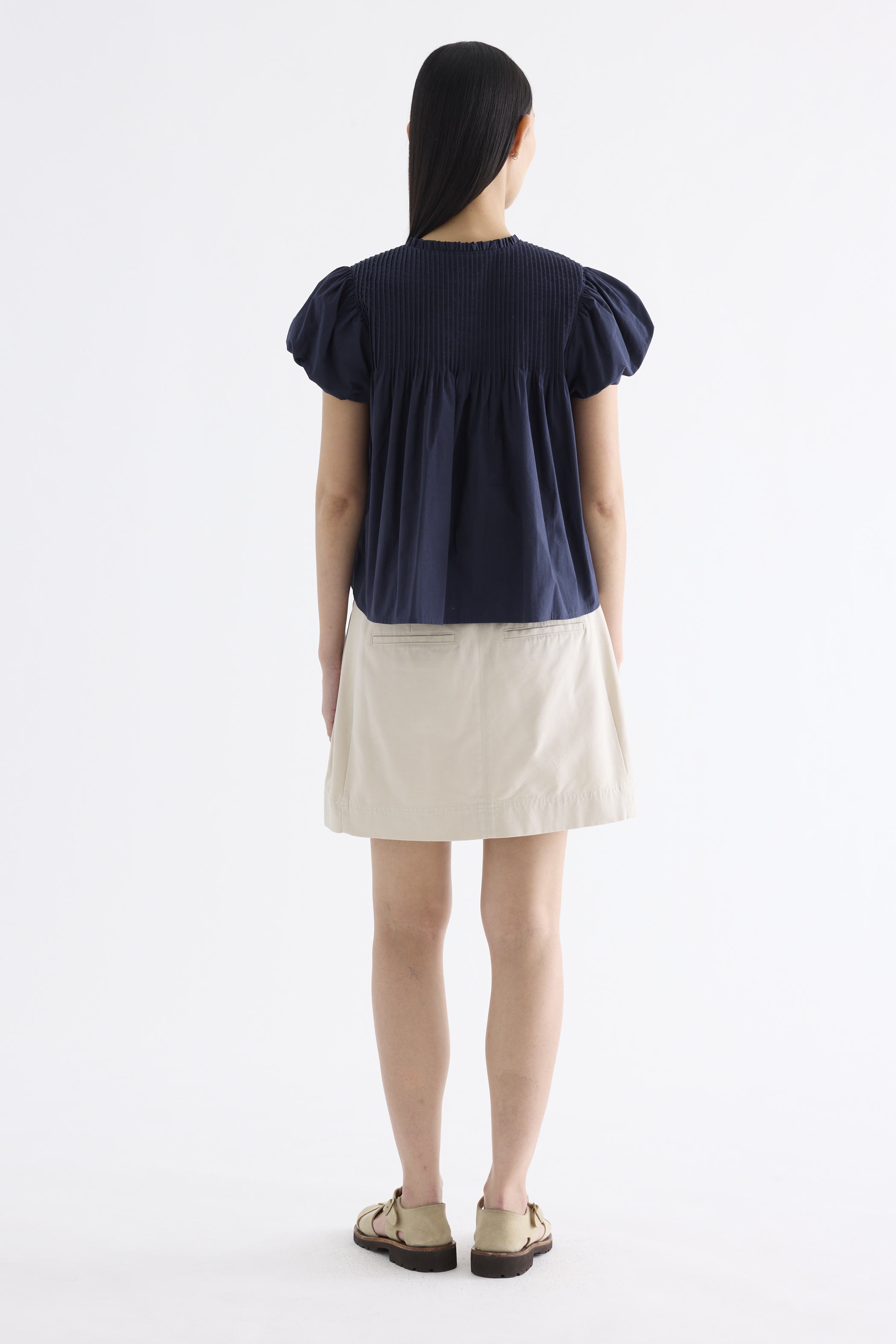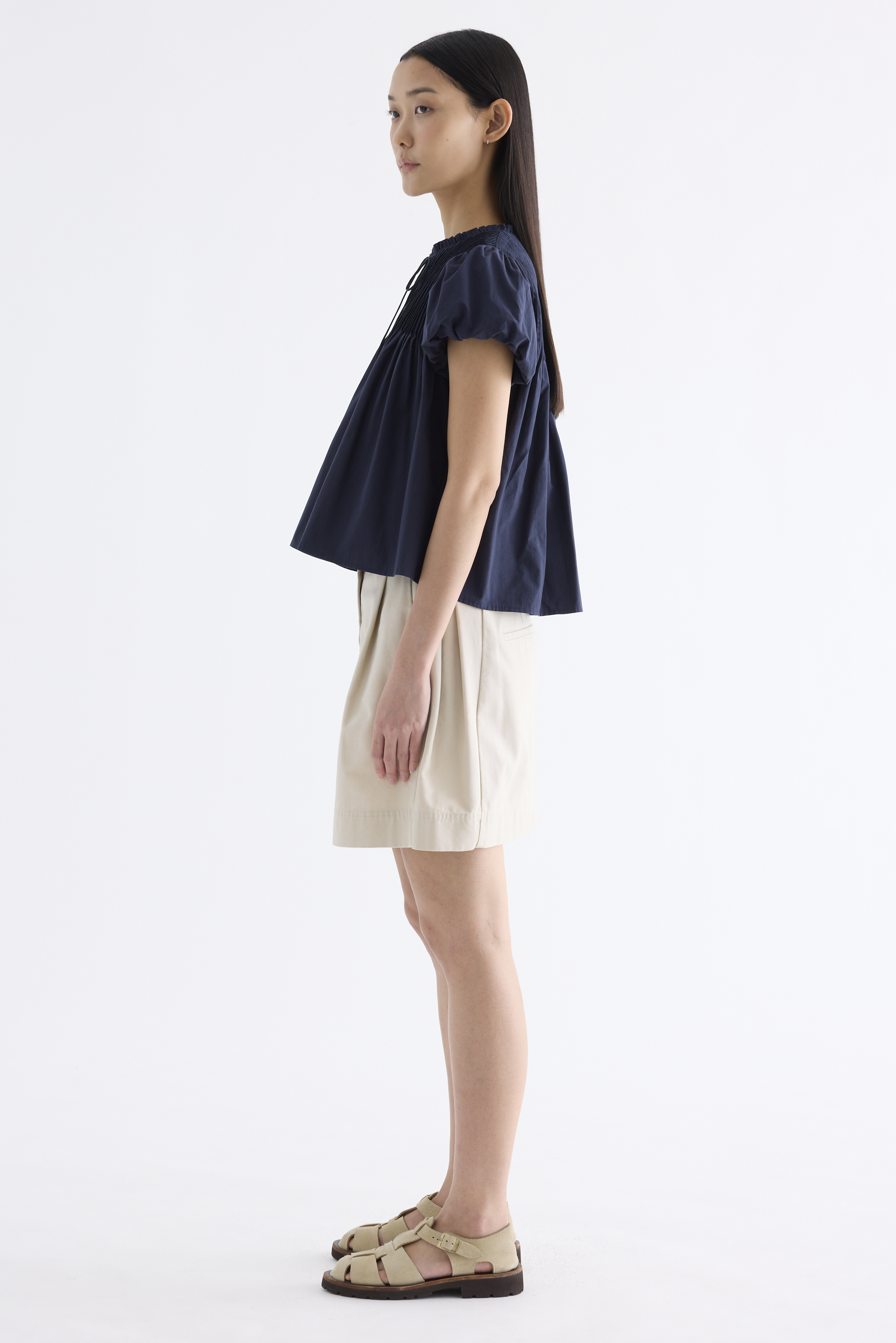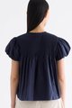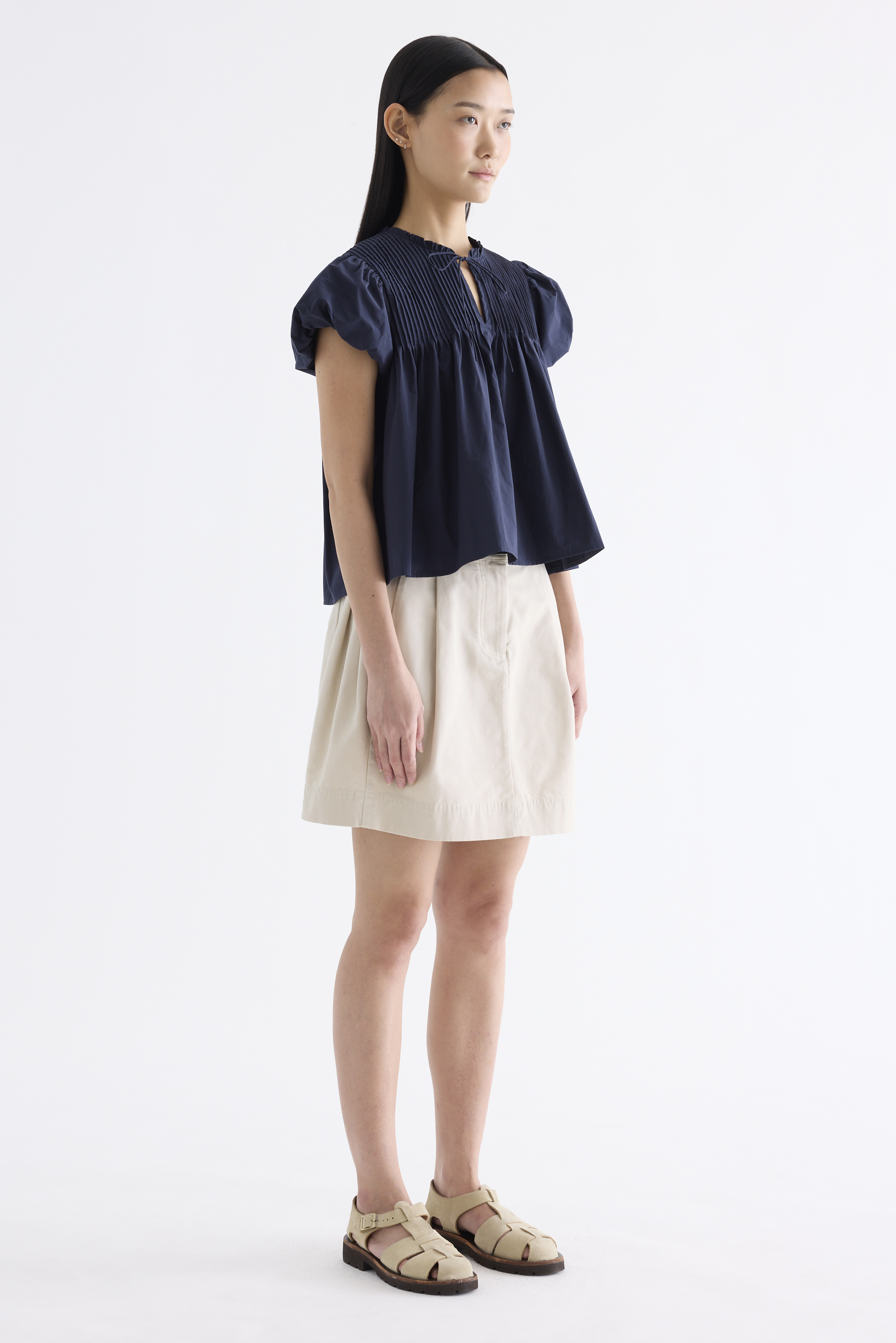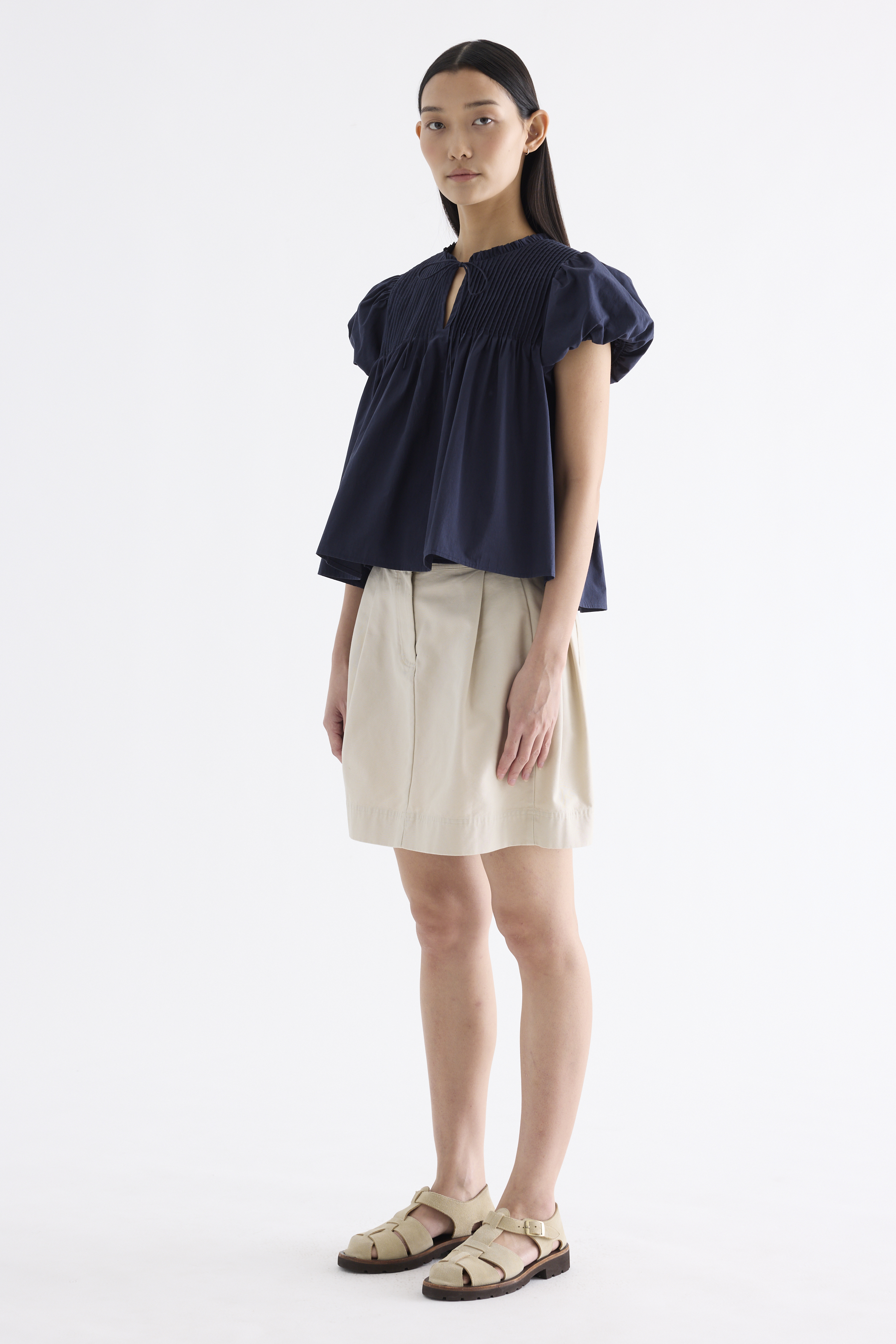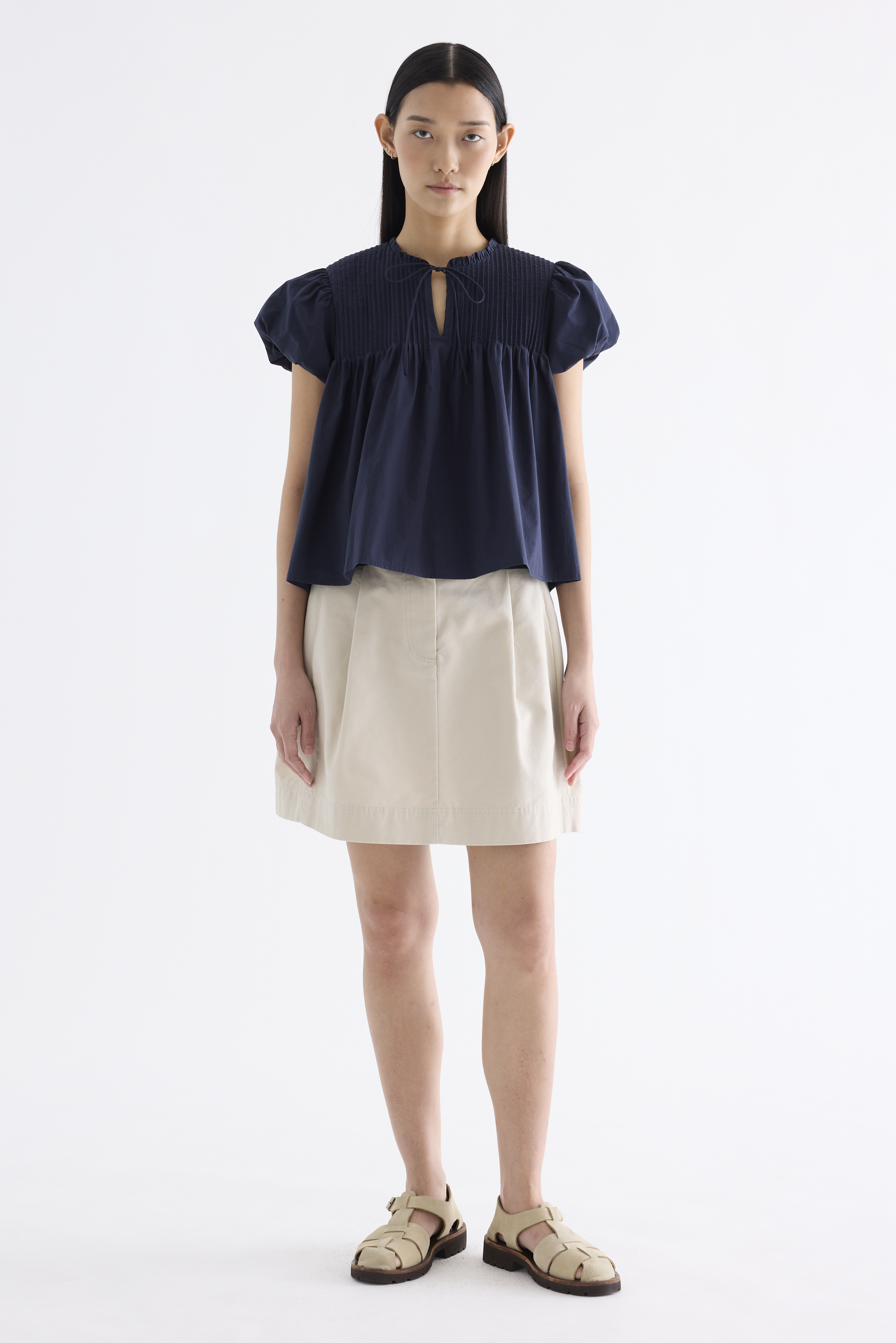Here for the flare. Cut from crisp and softly structured cotton, this top features a frill-trimmed neckline, front opening with tie-strap, pin-tuck pleats and elasticated puffy sleeves. Worn in a relaxed swing silhouette.