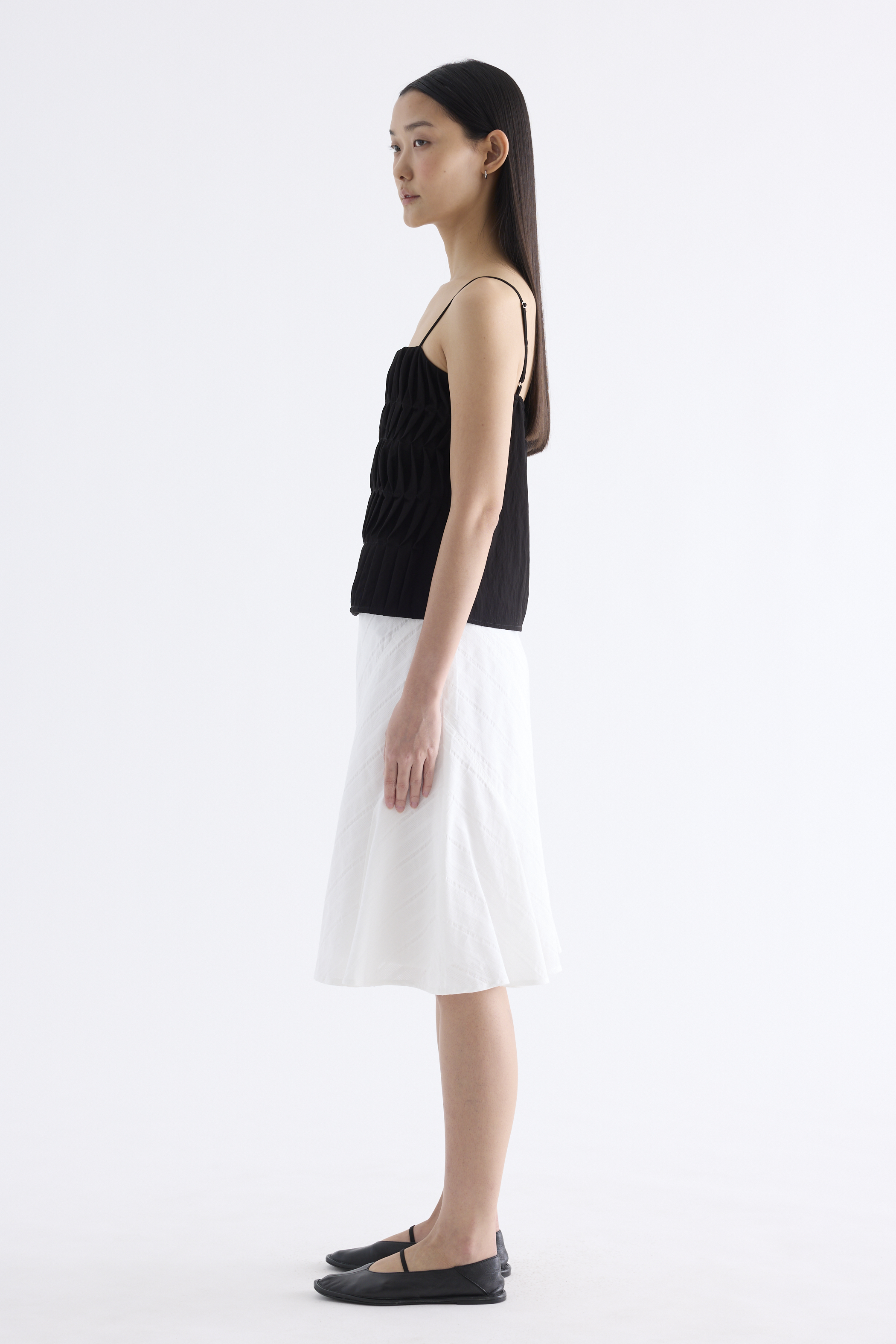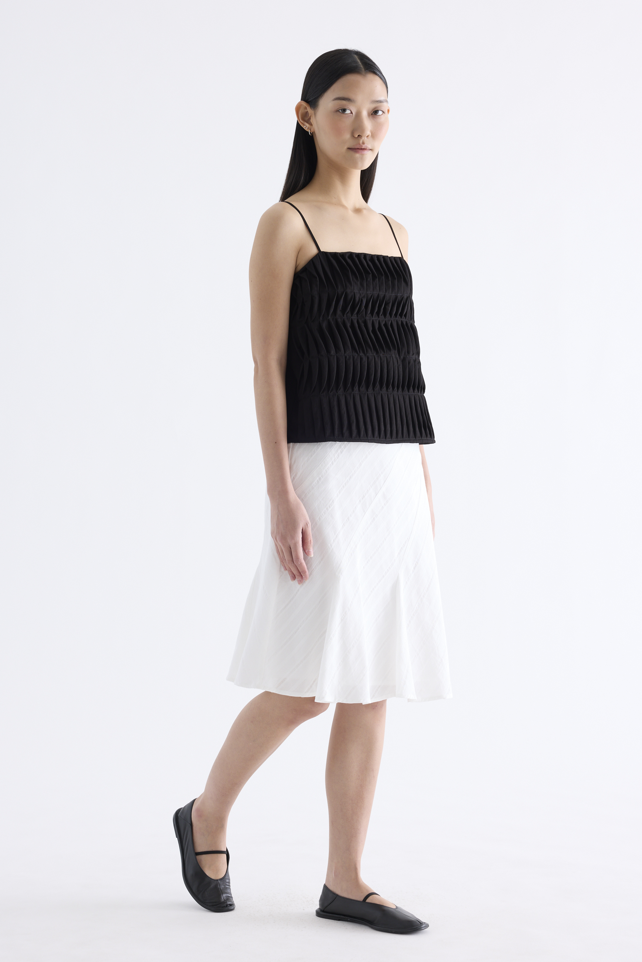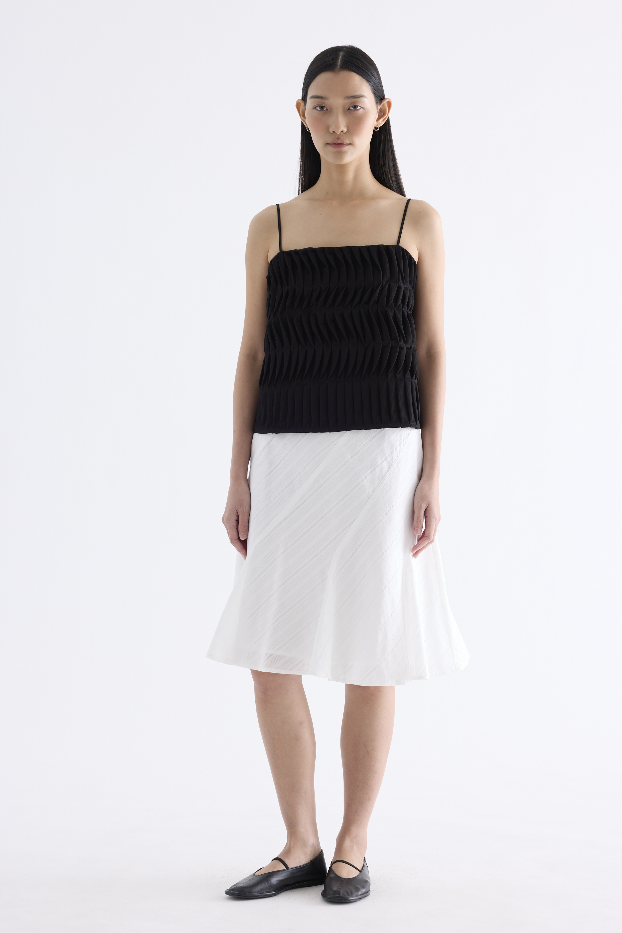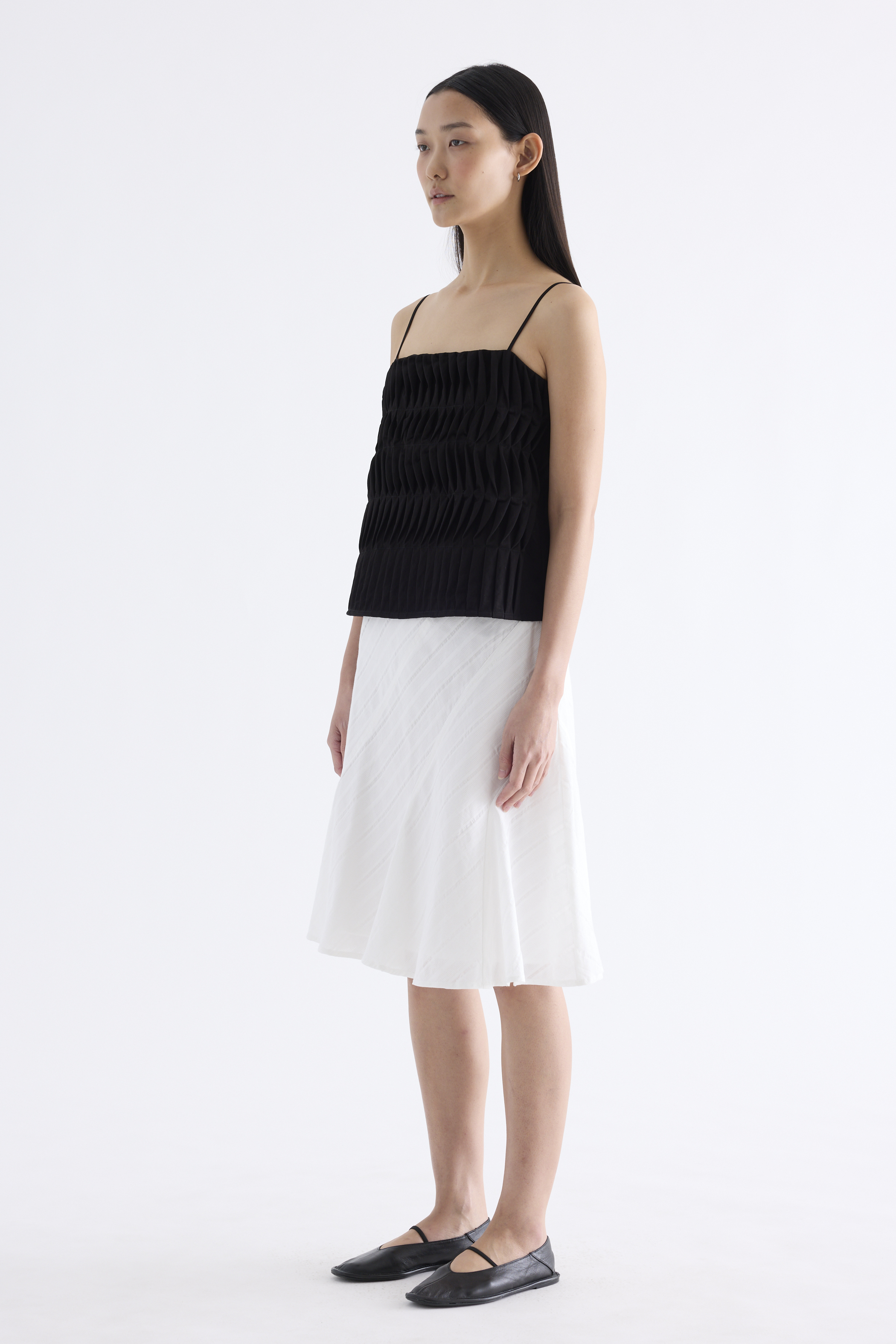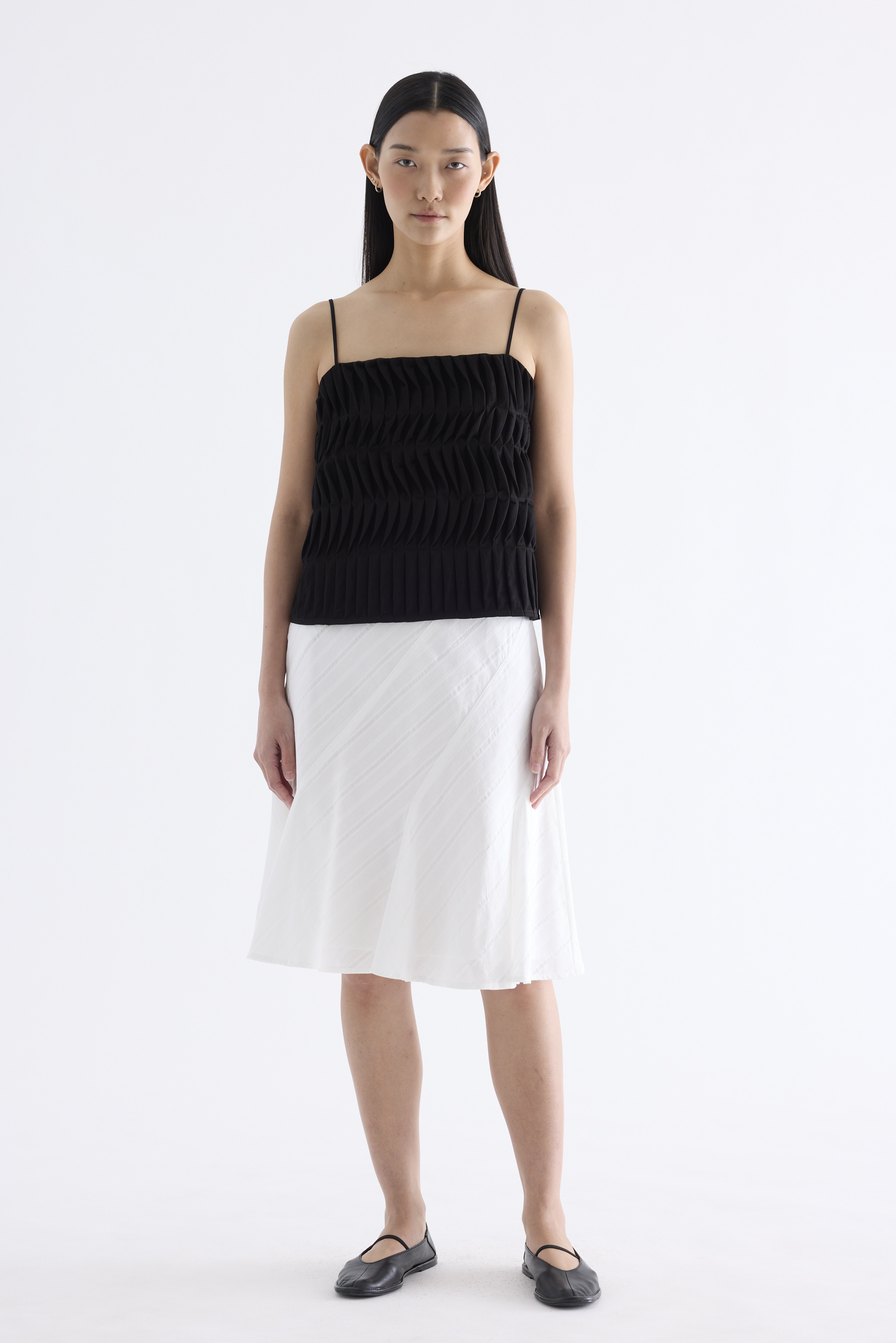Statement lines. Made from softly structured fabric, this sleeveless top features twisted pleats at the front, slim adjustable shoulder straps, a straight neckline and a partially elasticated back. Worn in a slim fit.