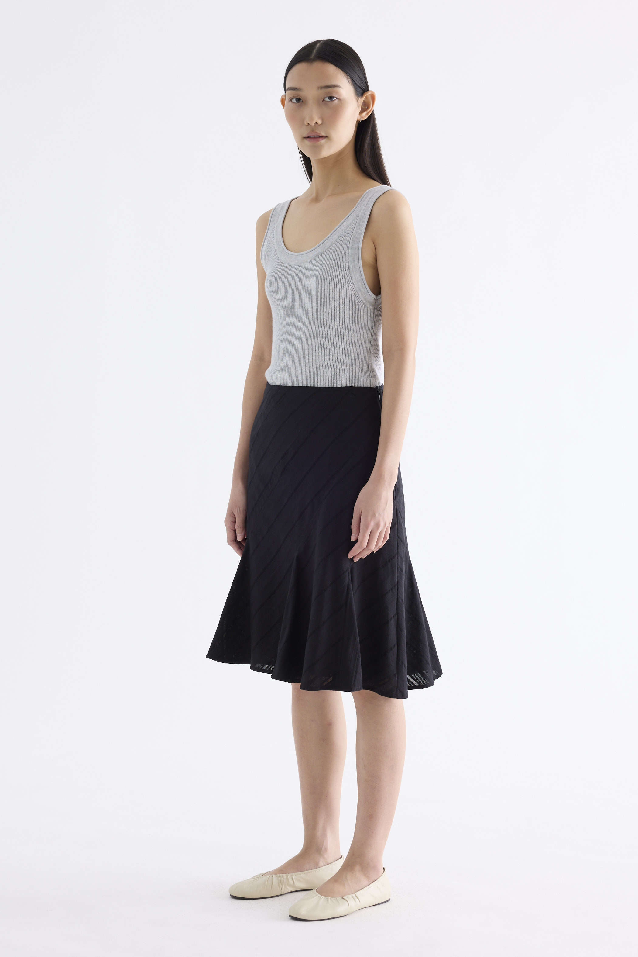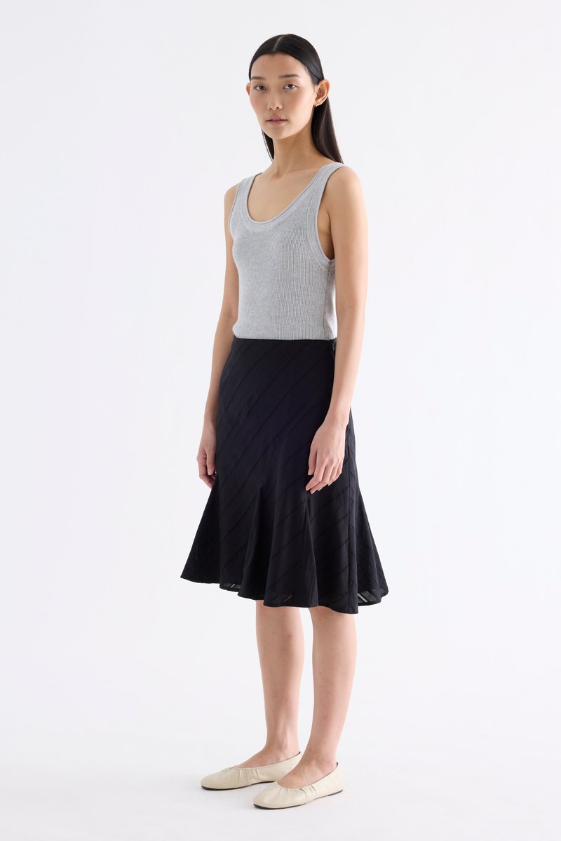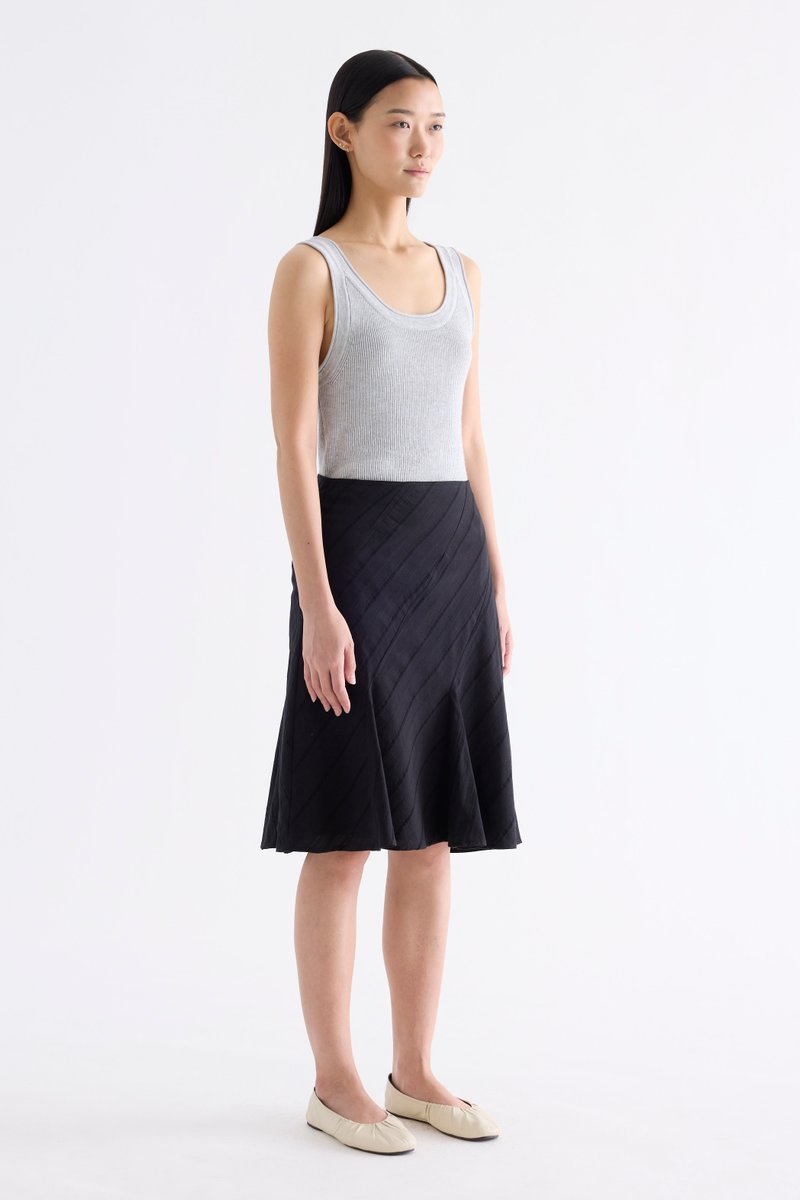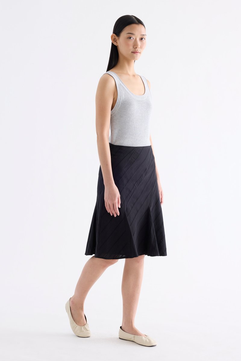 Textural. Made from airy and striped cotton, this knee-length skirt features a flared hem and side zip closure. Fits slim in an A-line silhouette.