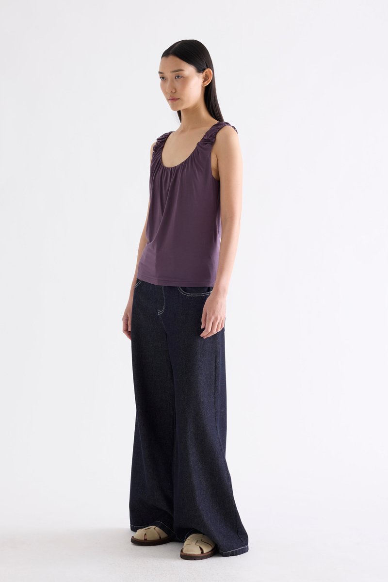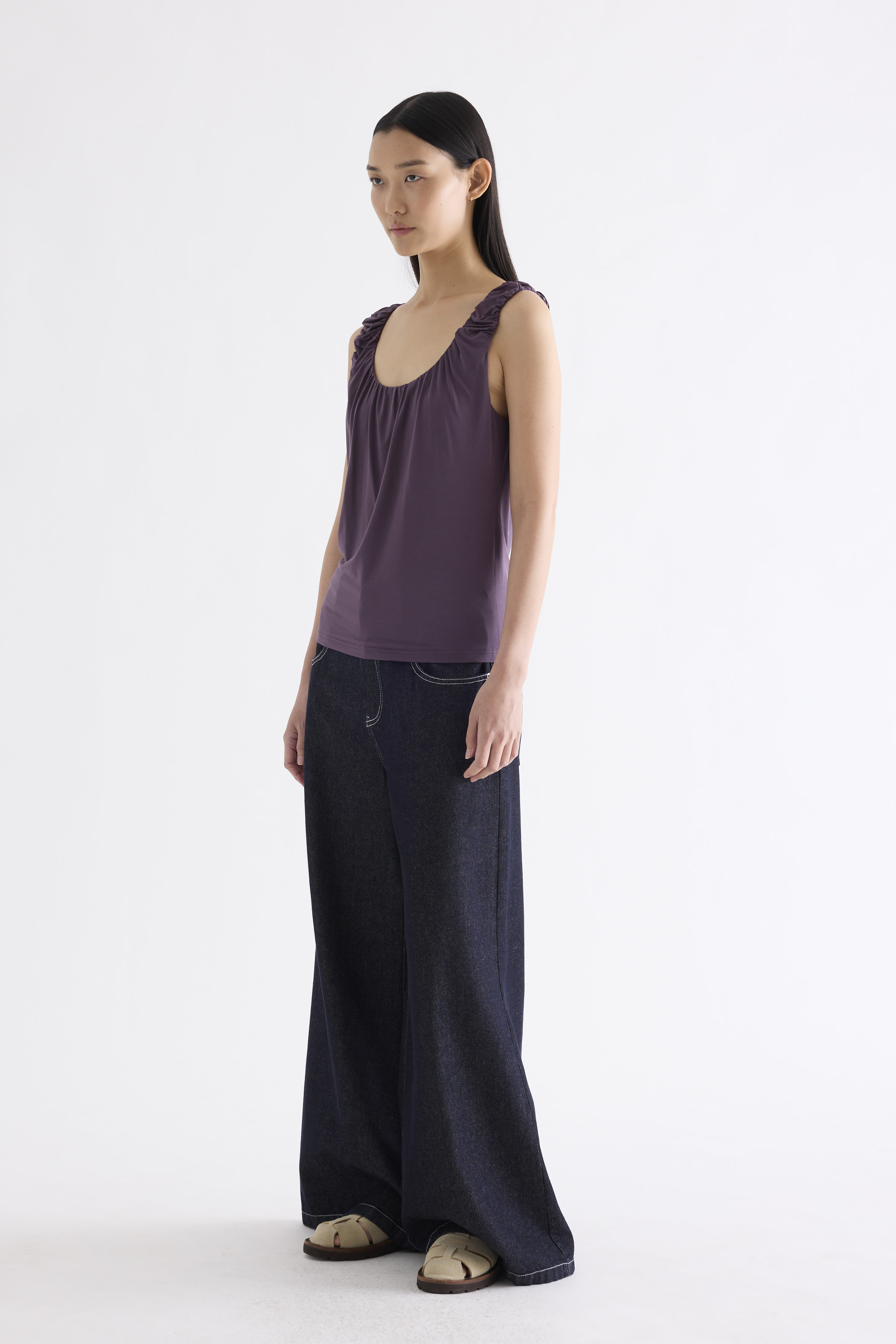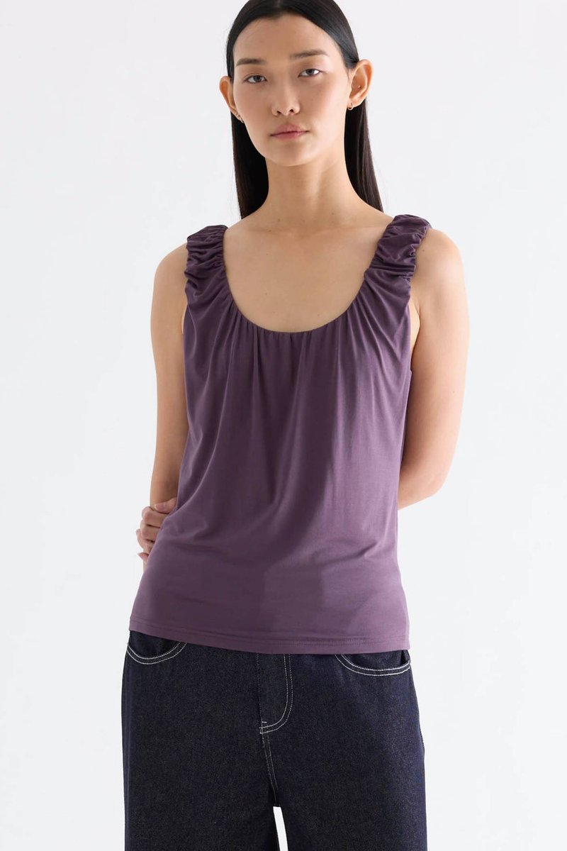 For the love of textures. Made from smooth and stretchy fabric, this sleeveless top features a U-shaped neckline and ruched shoulder straps. Worn in a slim fit.