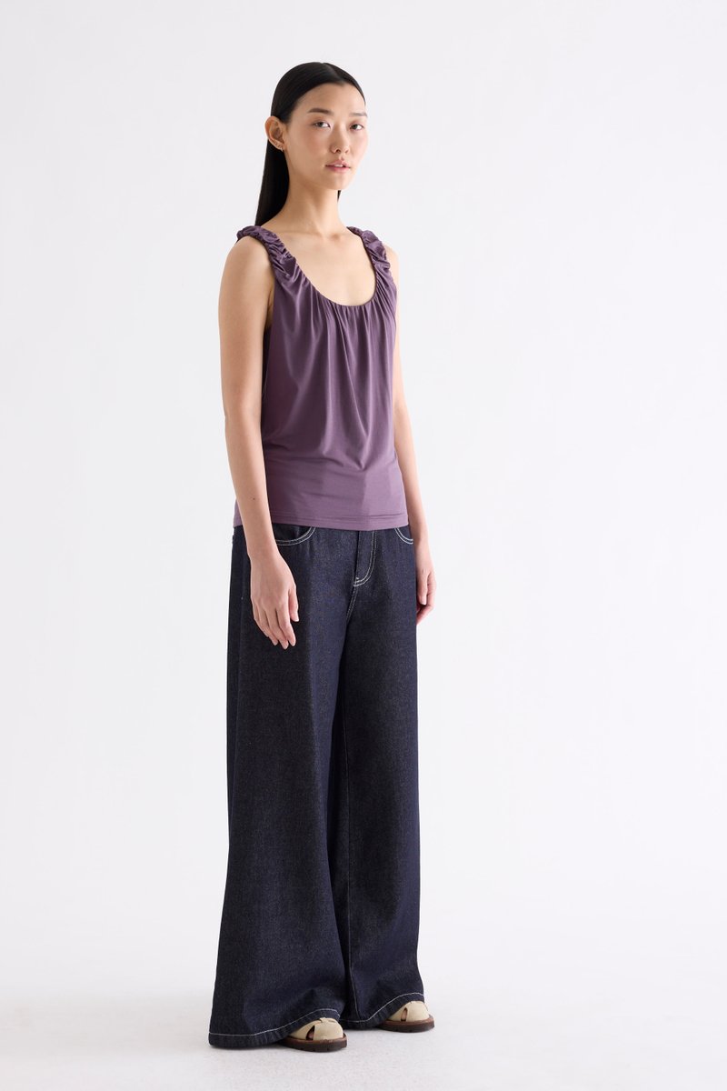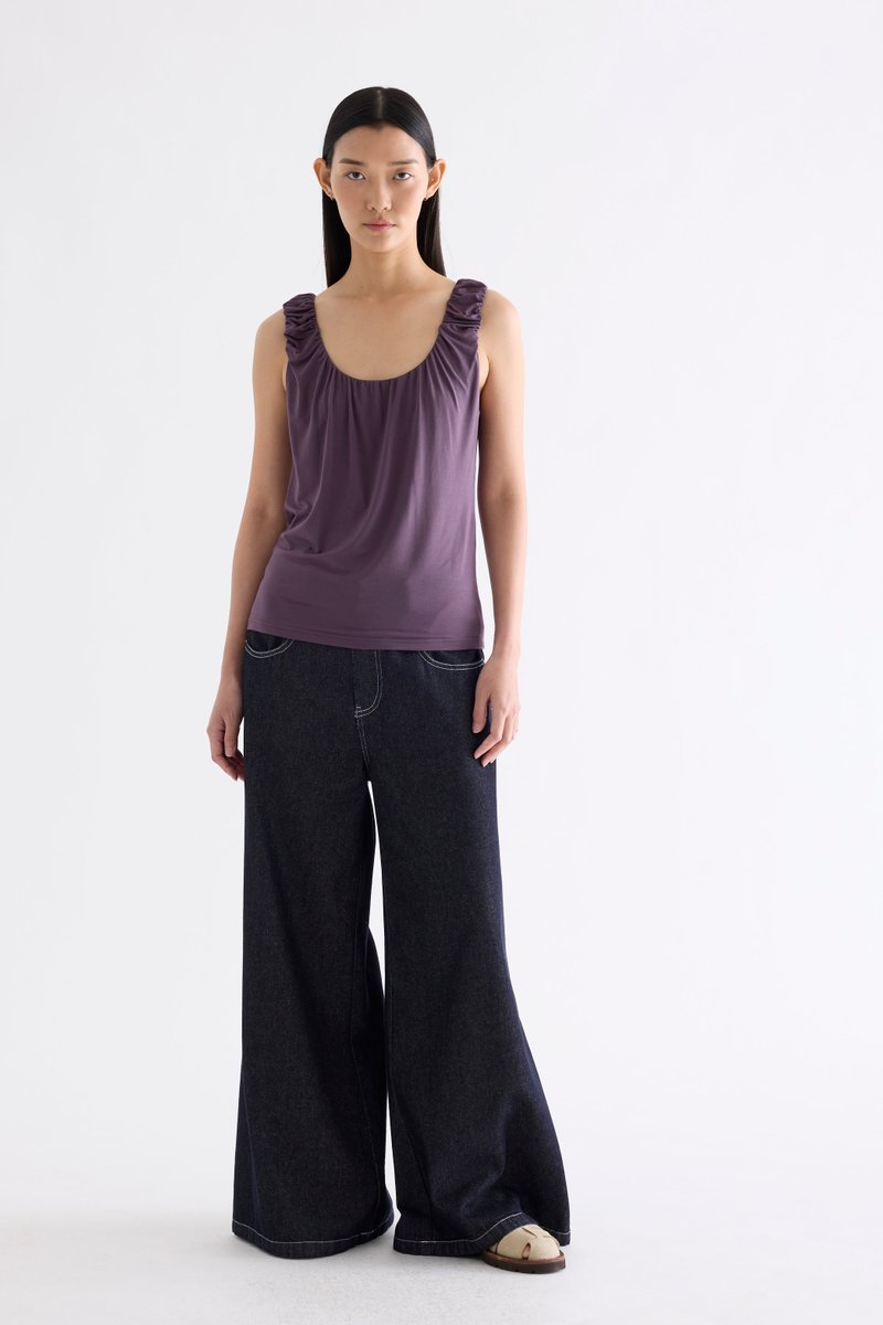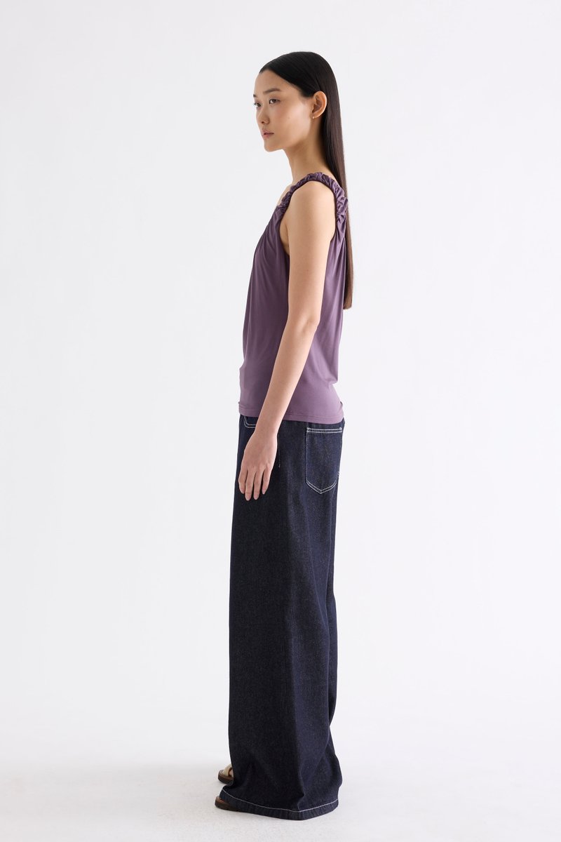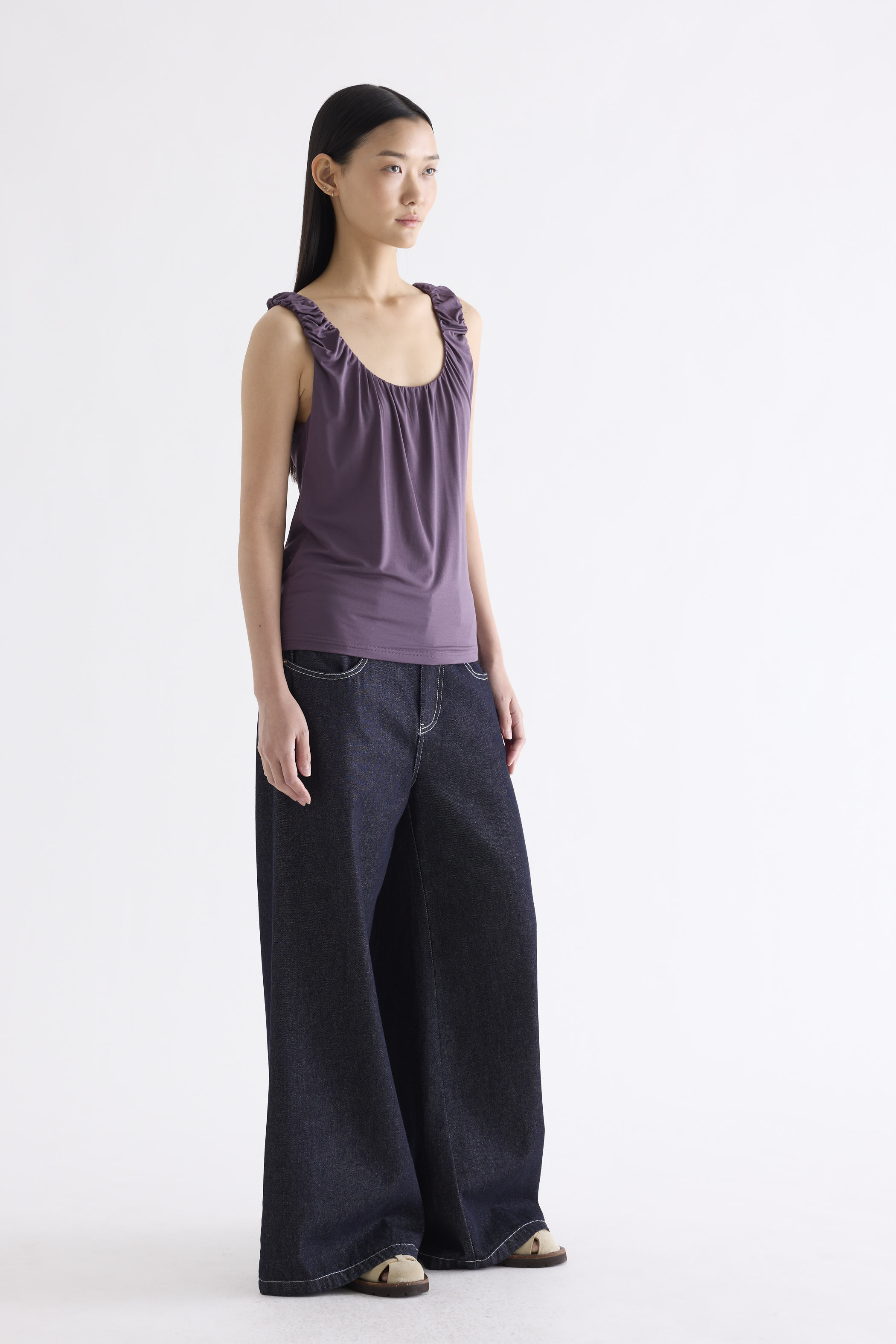 For the love of textures. Made from smooth and stretchy fabric, this sleeveless top features a U-shaped neckline and ruched shoulder straps. Worn in a slim fit.