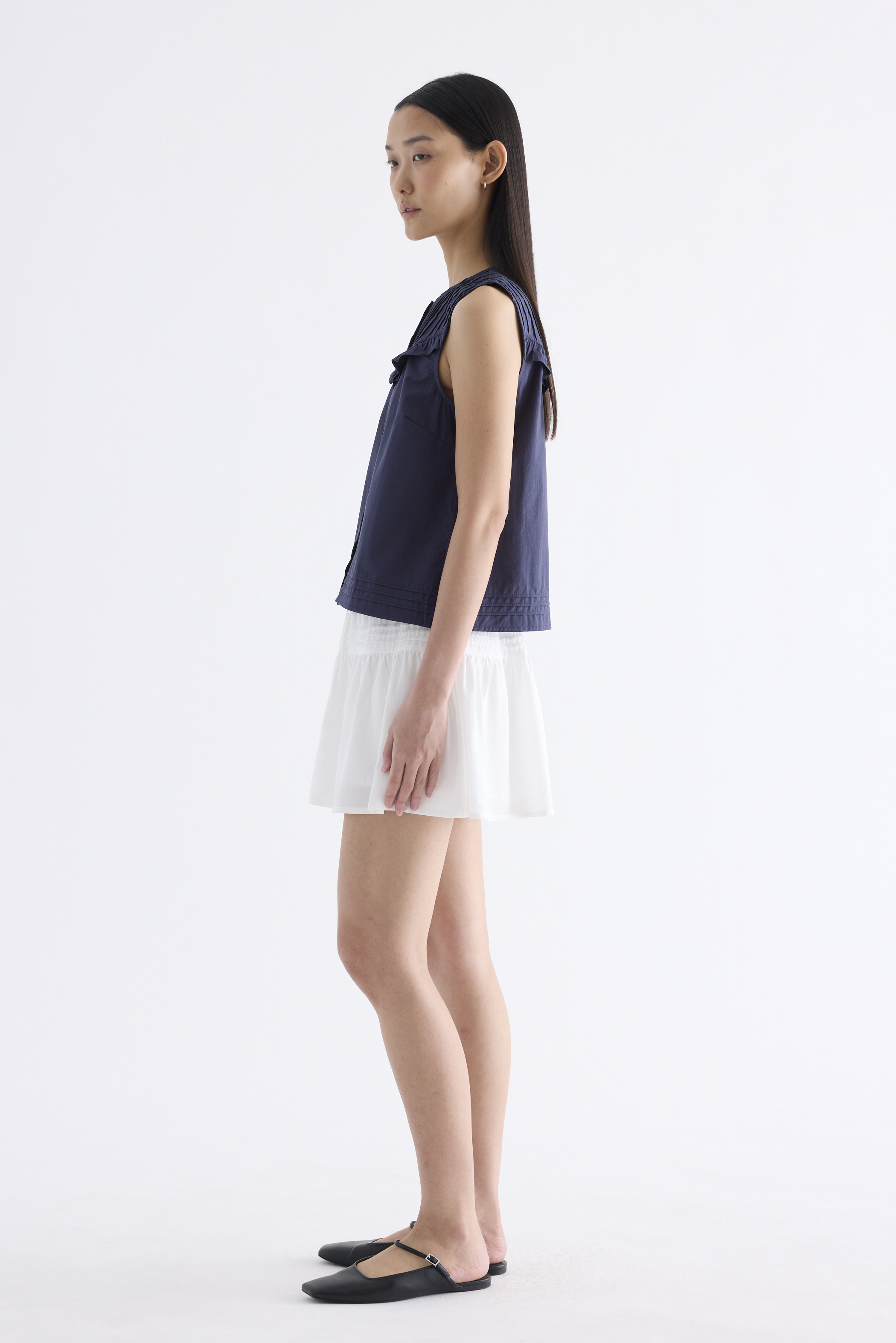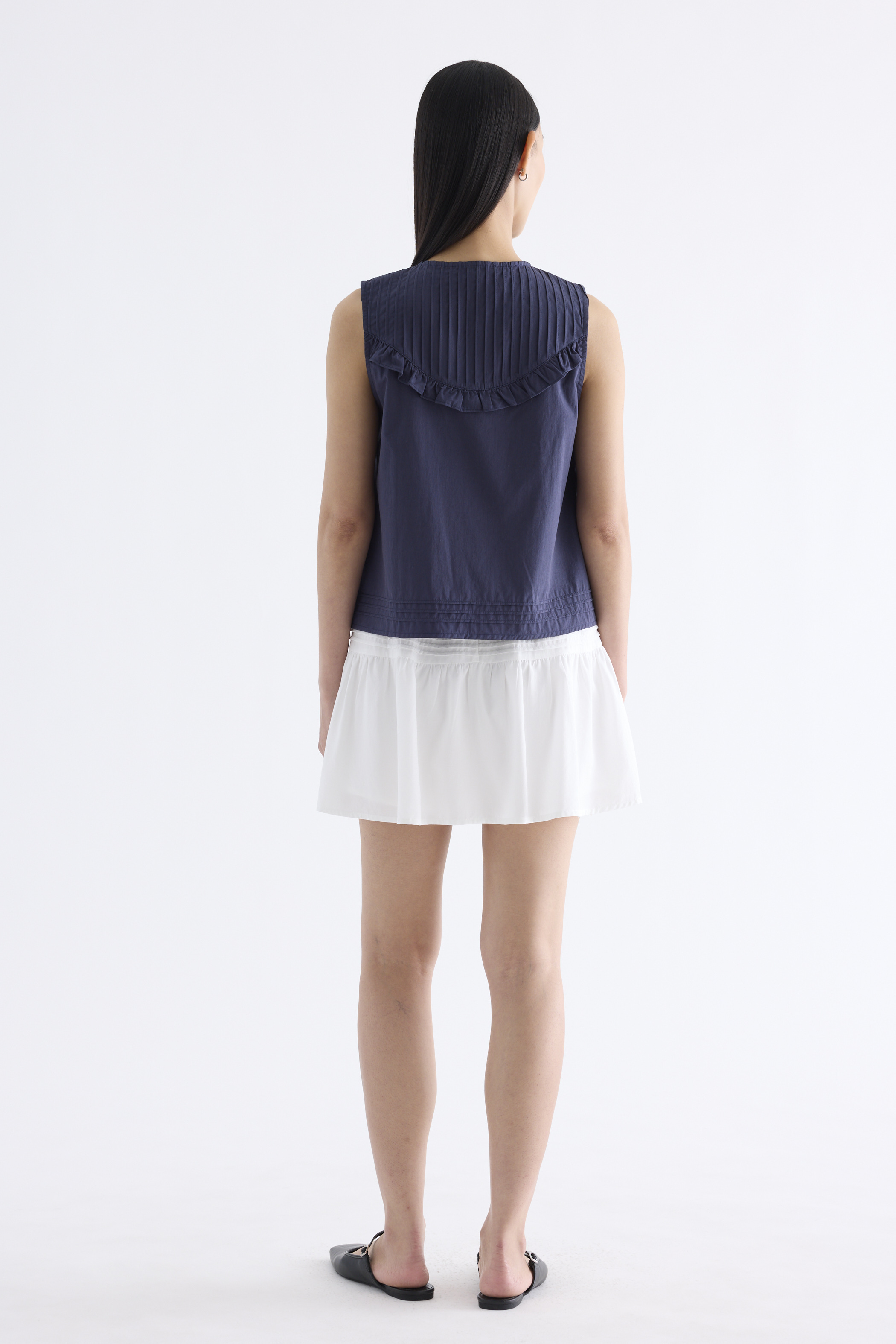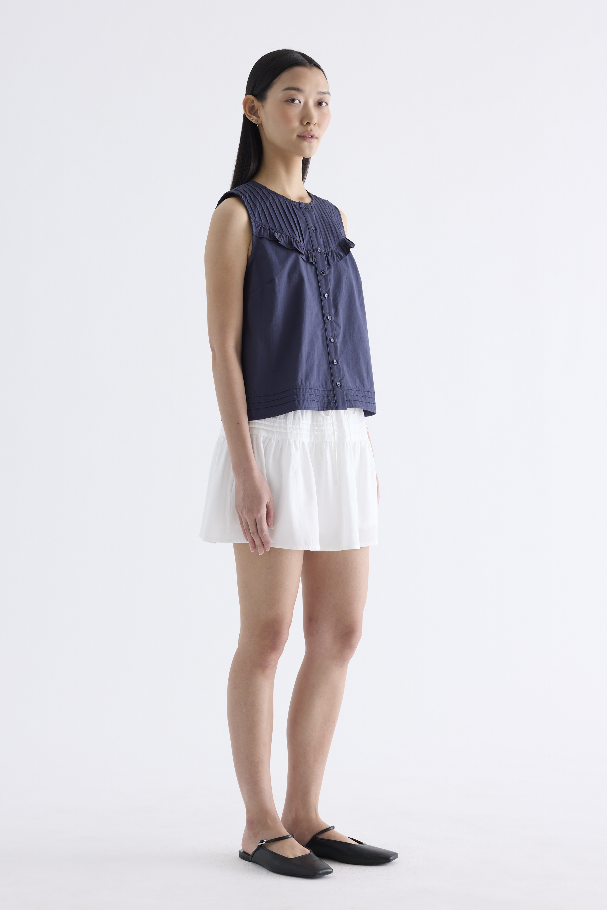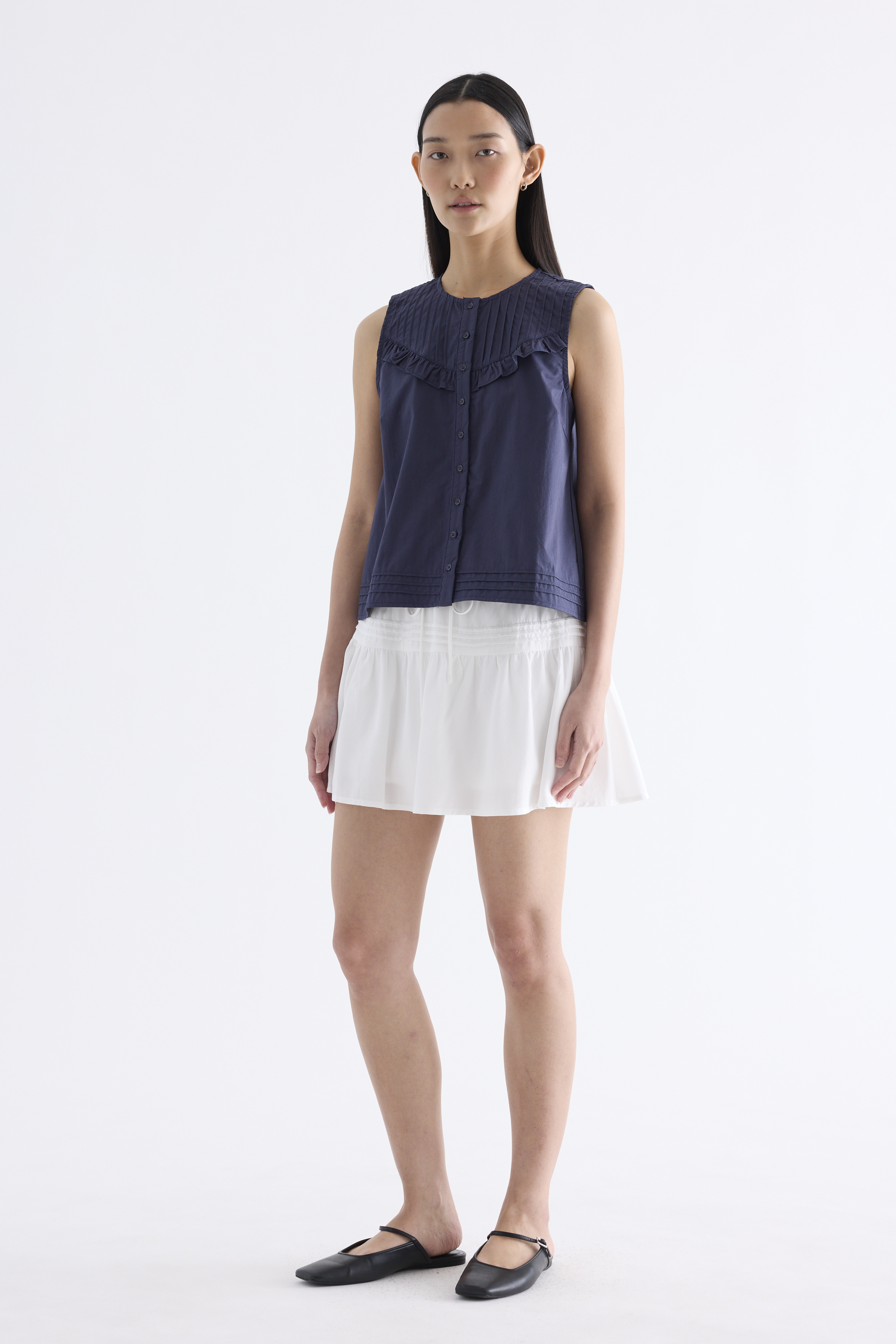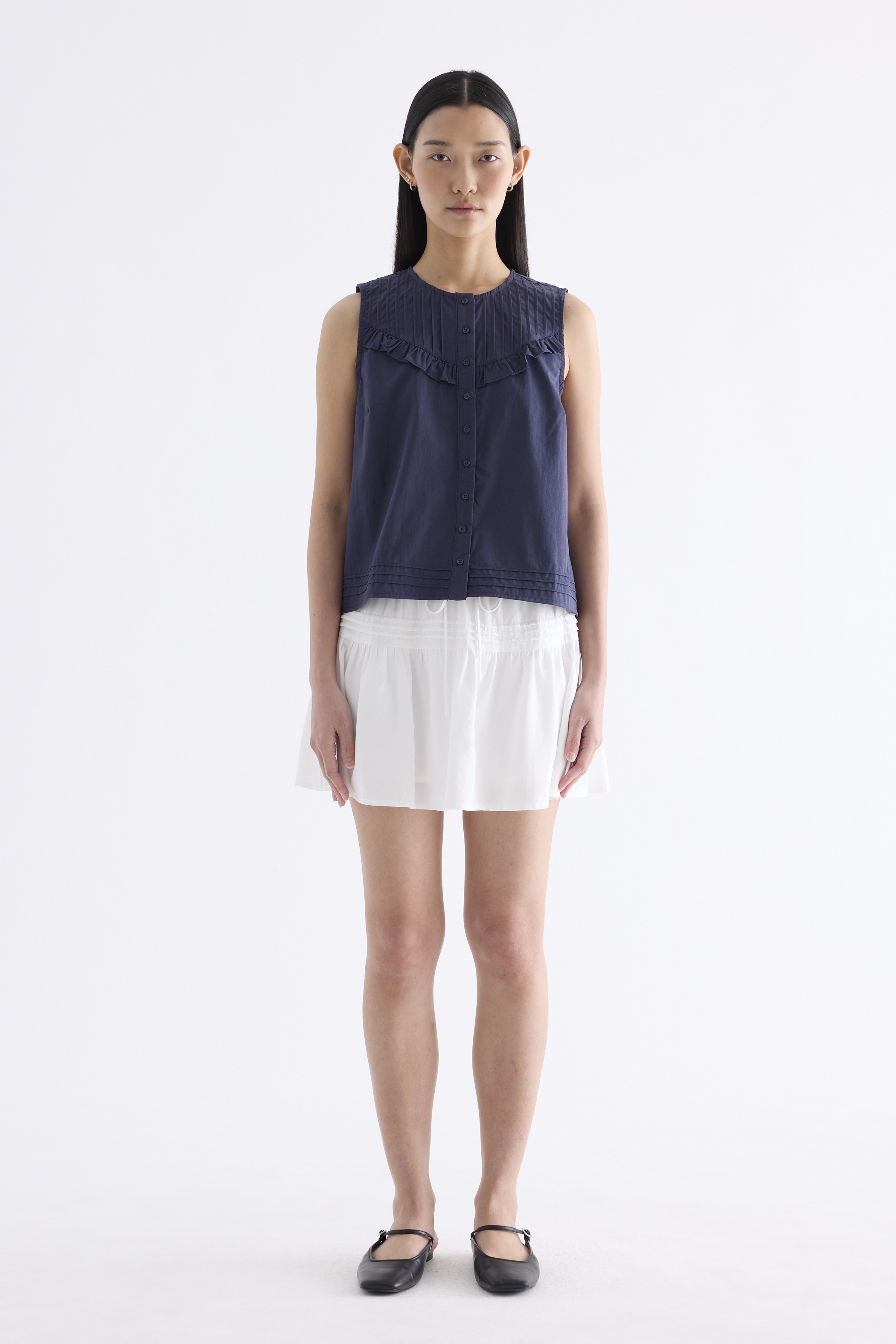 Tailored and textured. Cut from crisp and softly structured cotton, this sleeveless top features a pleated, frill-trimmed yoke, round neckline, button-down front and pleated hem. Worn in a relaxed, boxy fit.