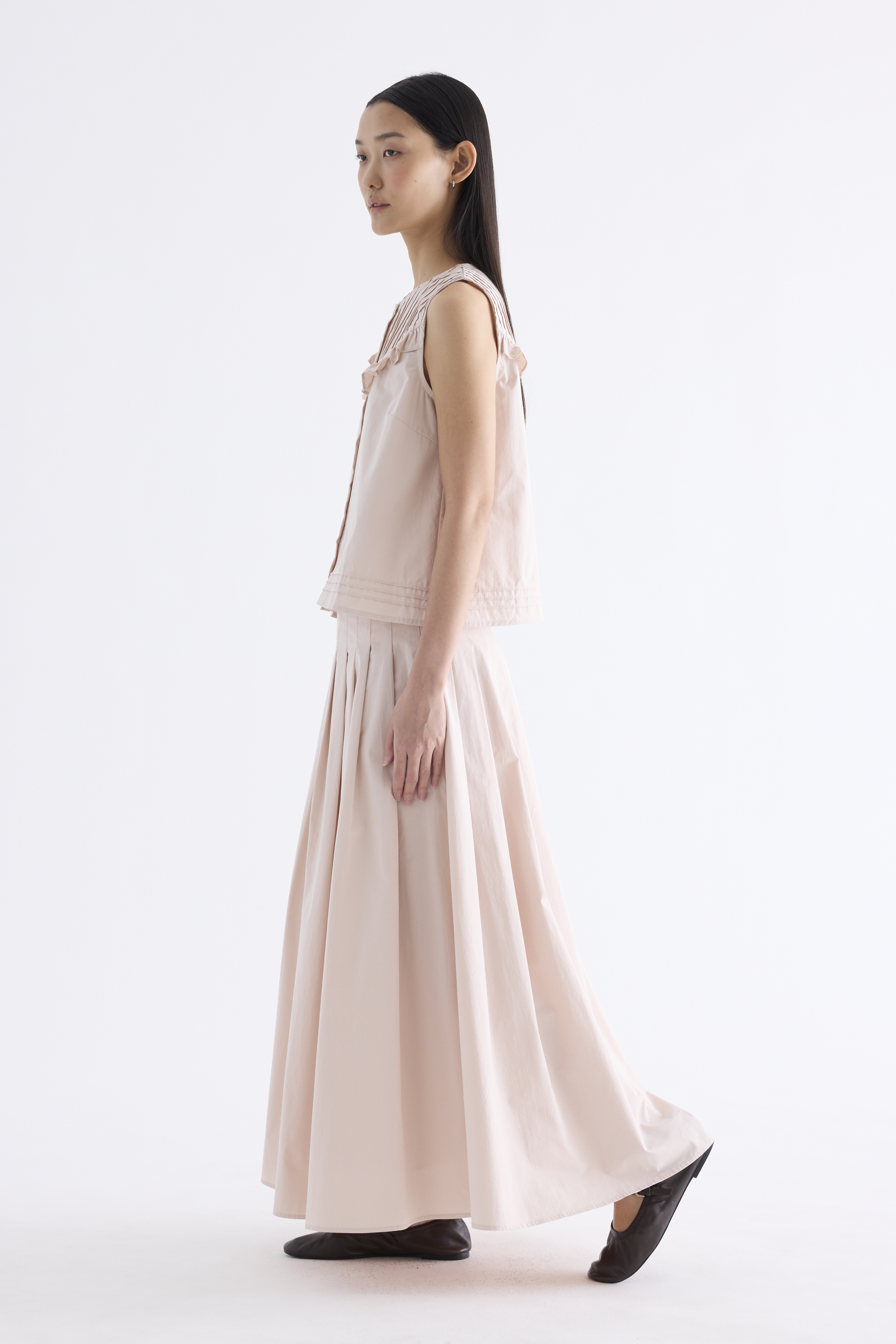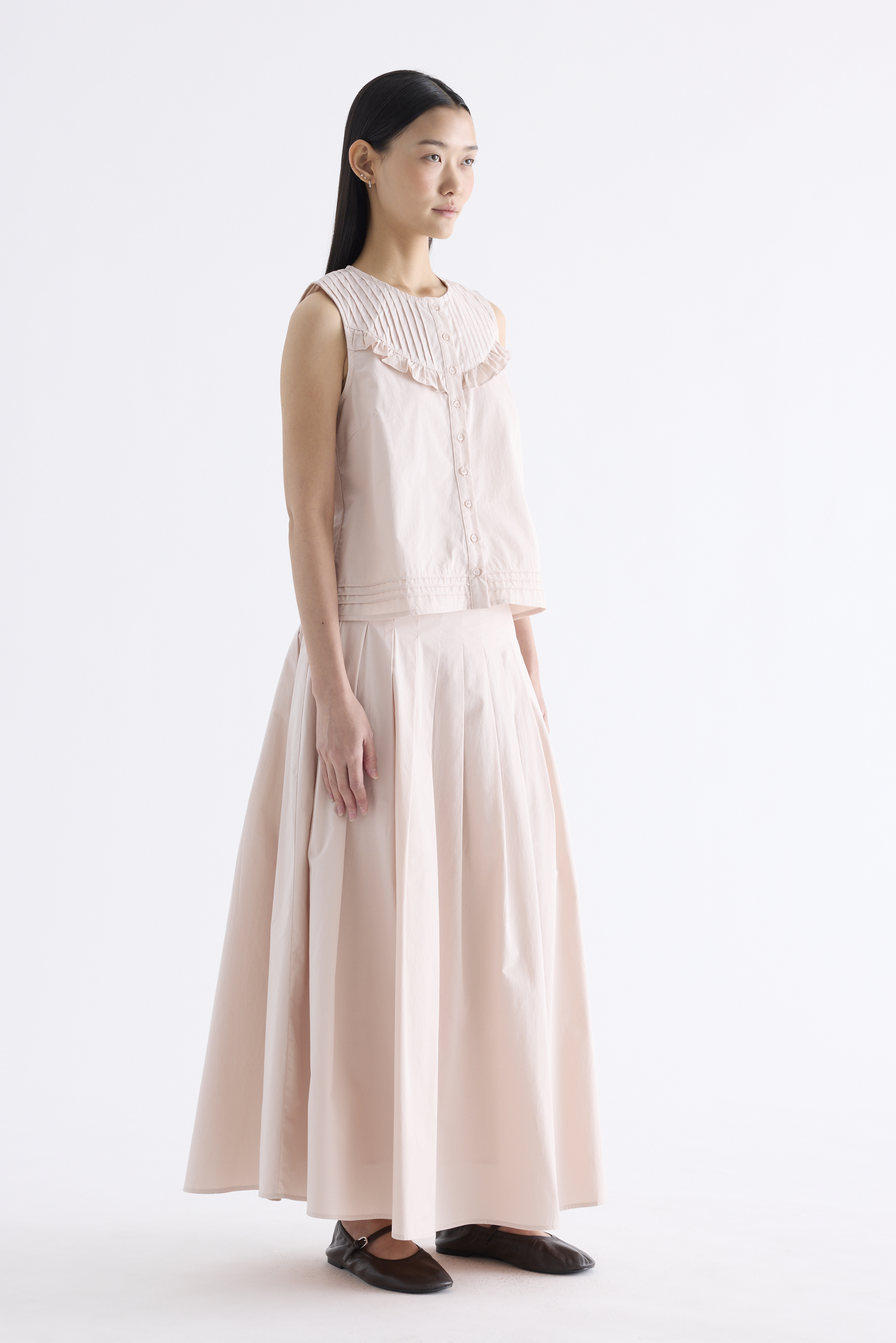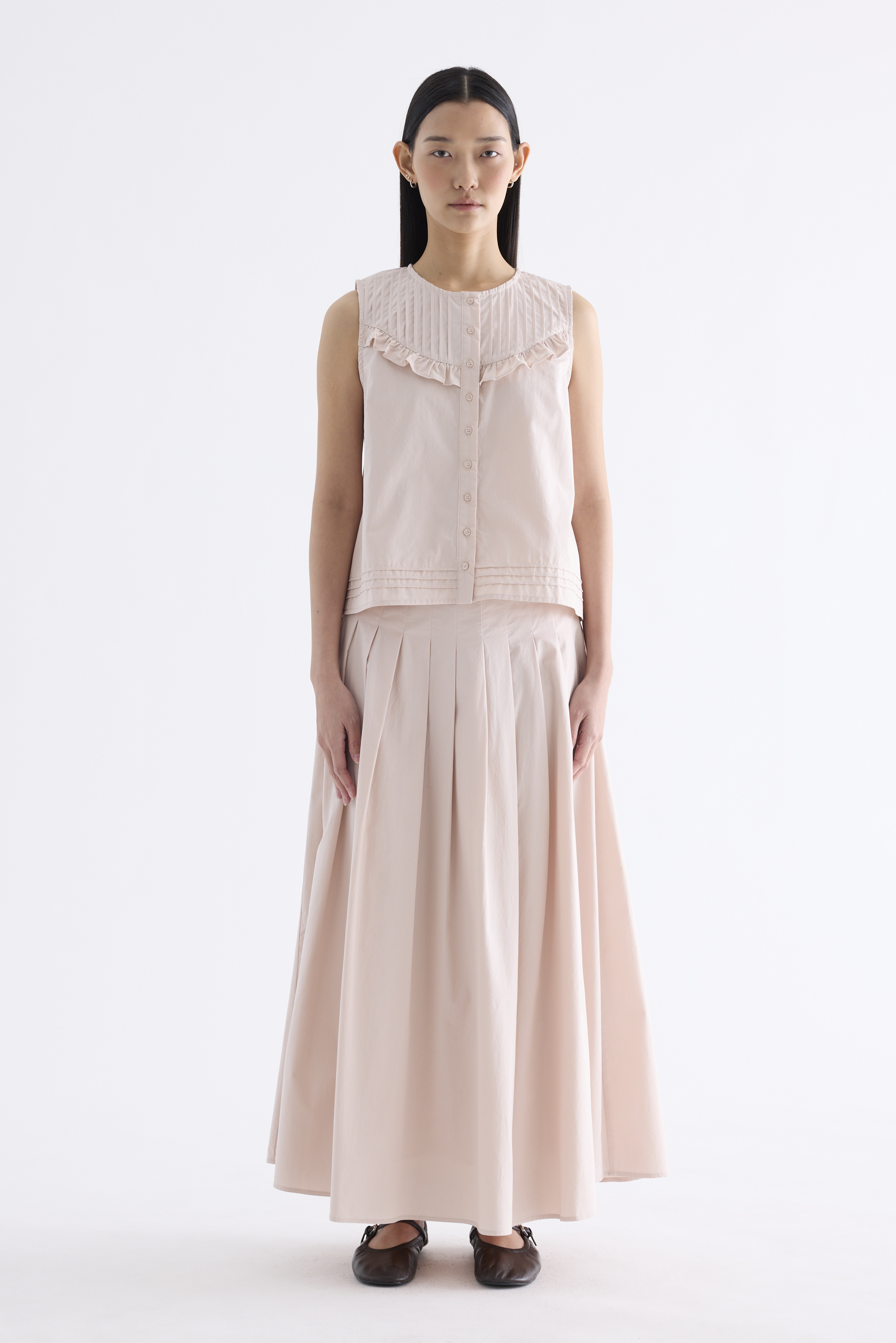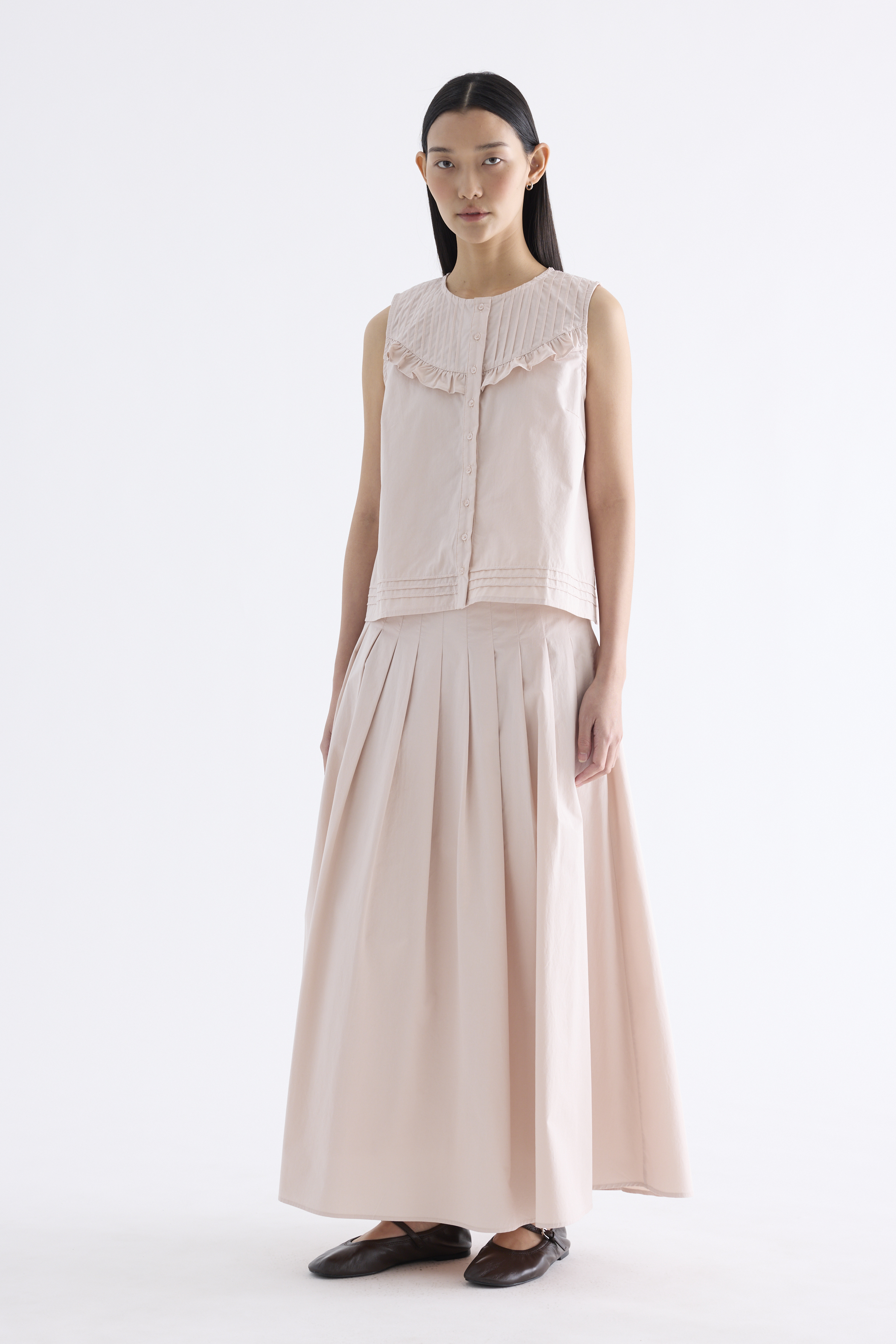 Tailored and textured. Cut from crisp and softly structured cotton, this sleeveless top features a pleated, frill-trimmed yoke, round neckline, button-down front and pleated hem. Worn in a relaxed, boxy fit.