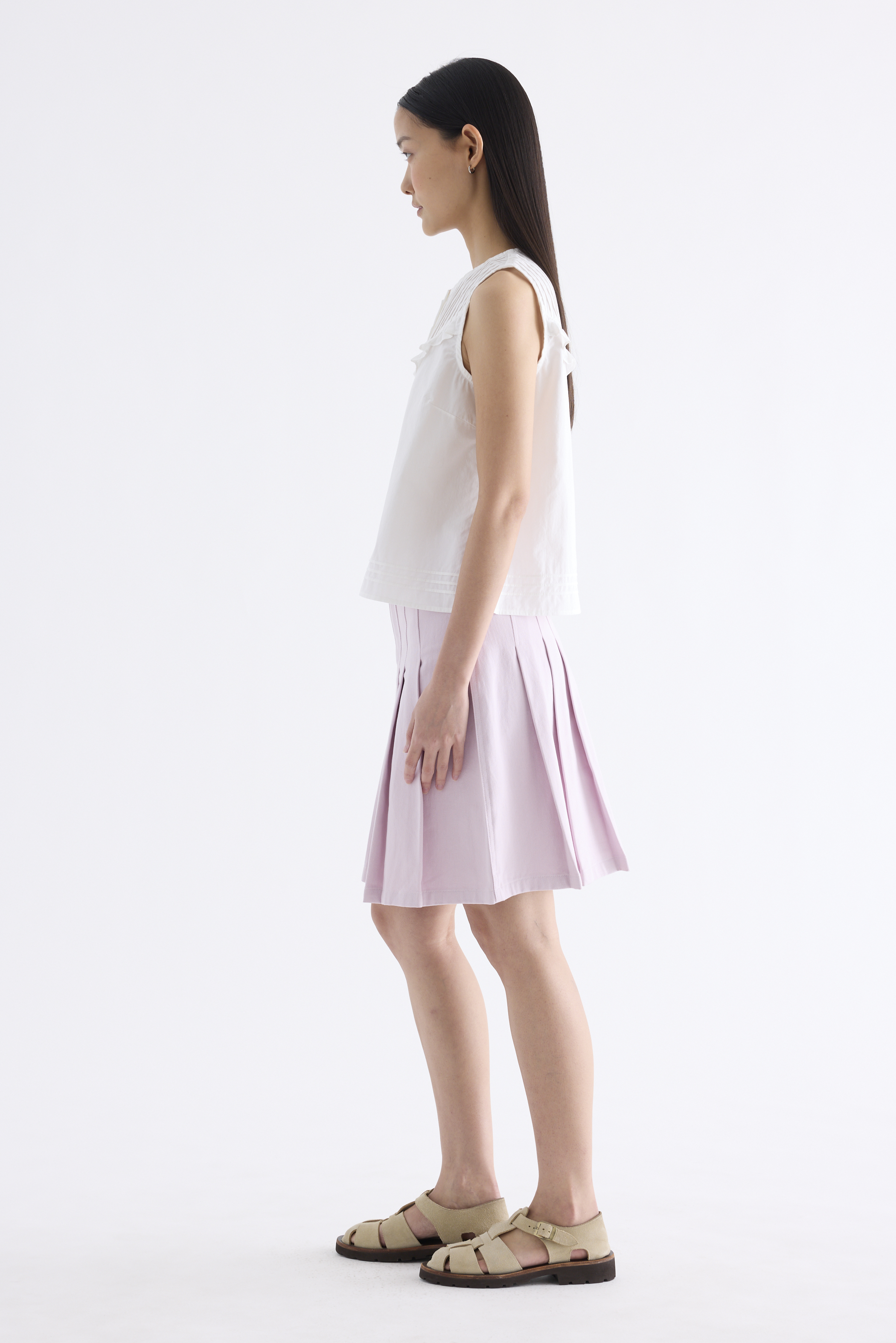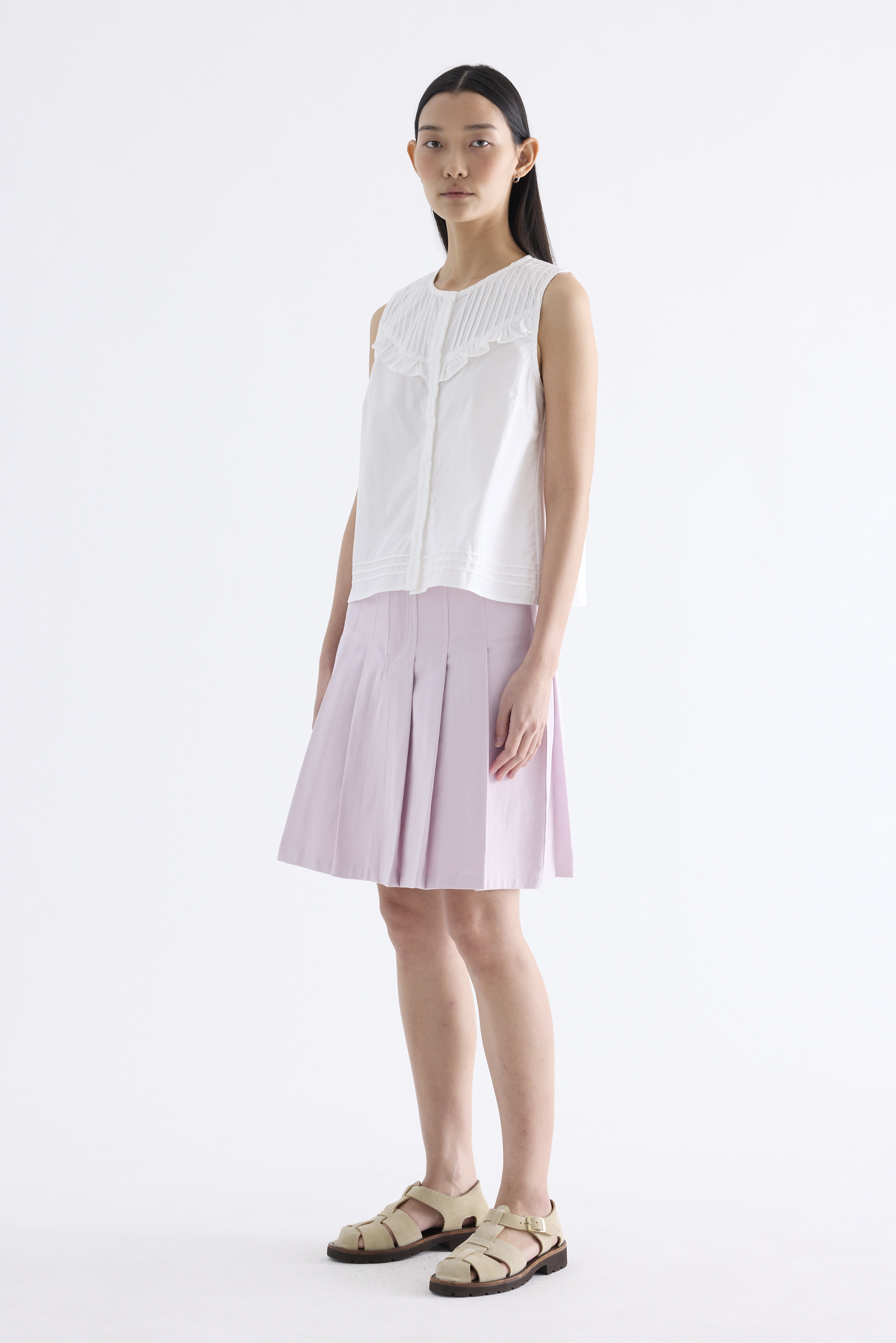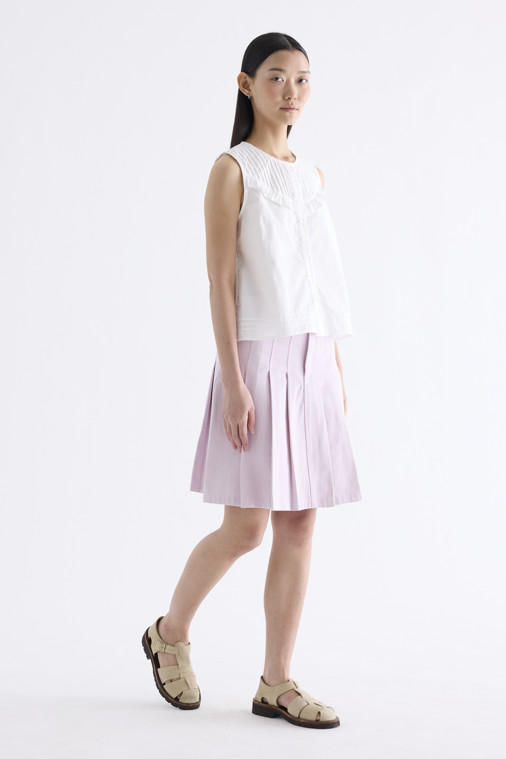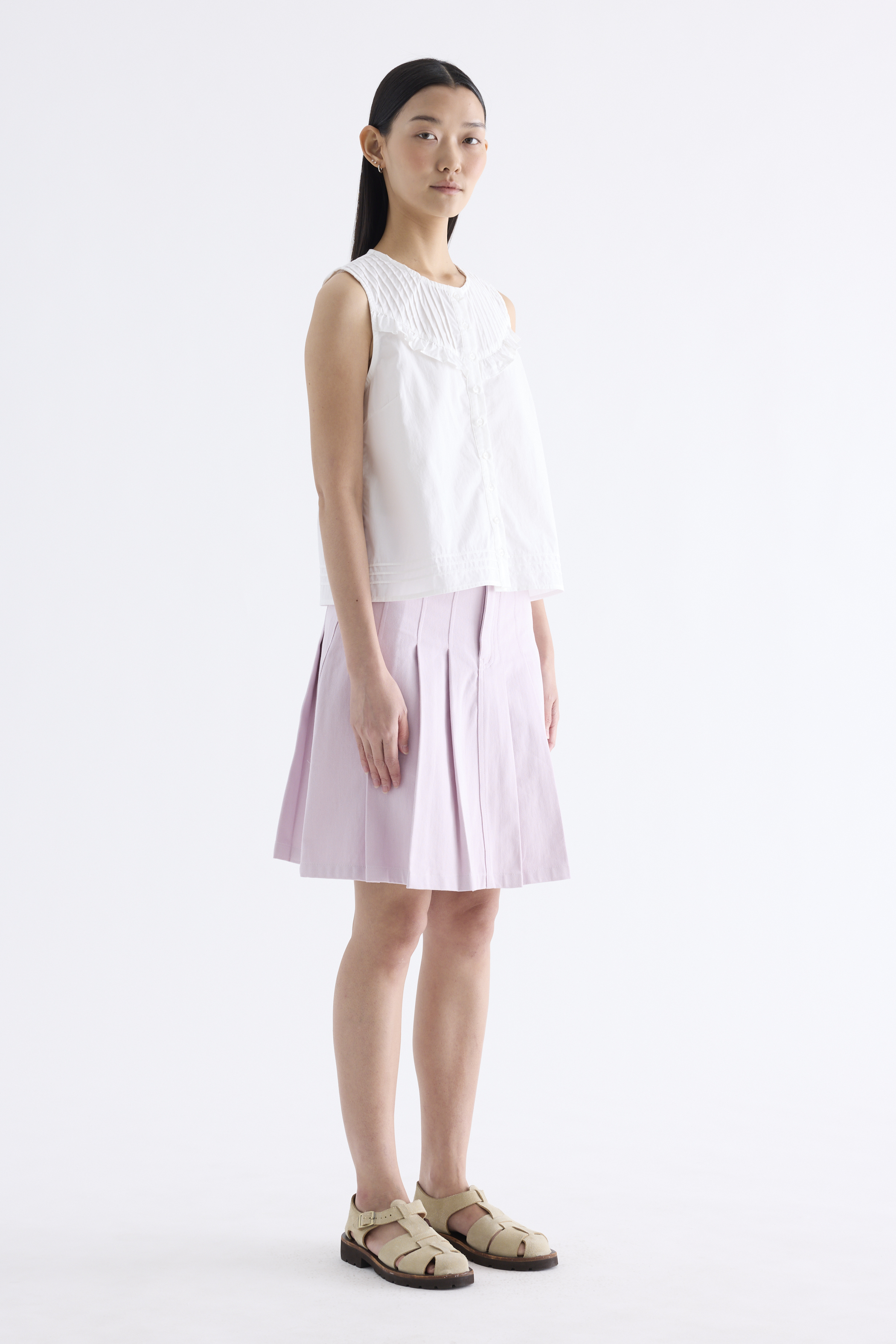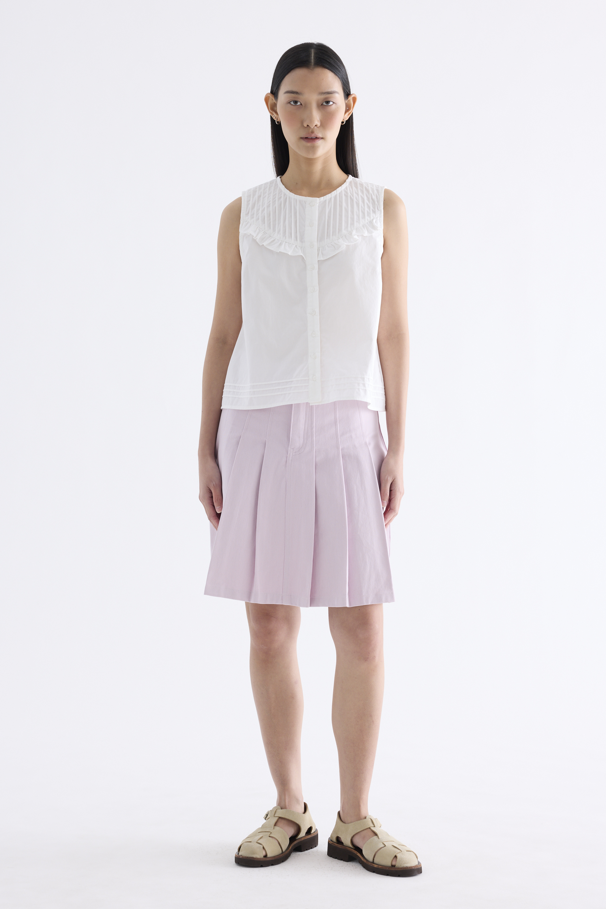 Tailored and textured. Cut from crisp and softly structured cotton, this sleeveless top features a pleated, frill-trimmed yoke, round neckline, button-down front and pleated hem. Worn in a relaxed, boxy fit.