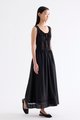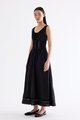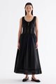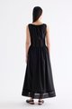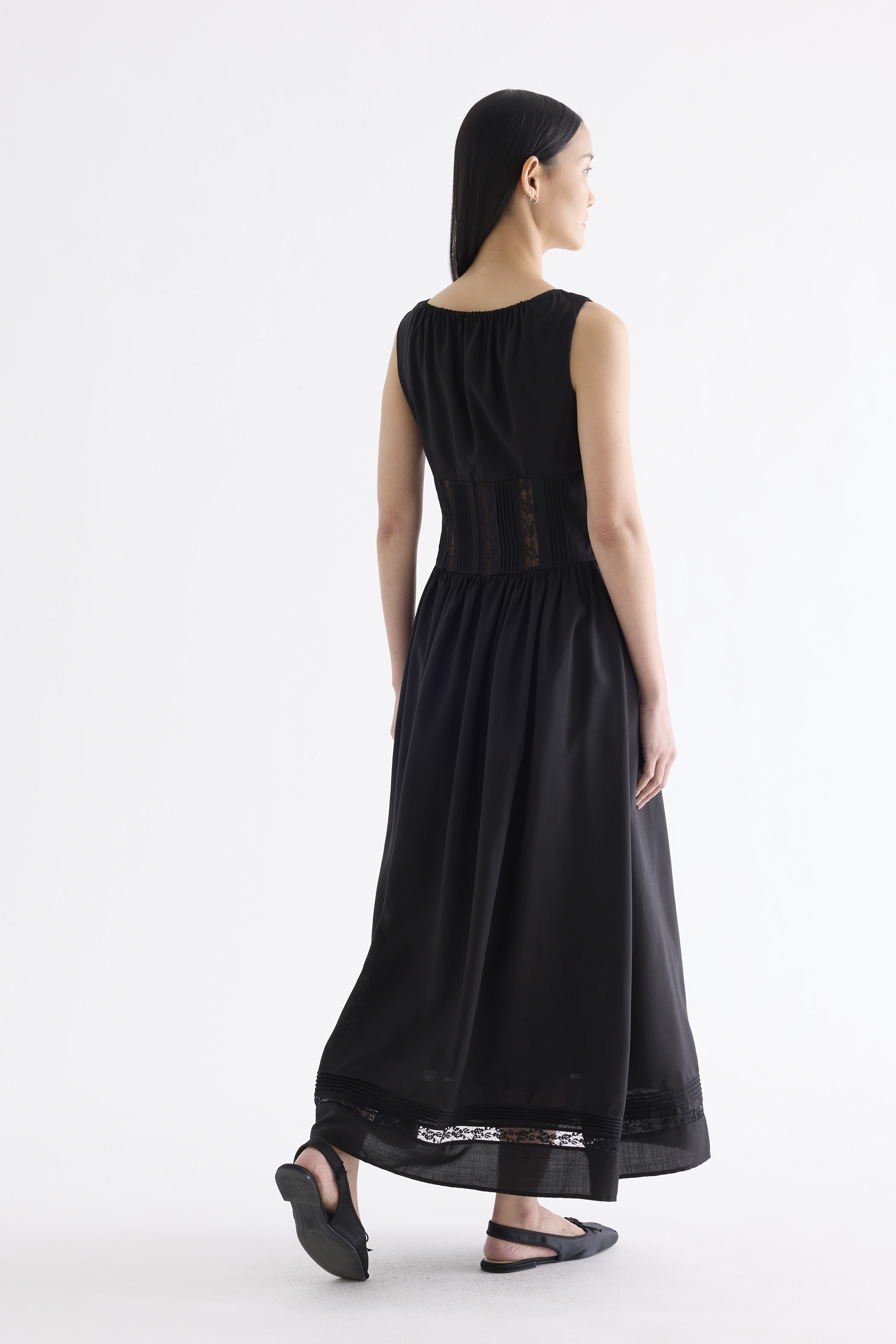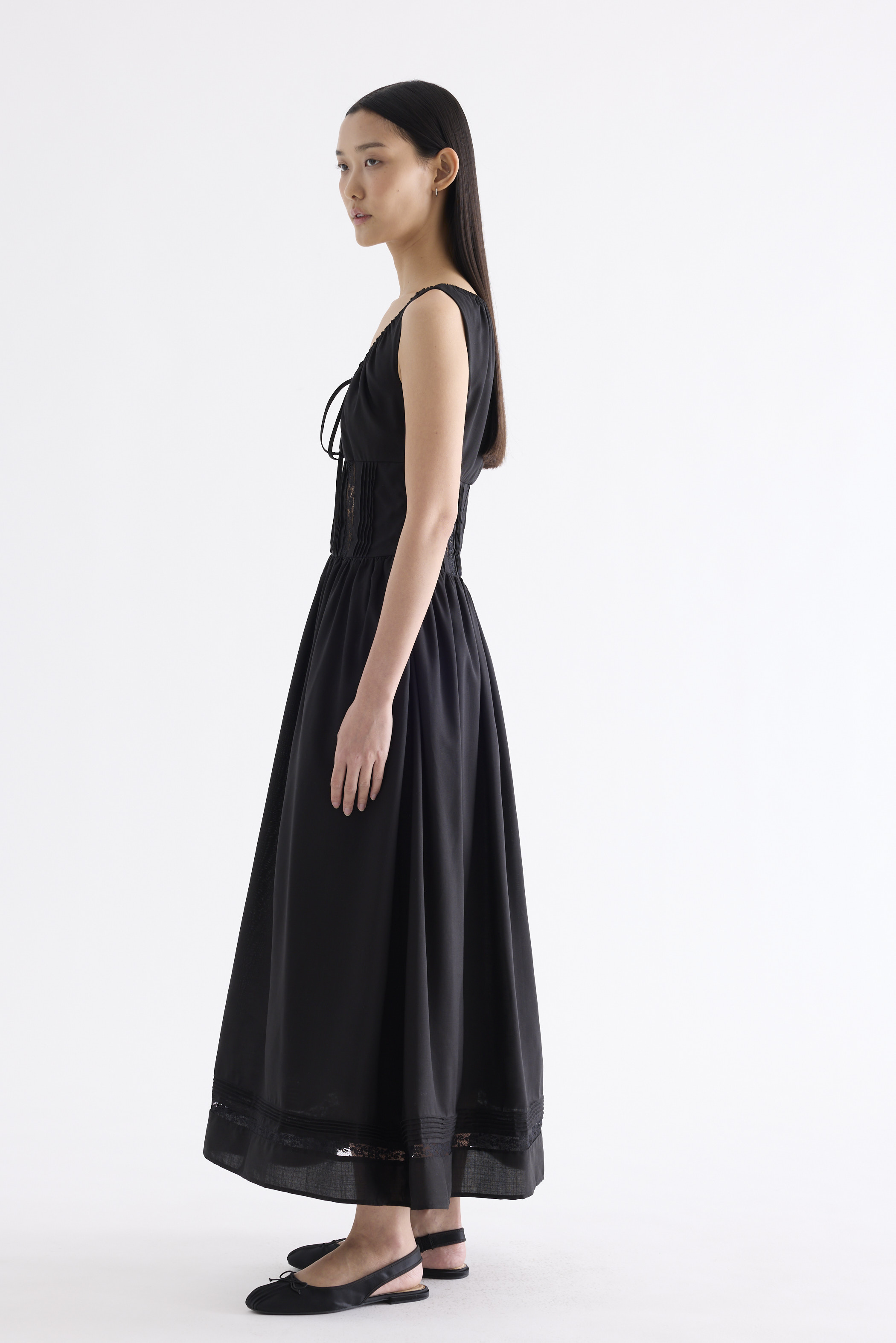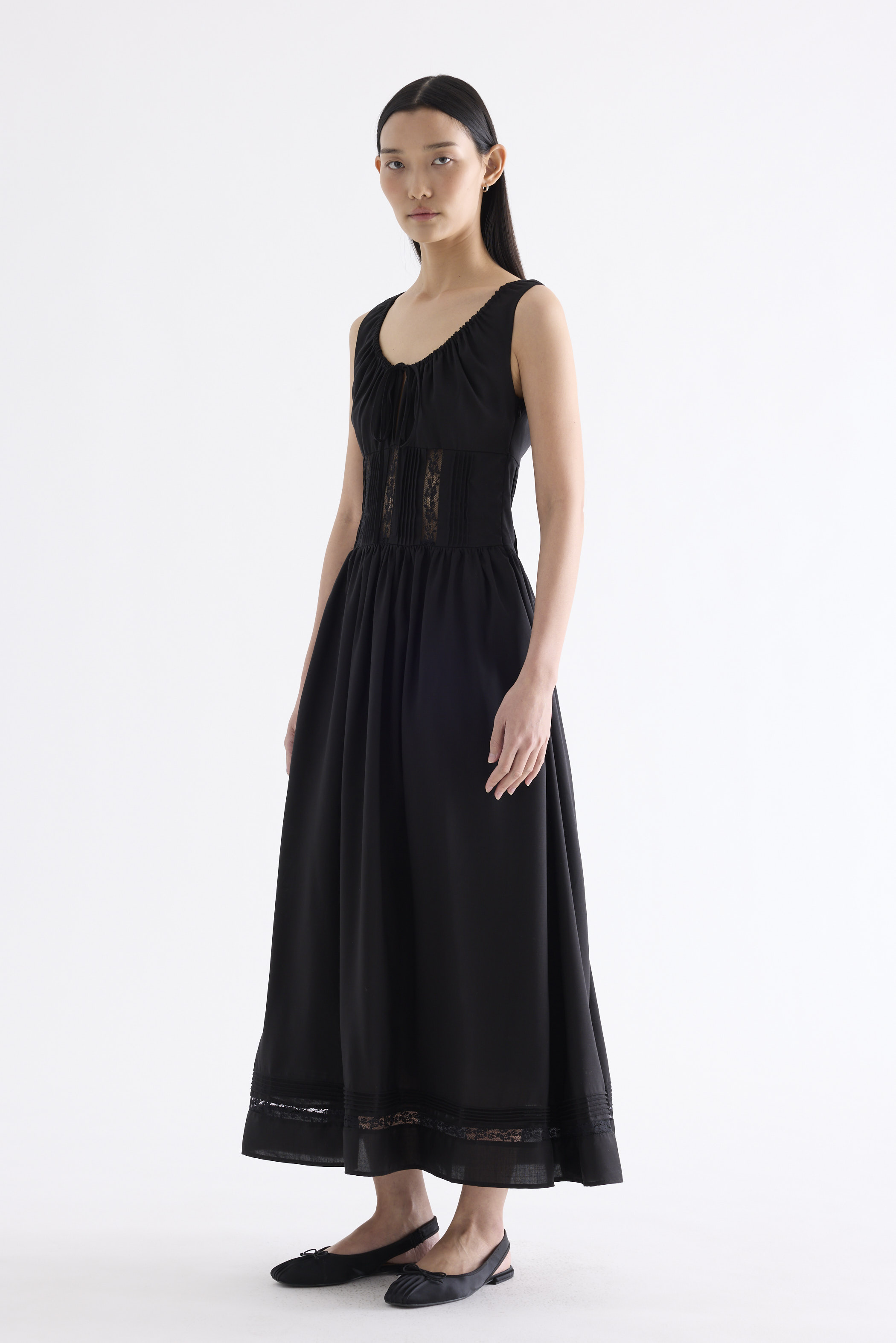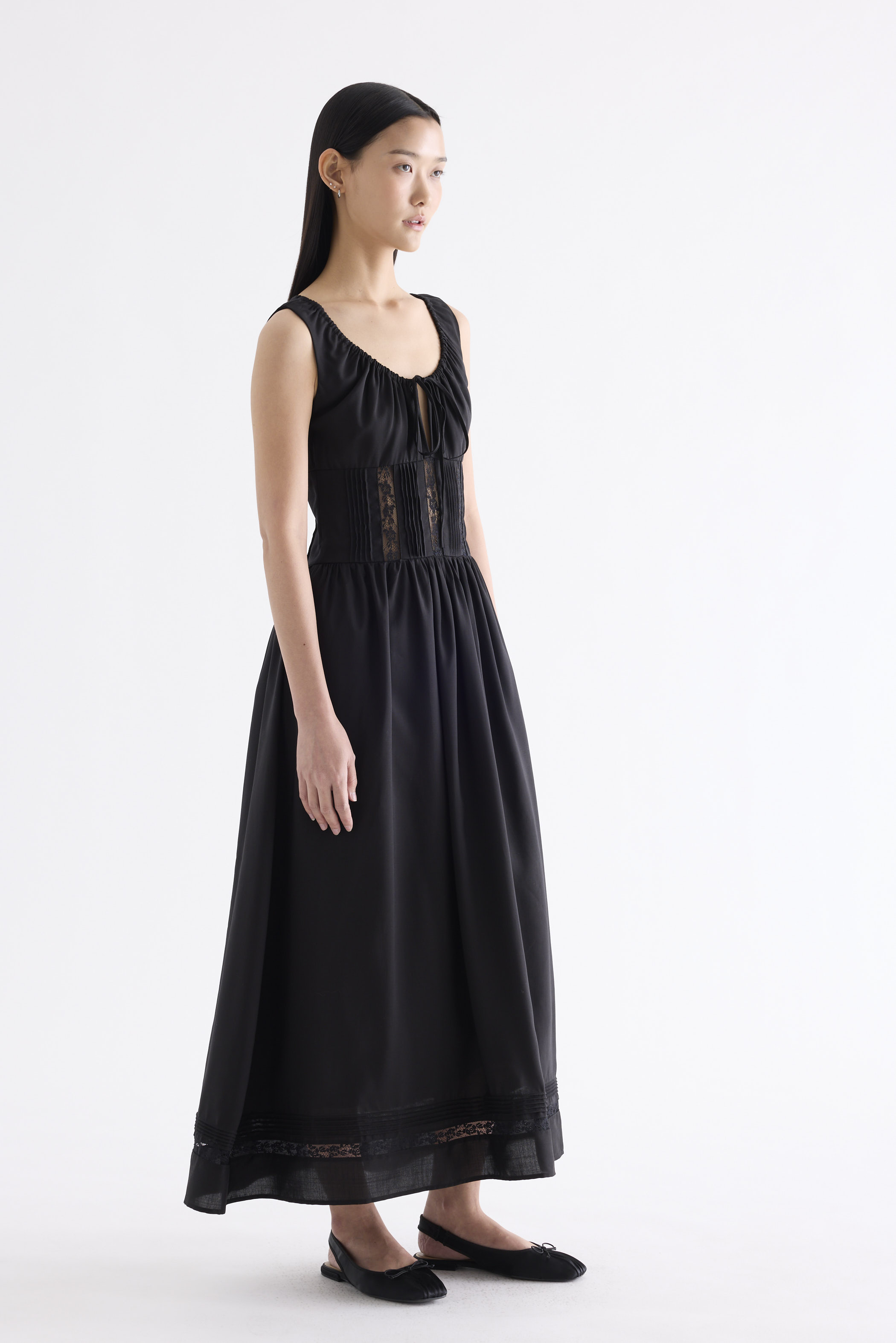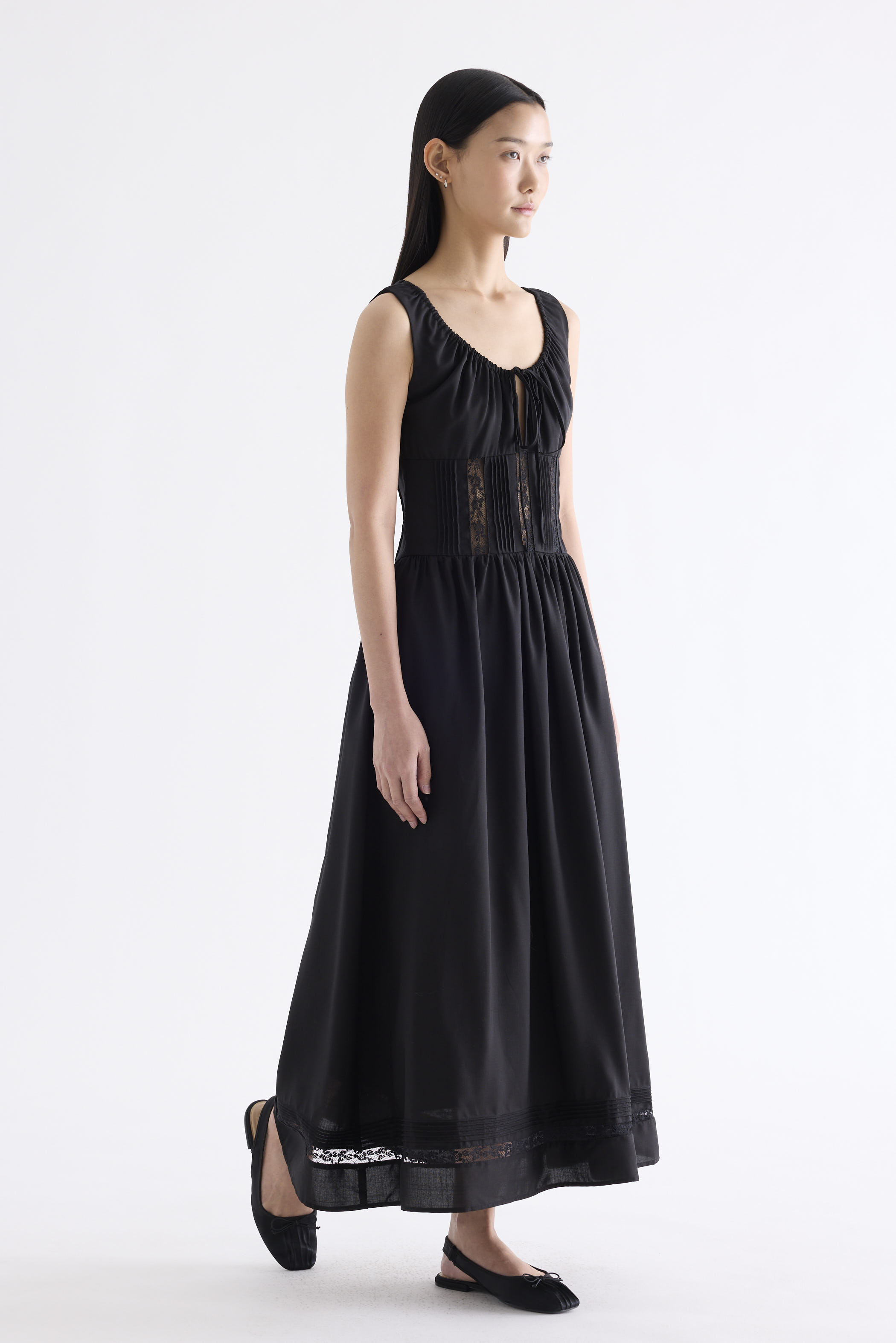 Occasion worthy. Made from smooth and non-stretch Tencel, this sleeveless maxi dress features a round drawstring neckline, front slit with a tie-strap closure, waist panel with lace panels and pin-tuck pleats, as well as a side zip closure. Worn in an A-line silhouette that flows out at the waist into a relaxed skirt.