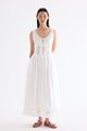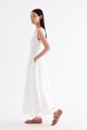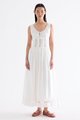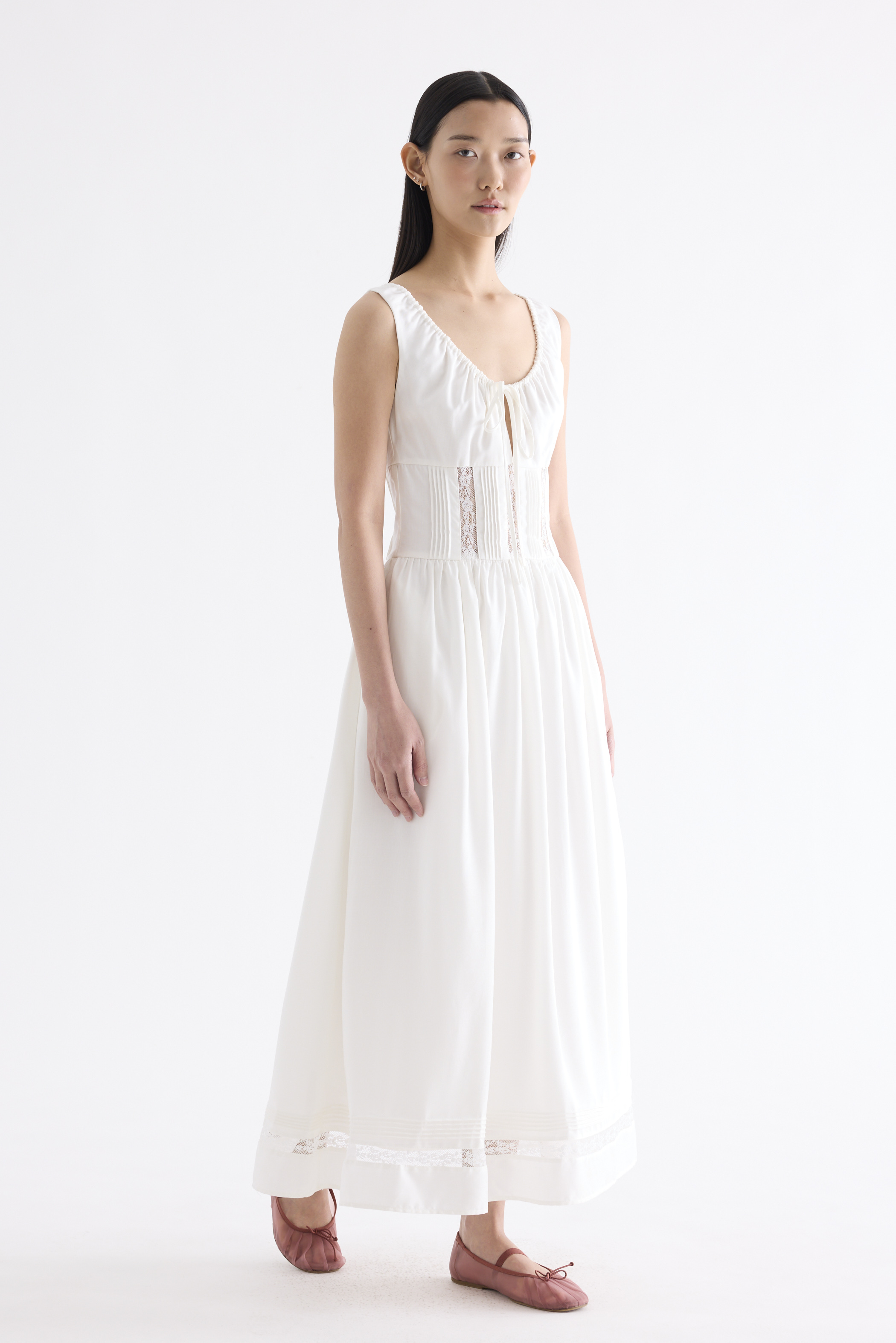 Occasion worthy. Made from smooth and non-stretch Tencel, this sleeveless maxi dress features a round drawstring neckline, front slit with a tie-strap closure, waist panel with lace panels and pin-tuck pleats, as well as a side zip closure. Worn in an A-line silhouette that flows out at the waist into a relaxed skirt.
