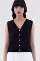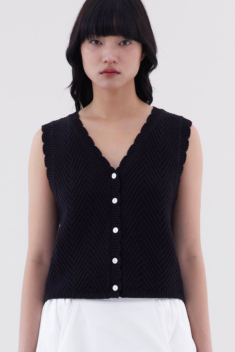 Cosy. Made from soft and textured knit, this sleeveless vest features scalloped edges, a V-neckline and a button-down front. Worn in a slim fit.