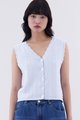 Cosy. Made from soft and textured knit, this sleeveless vest features scalloped edges, a V-neckline and a button-down front. Worn in a slim fit.