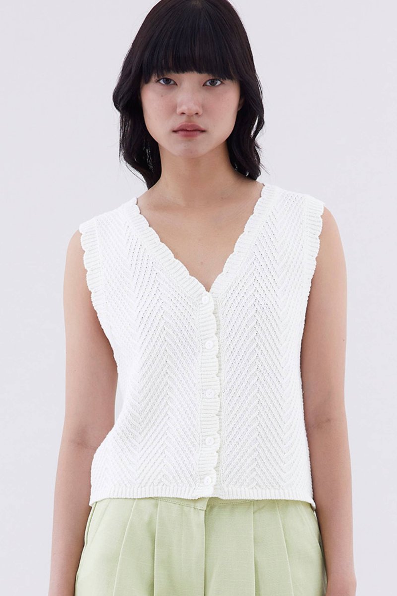 Cosy. Made from soft and textured knit, this sleeveless vest features scalloped edges, a V-neckline and a button-down front. Worn in a slim fit.
