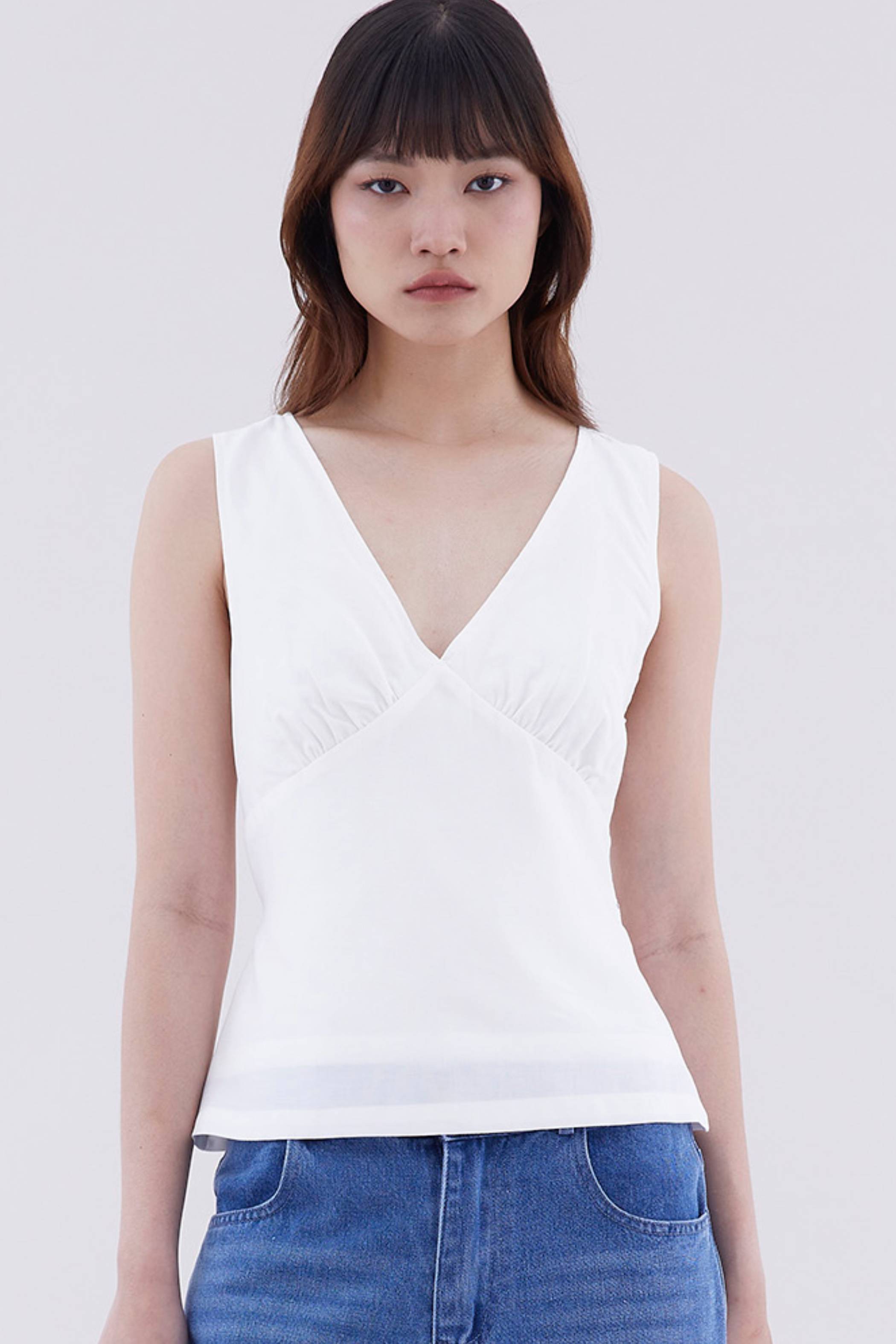 Extra details never hurt. Made from smooth and softly structured cotton, this sleeveless top features a V-neckline, ruched bust, side zip closure and fitted waist with back tie straps. Worn in a slim fit.