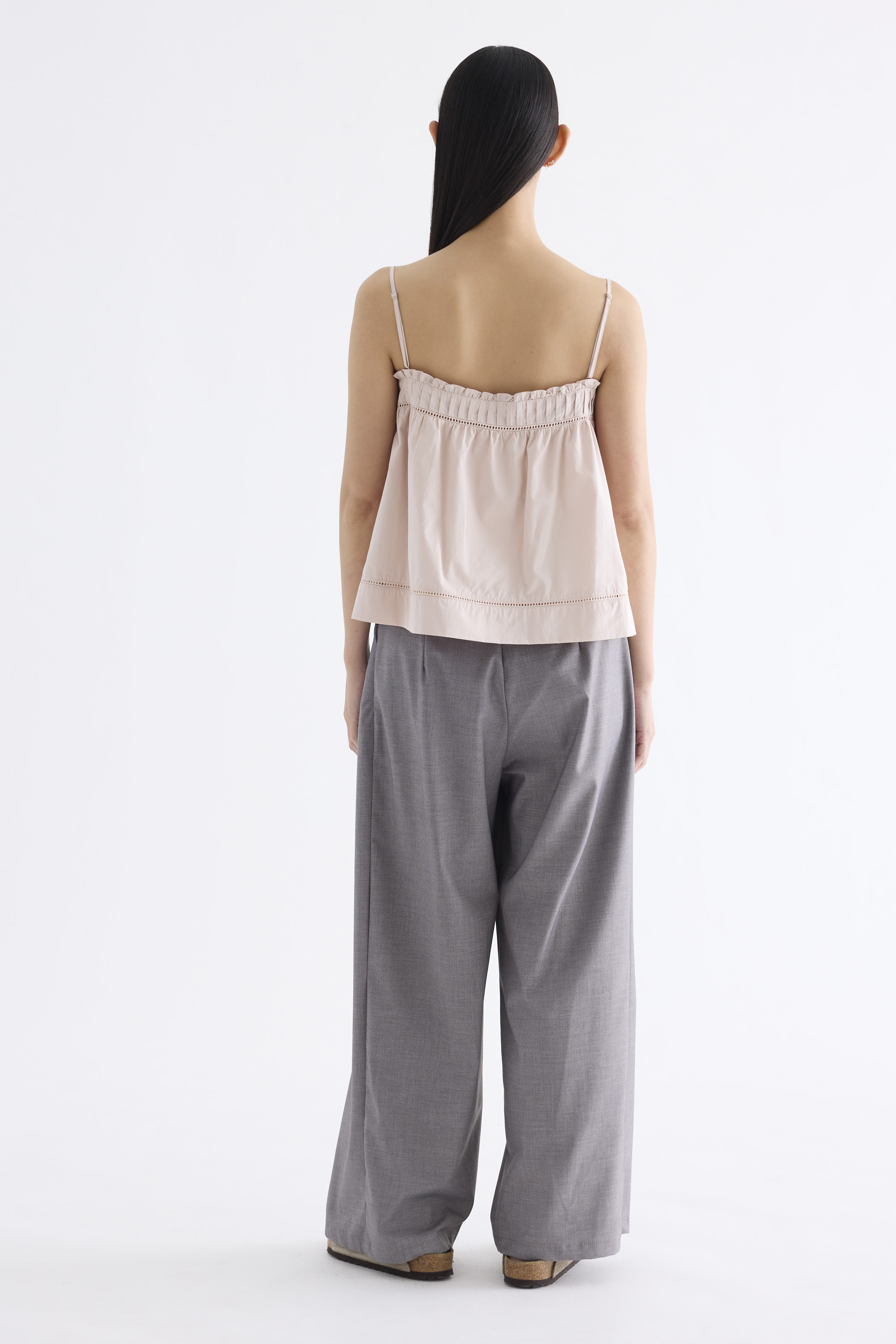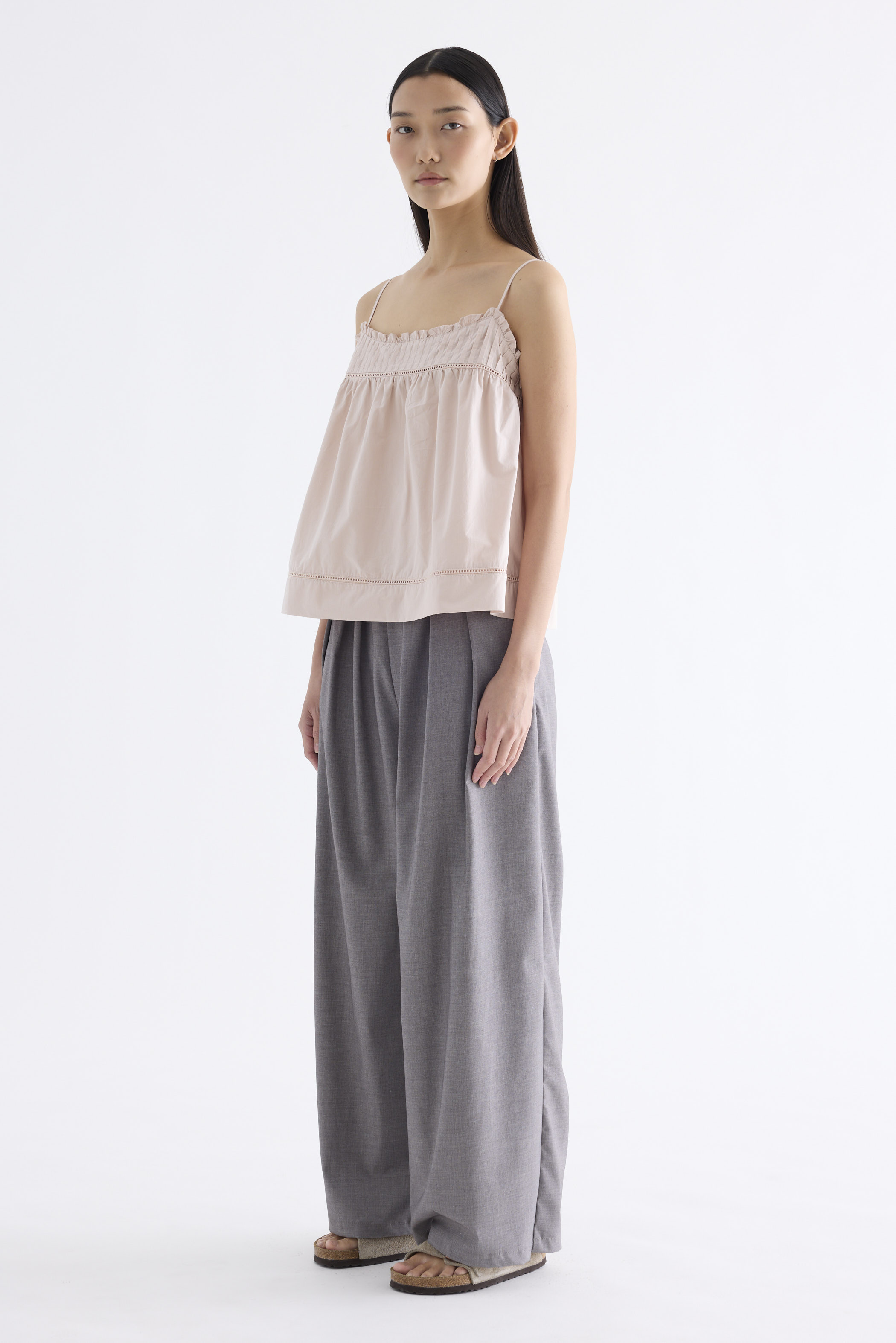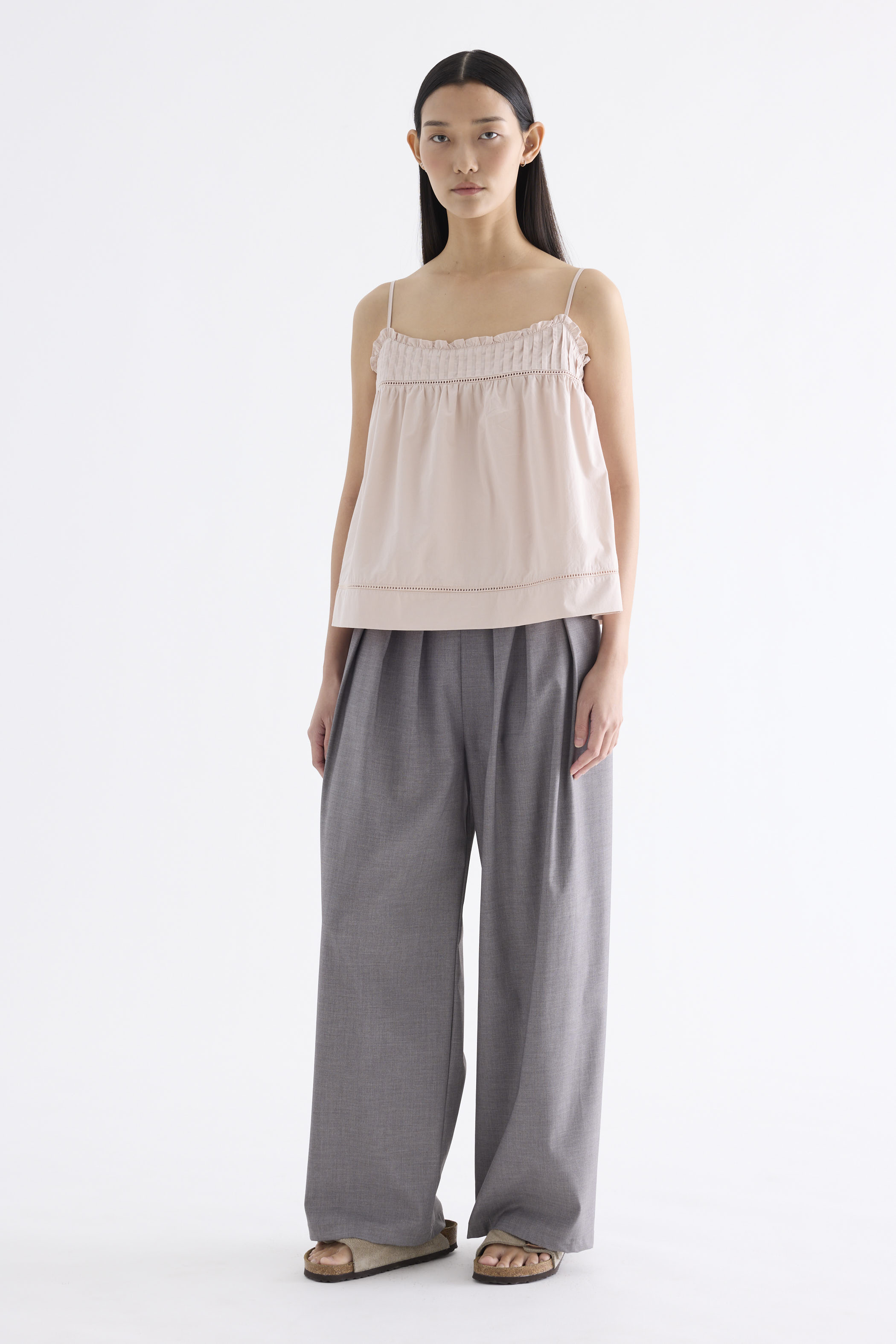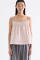 Catchy necklines. Cut from crisp and softly structured cotton, this sleeveless top features slim adjustable shoulder straps, a frill-trimmed neckline, a pleated bust and lace detailing. Worn in a relaxed empire silhouette with a side zip closure.