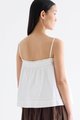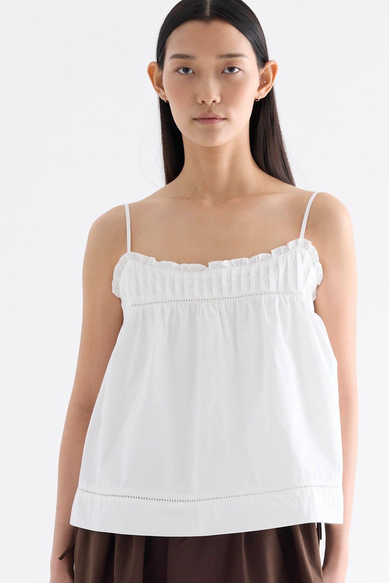 Catchy necklines. Cut from crisp and softly structured cotton, this sleeveless top features slim adjustable shoulder straps, a frill-trimmed neckline, a pleated bust and lace detailing. Worn in a relaxed empire silhouette with a side zip closure.