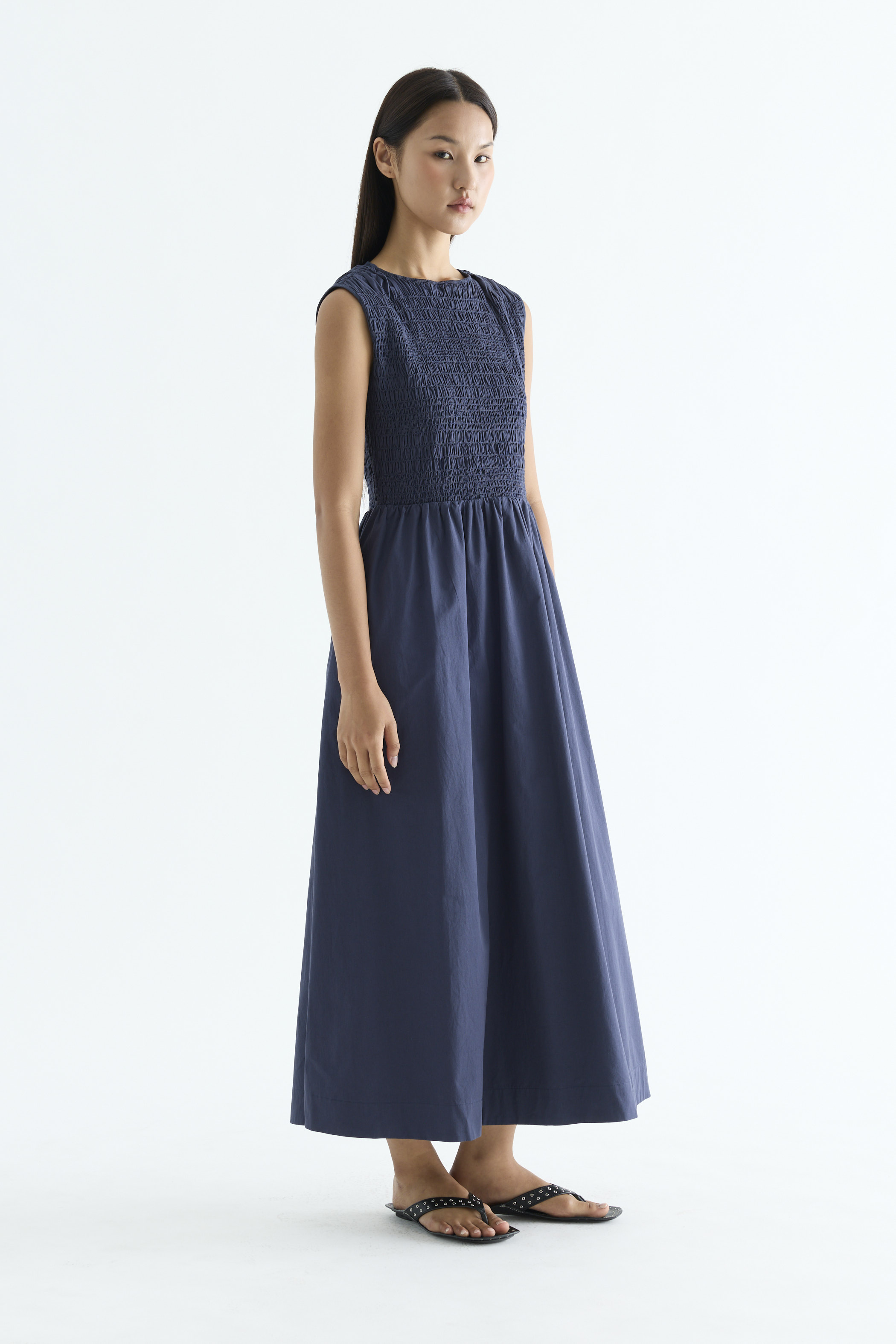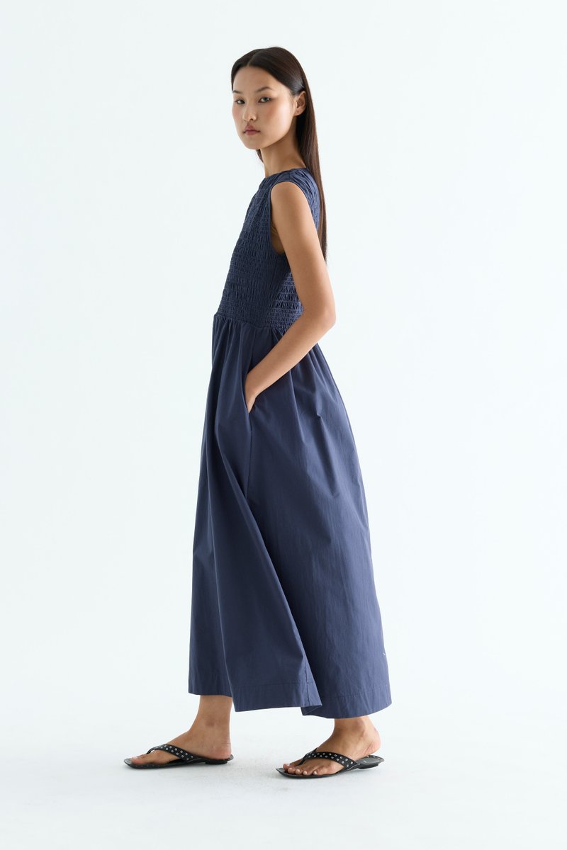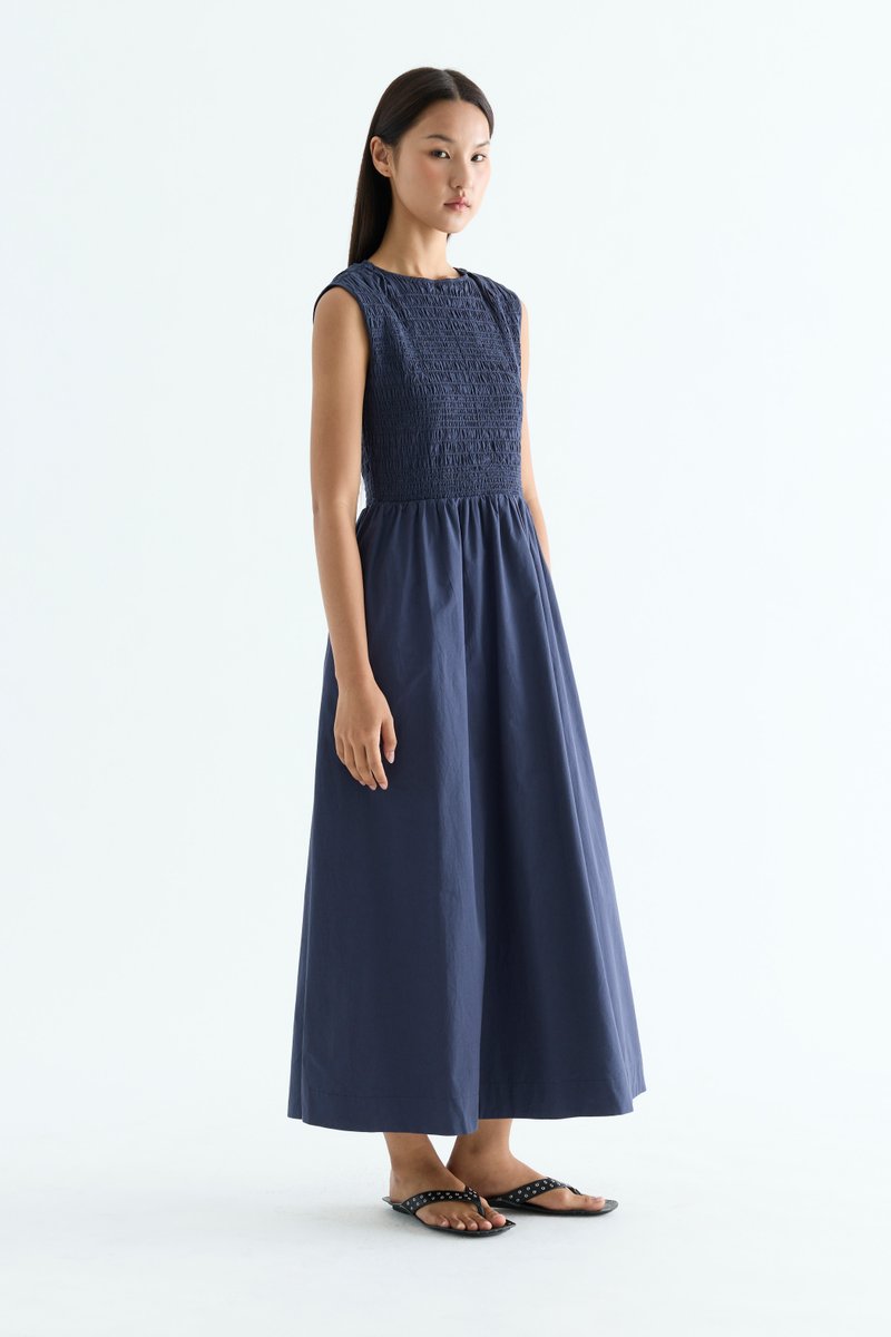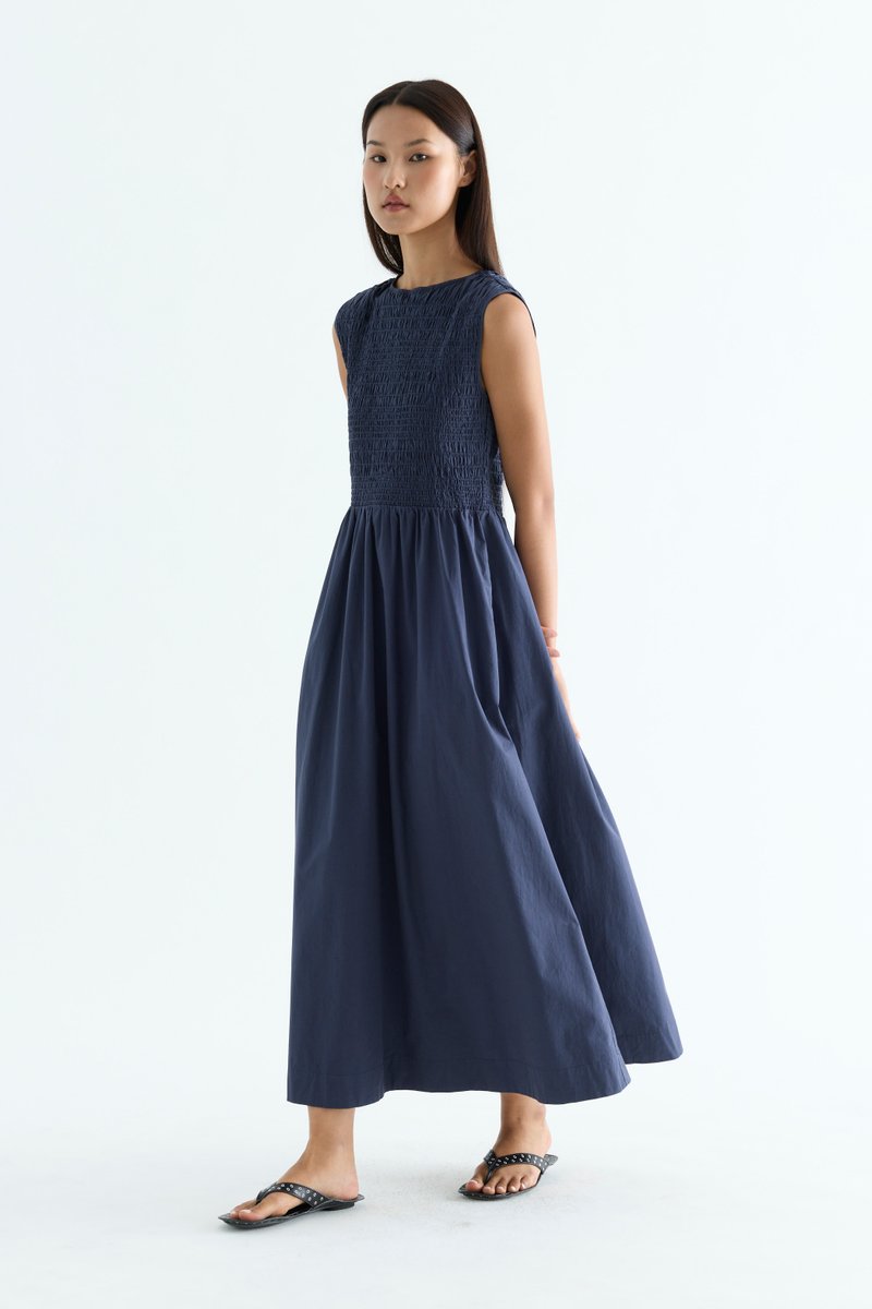 Rock the smock. Made from crisp and softly structured cotton, this sleeveless maxi dress features a gathered neckline and stretchy smocked bodice. Worn in an A-line silhouette that fits slim at the top before flowing out at the waist.