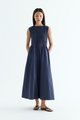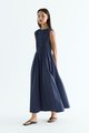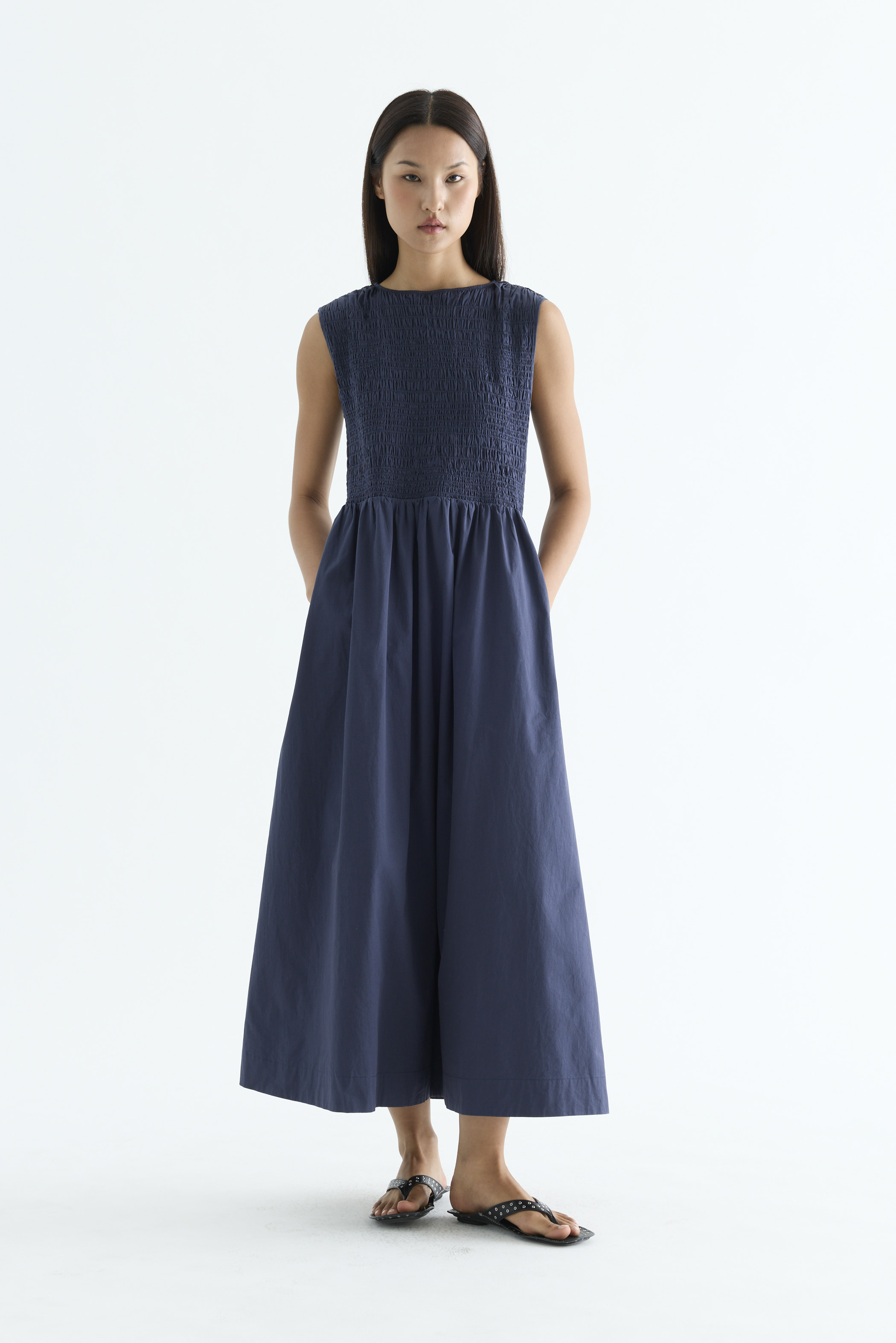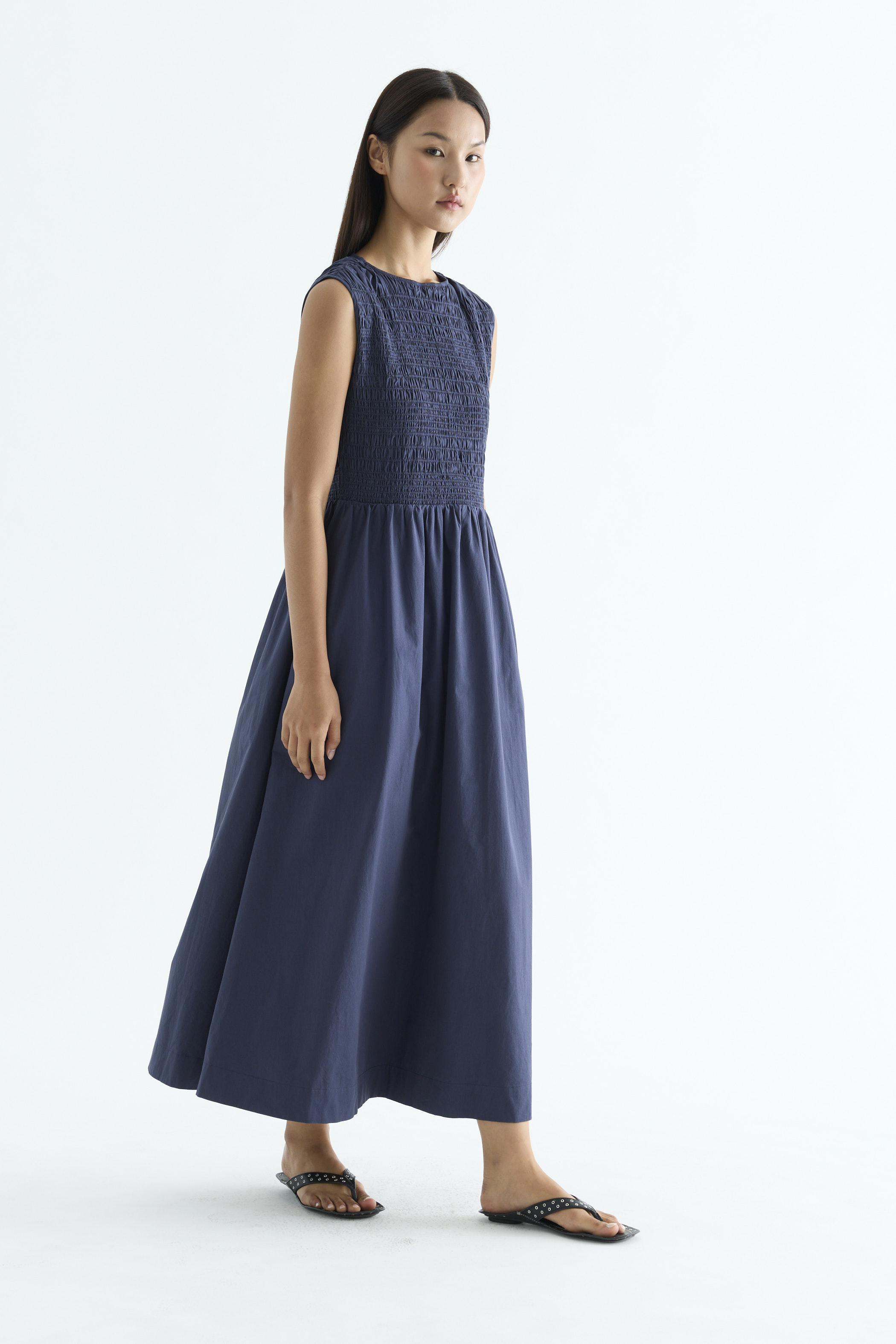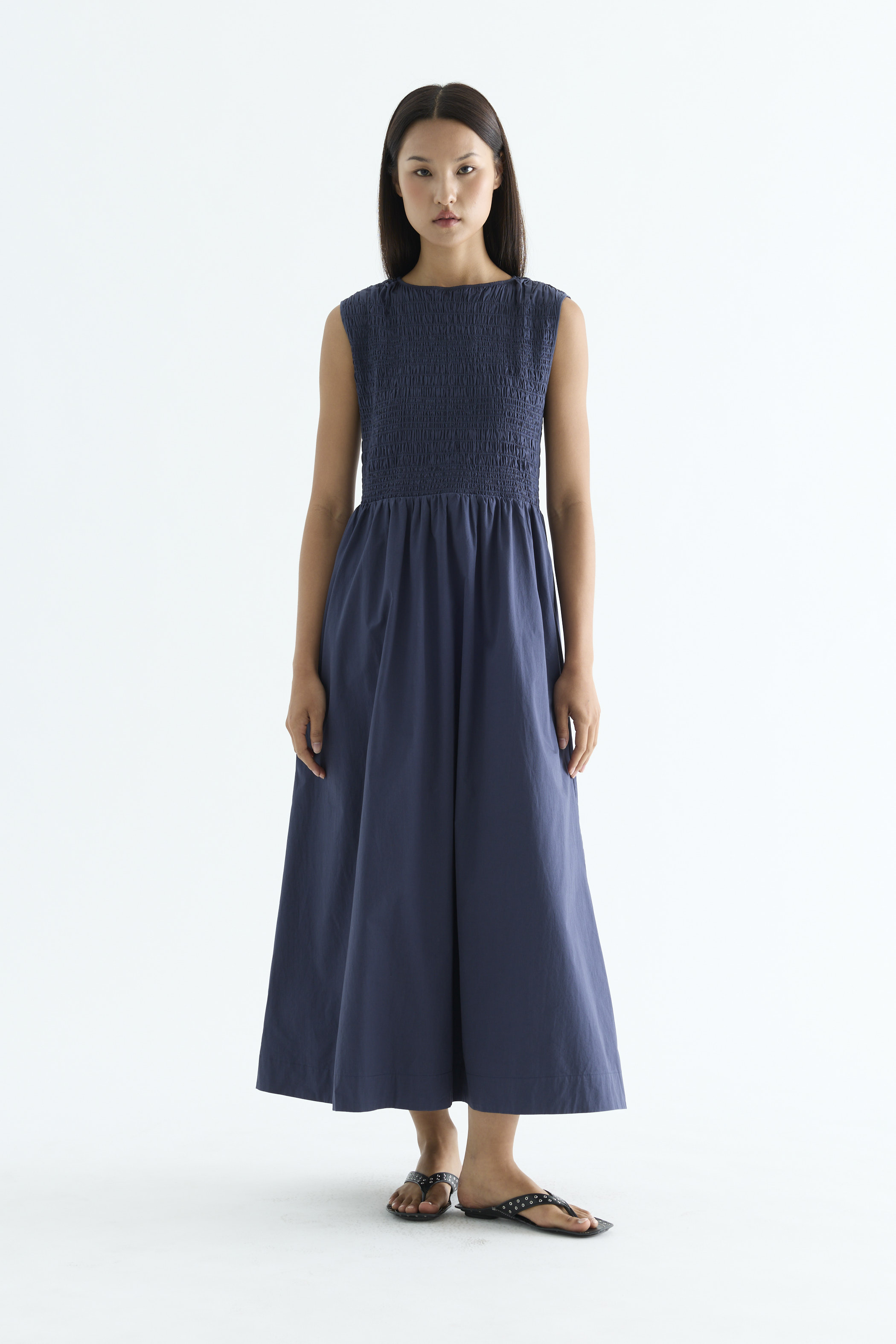Rock the smock. Made from crisp and softly structured cotton, this sleeveless maxi dress features a gathered neckline and stretchy smocked bodice. Worn in an A-line silhouette that fits slim at the top before flowing out at the waist.