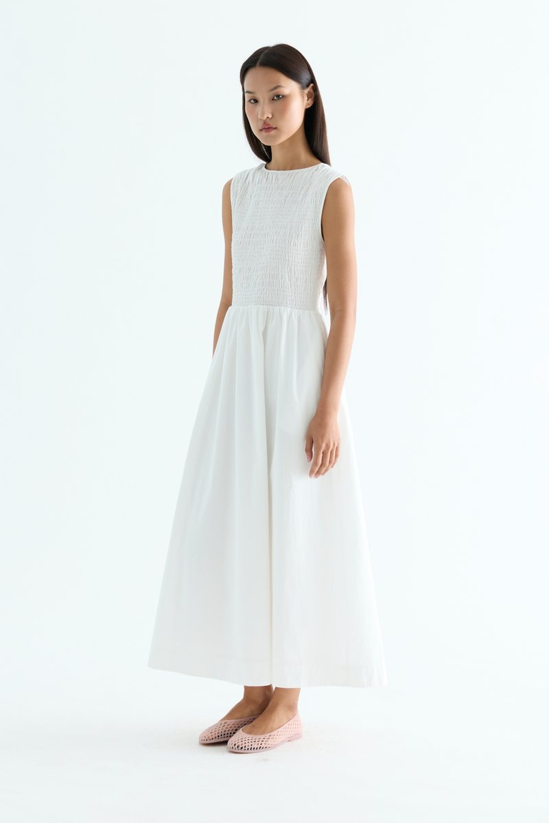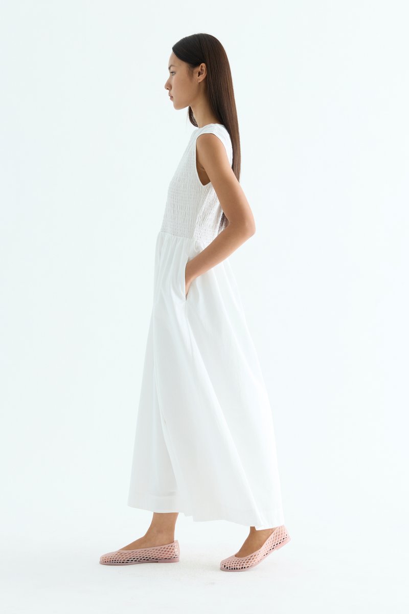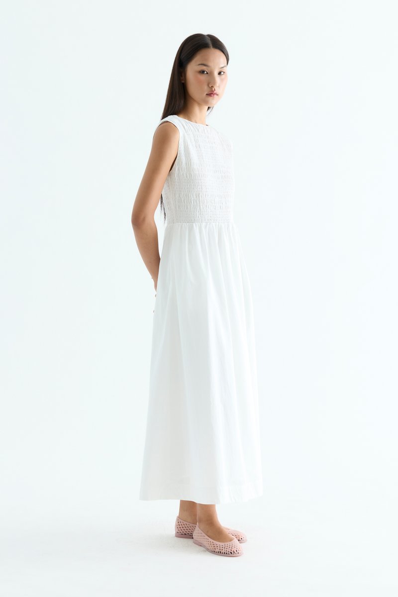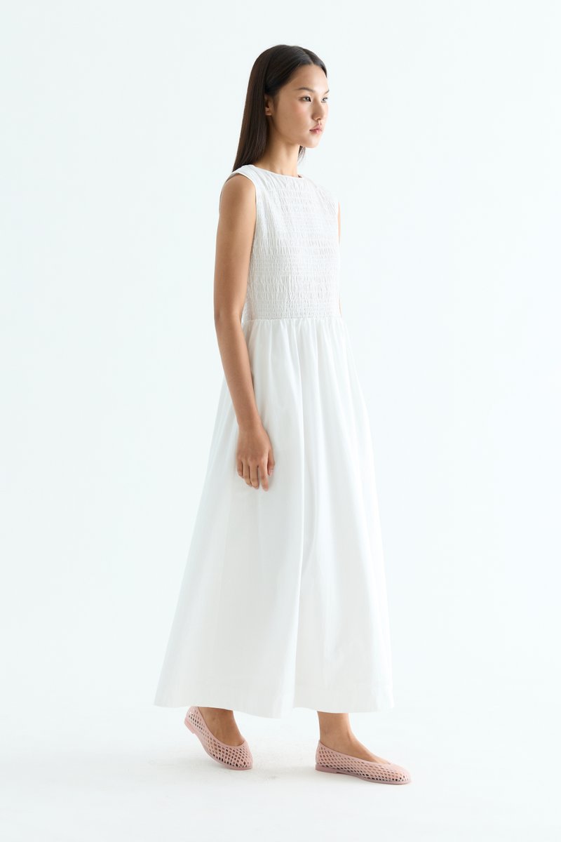 Rock the smock. Made from crisp and softly structured cotton, this sleeveless maxi dress features a gathered neckline and stretchy smocked bodice. Worn in an A-line silhouette that fits slim at the top before flowing out at the waist.