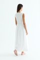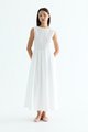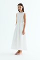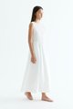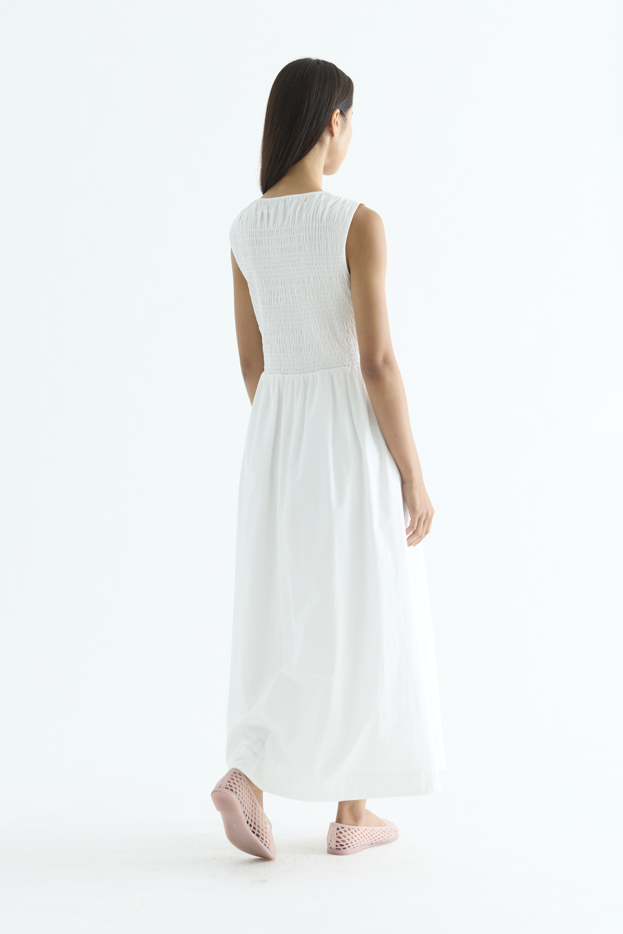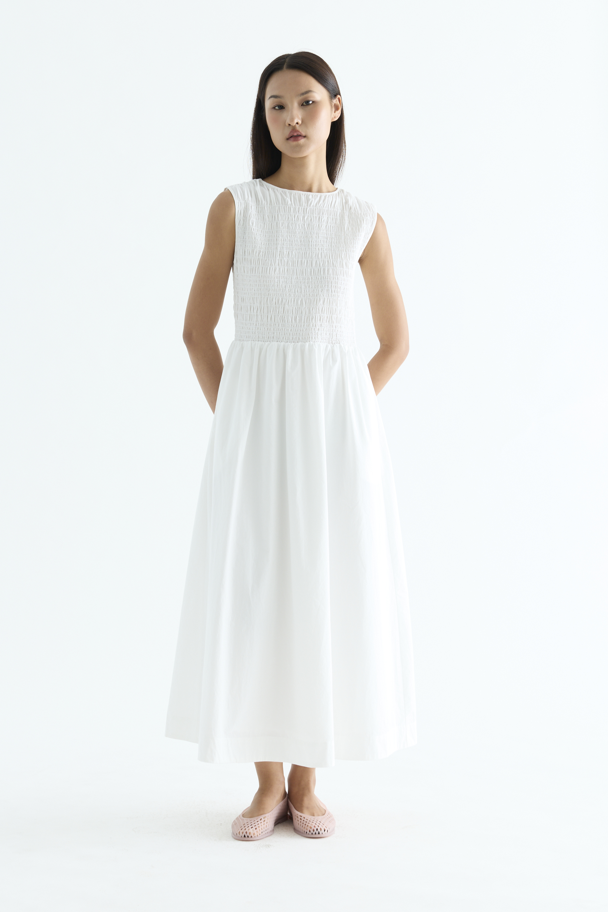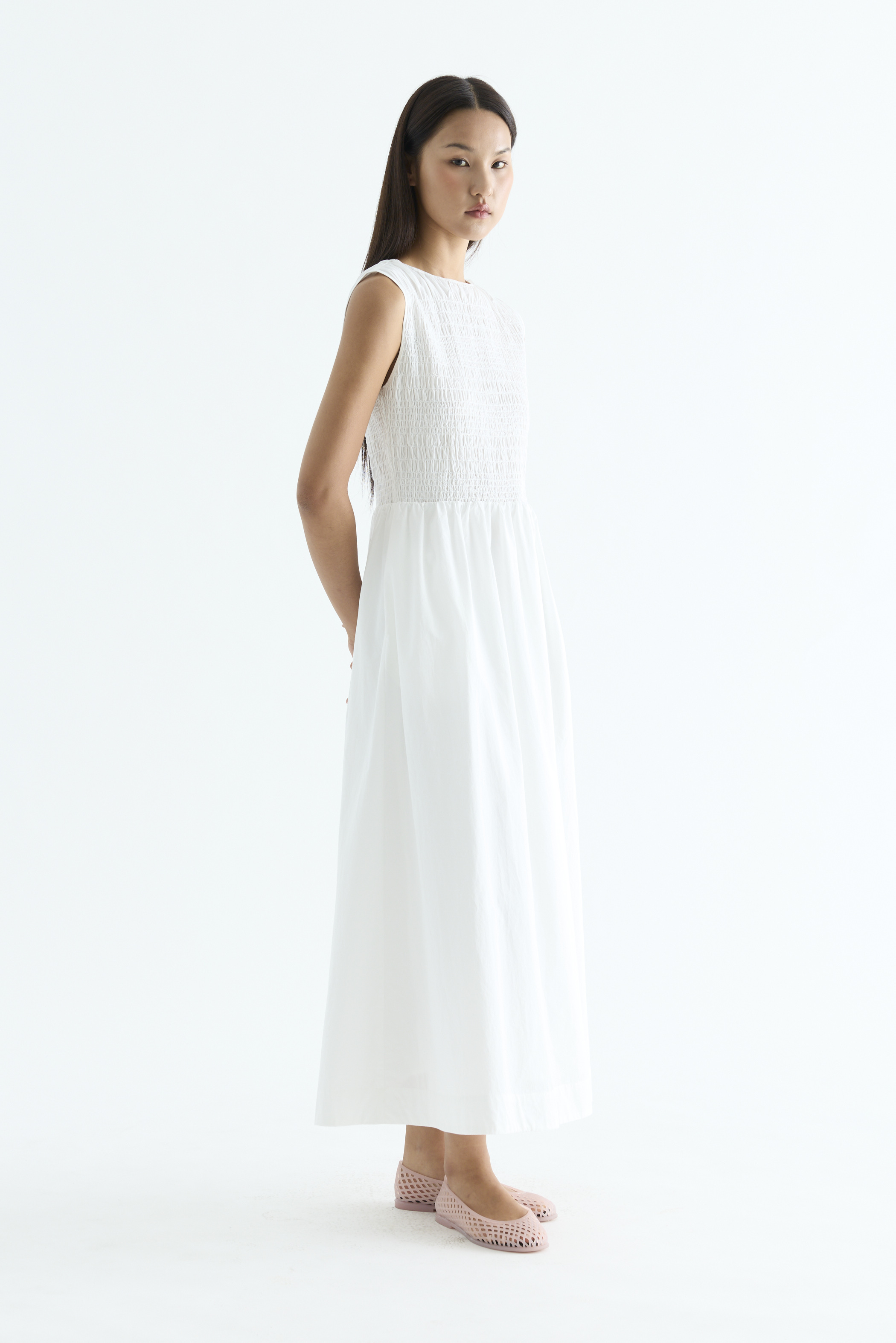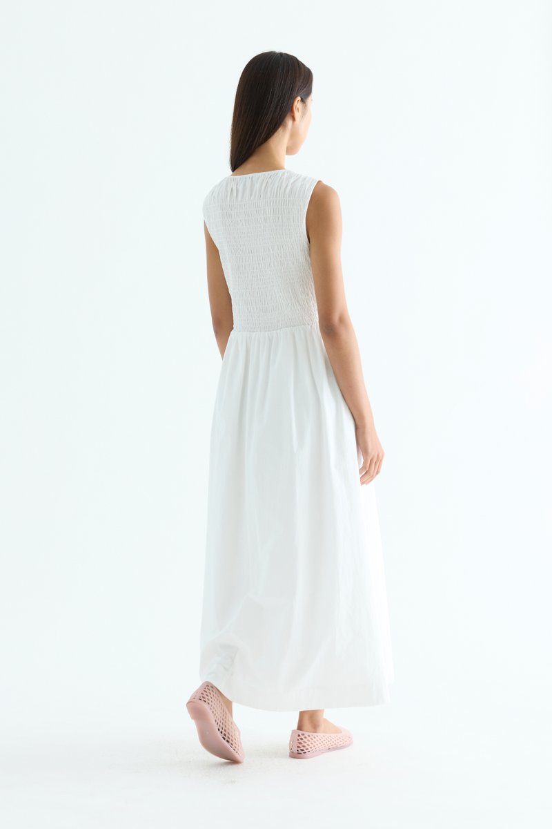 Rock the smock. Made from crisp and softly structured cotton, this sleeveless maxi dress features a gathered neckline and stretchy smocked bodice. Worn in an A-line silhouette that fits slim at the top before flowing out at the waist.
