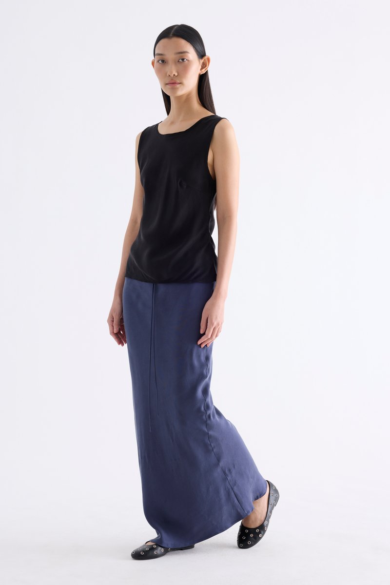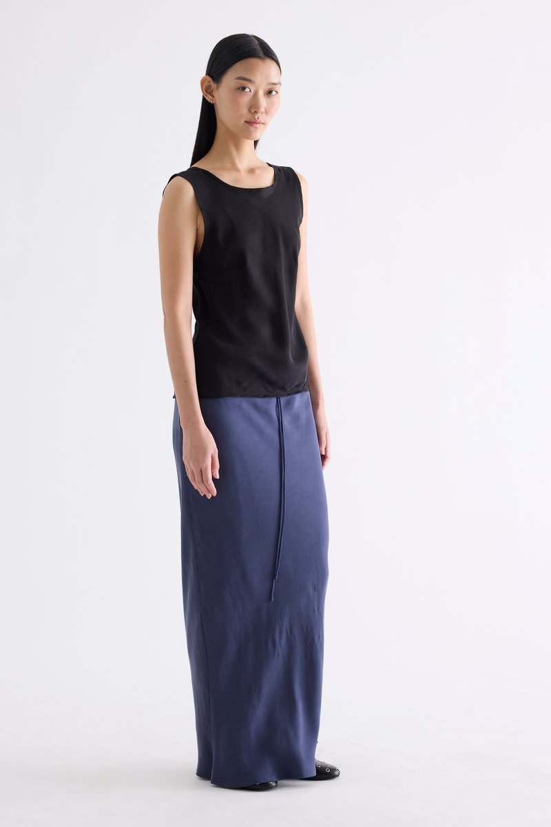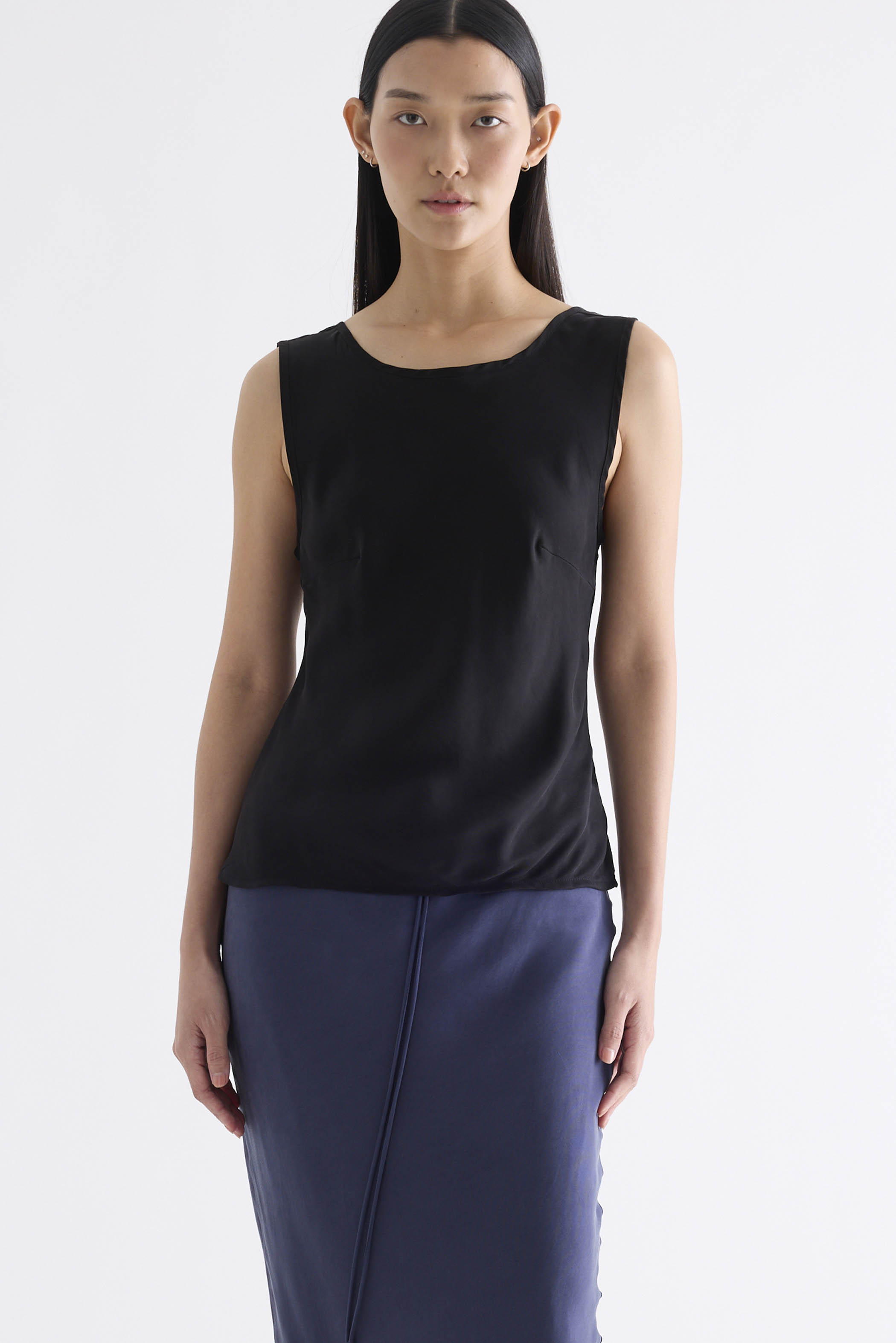 Fluid. Made from smooth and light fabric with a soft sheen, this sleeveless top features a bias silhouette, round neckline and scooped back. Worn in a slim fit.