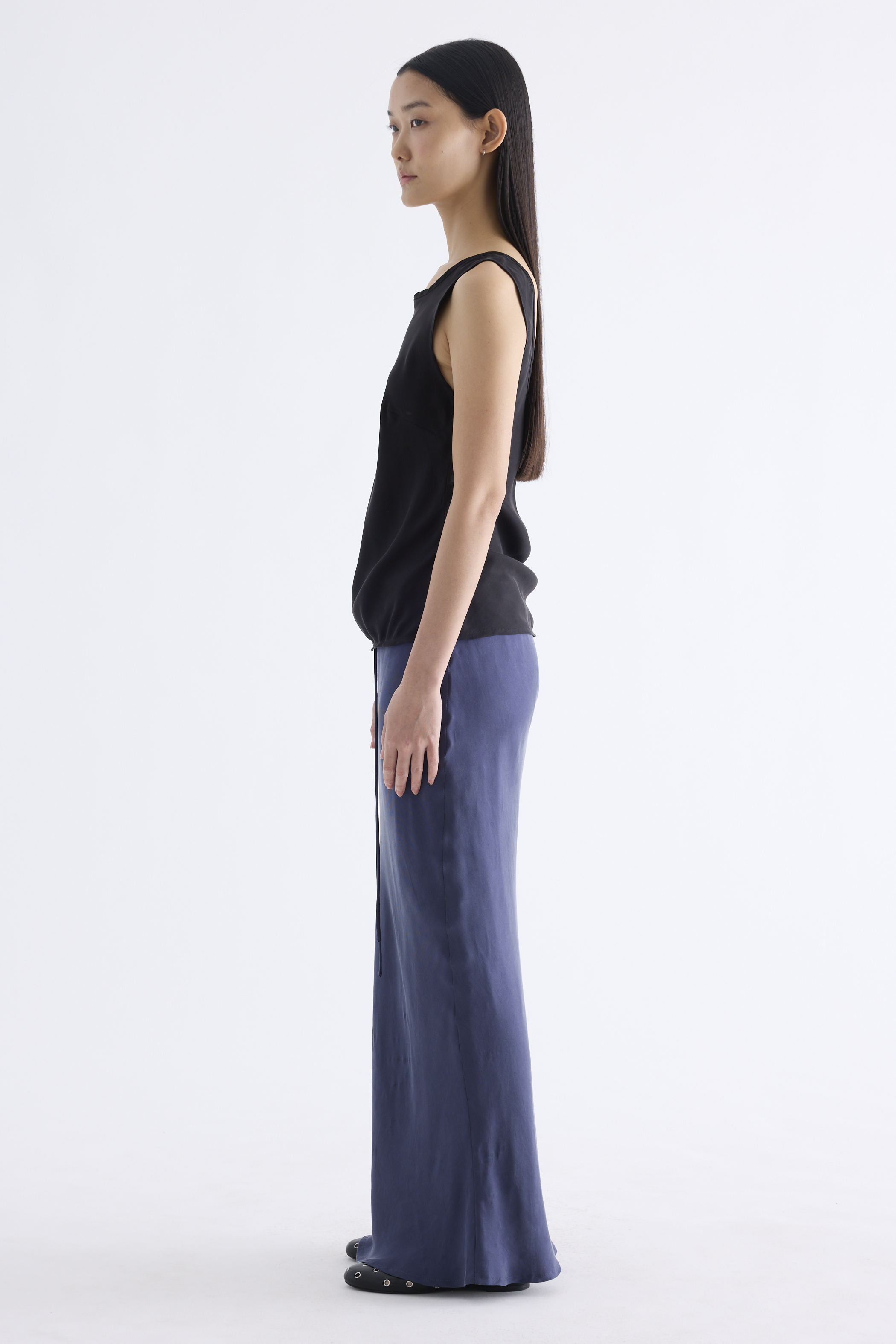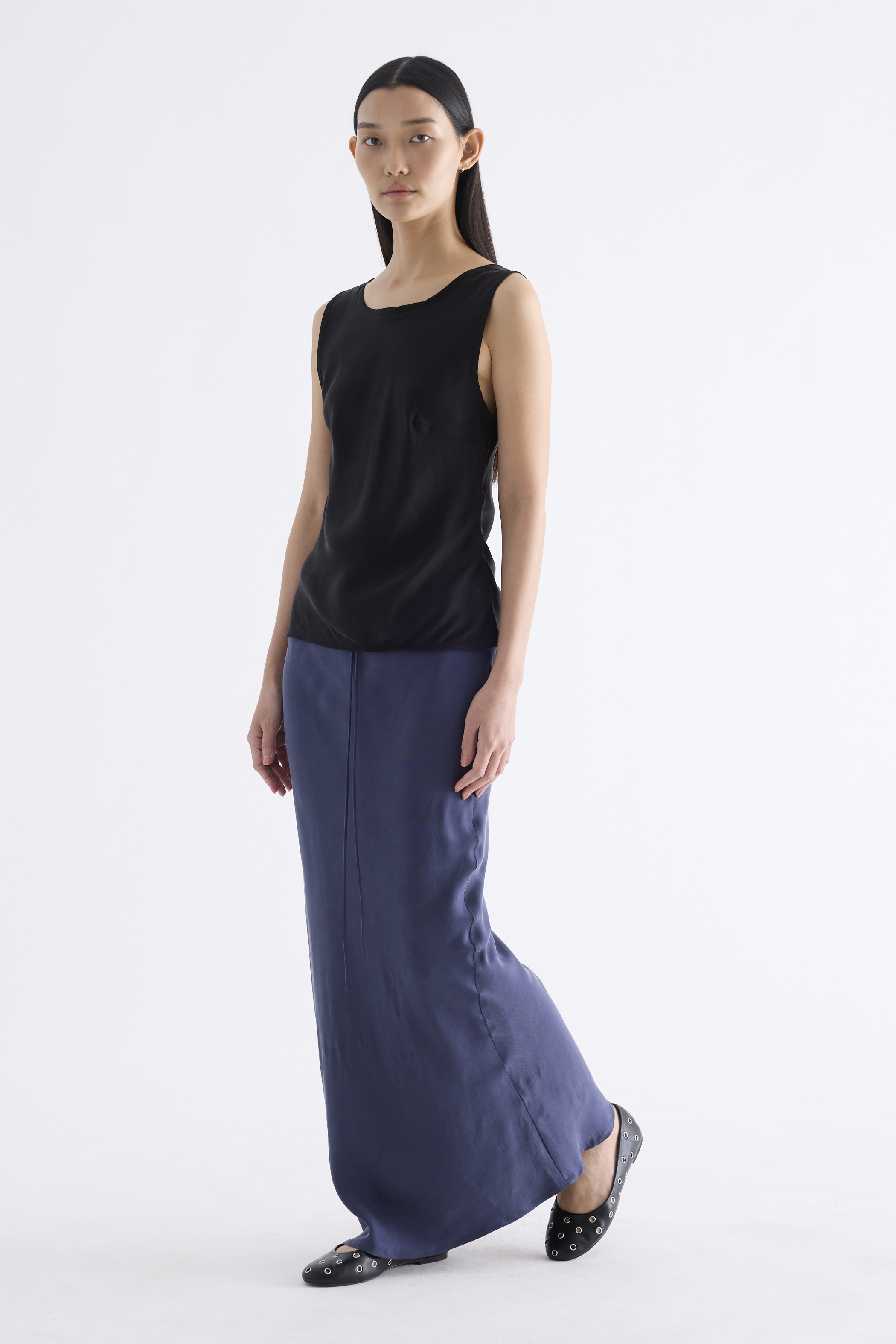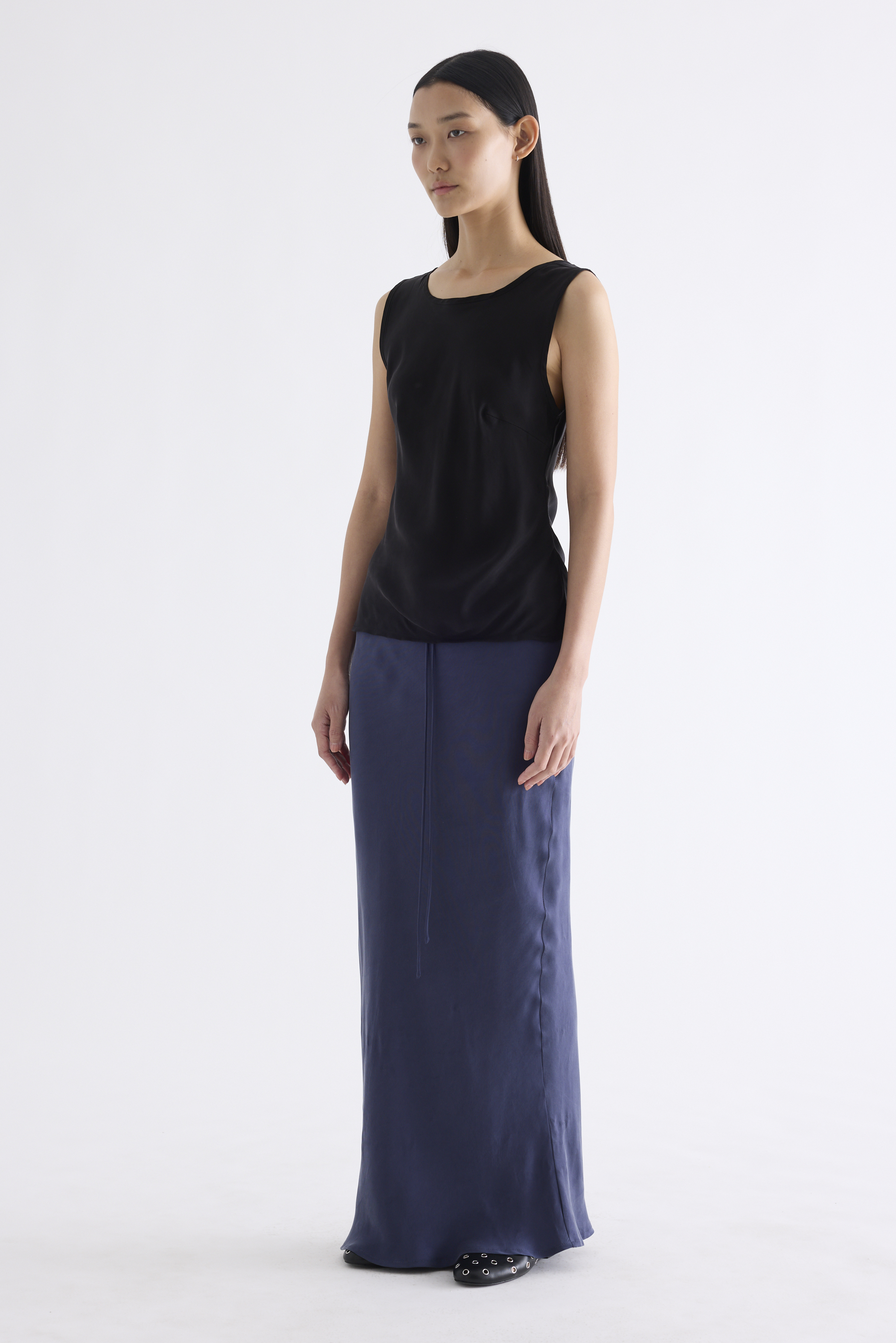 Fluid. Made from smooth and light fabric with a soft sheen, this sleeveless top features a bias silhouette, round neckline and scooped back. Worn in a slim fit.