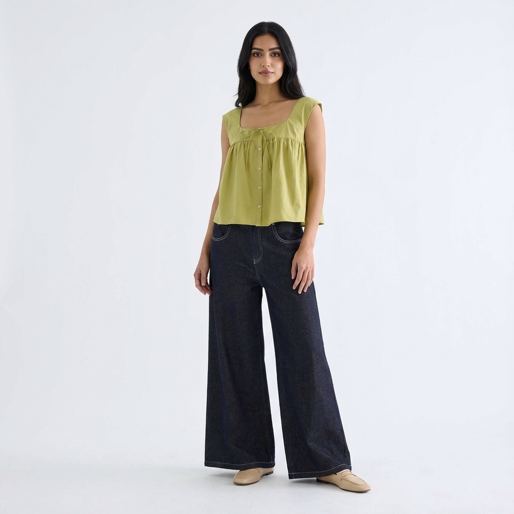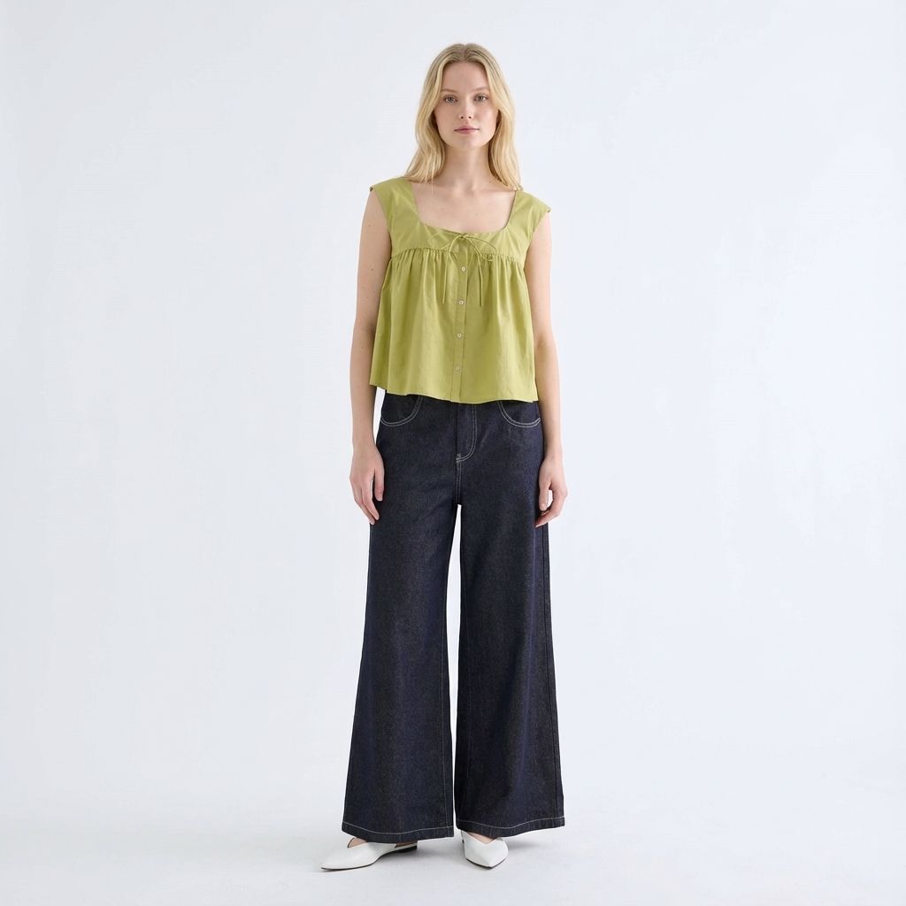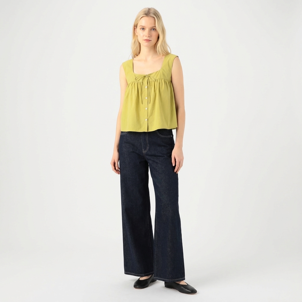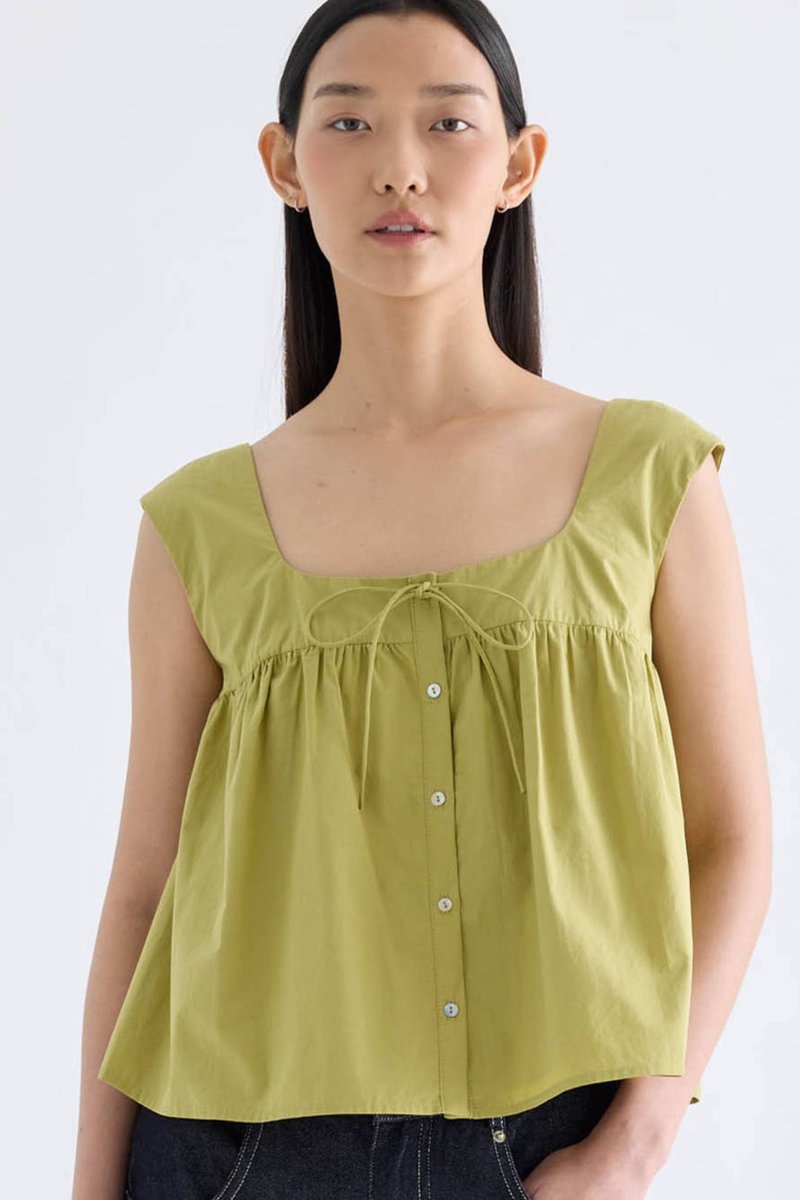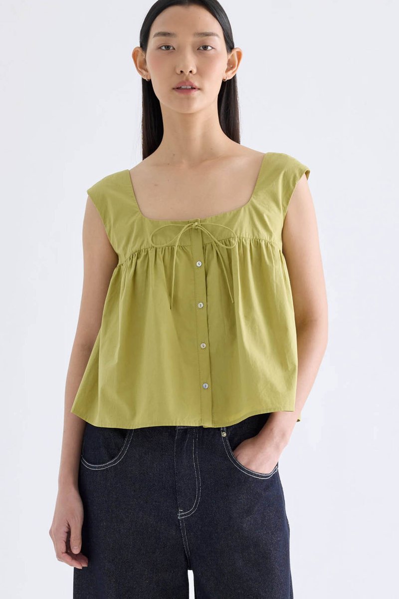 For the love of details. Made from crisp and softly structured cotton, this gathered top features a square neckline with a front tie-strap, cap sleeves and a button-down front. Fits relaxed in a flared silhouette.