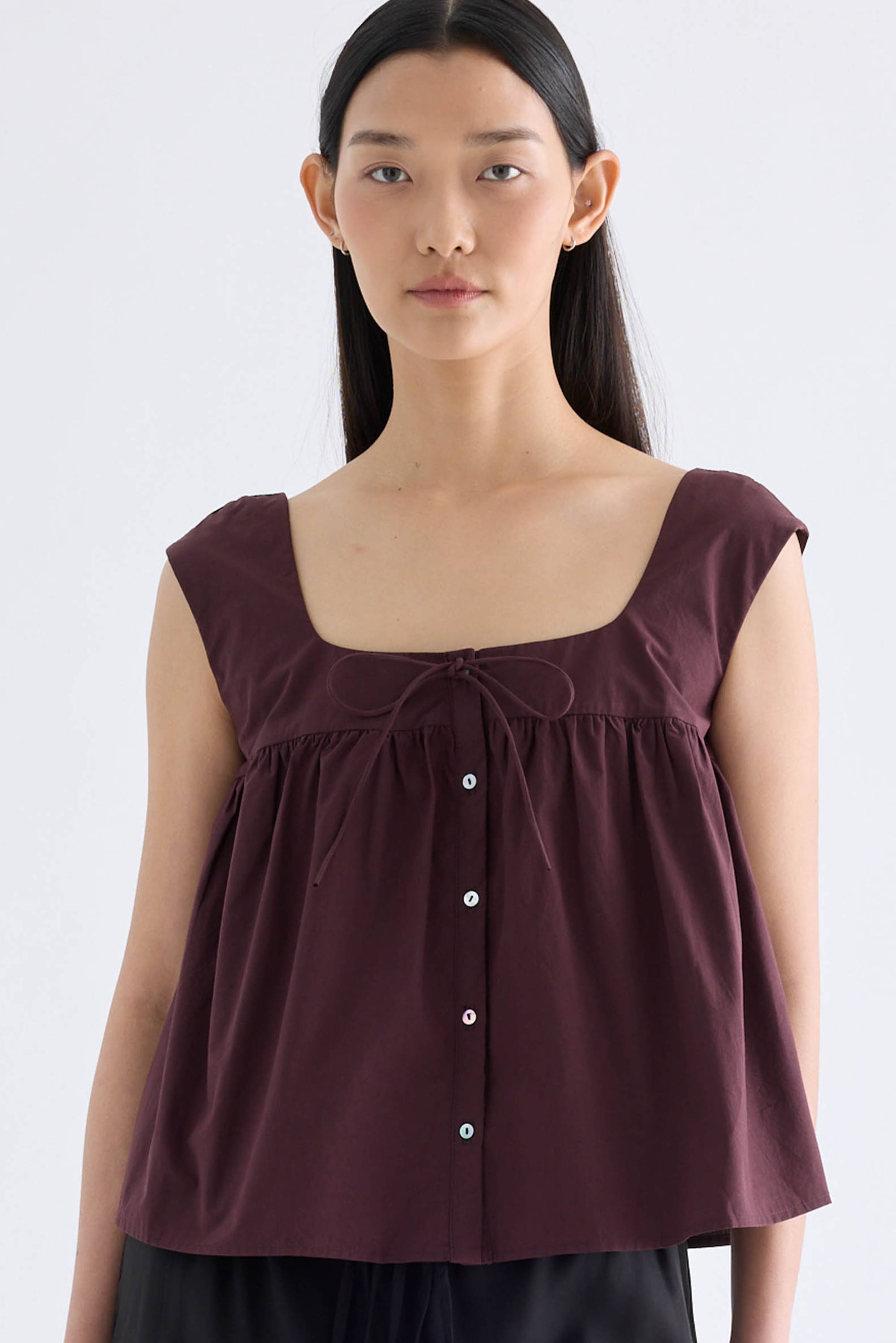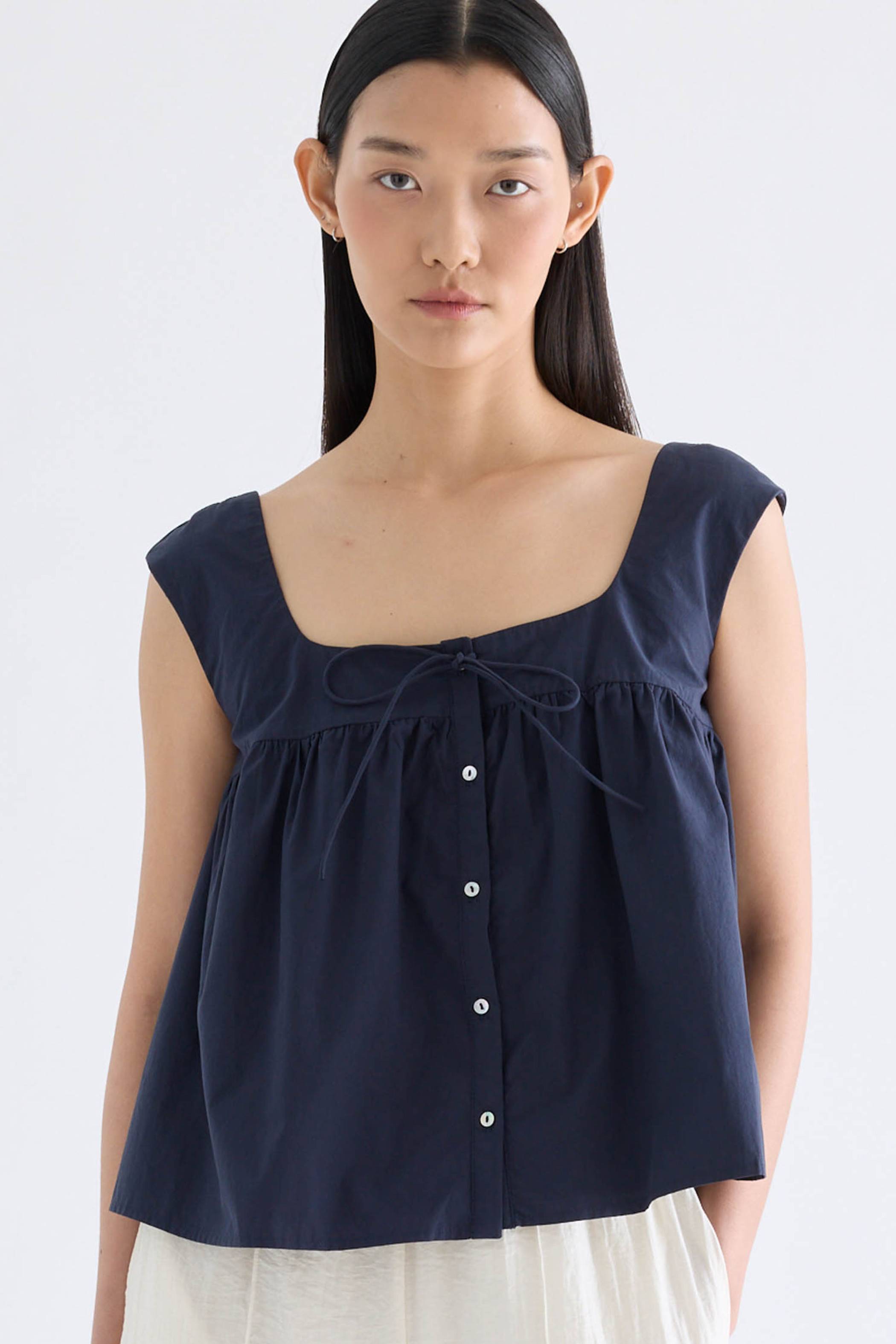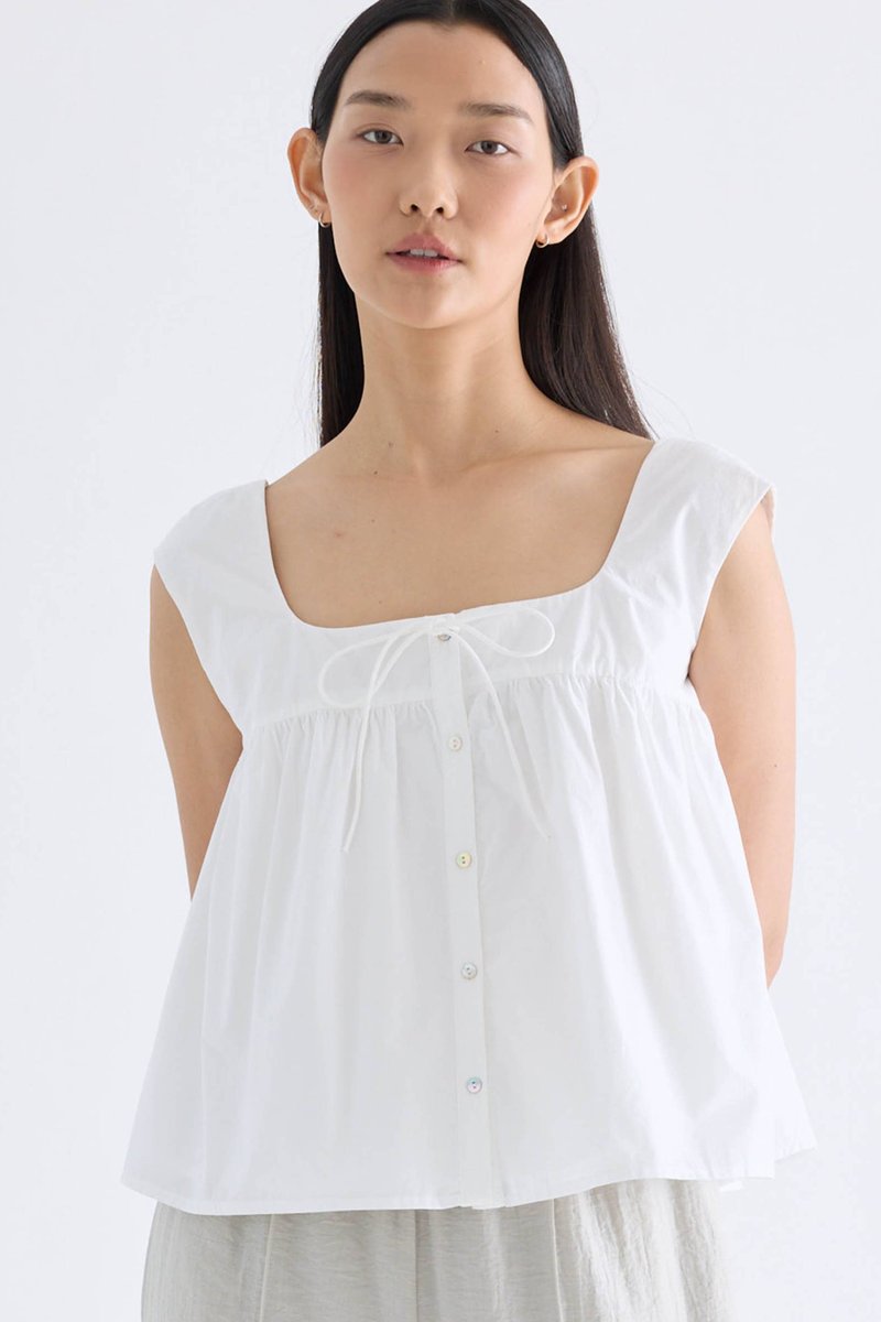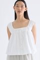 For the love of details. Made from crisp and softly structured cotton, this gathered top features a square neckline with a front tie-strap, cap sleeves and a button-down front. Fits relaxed in a flared silhouette.