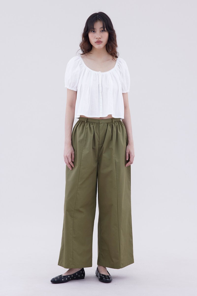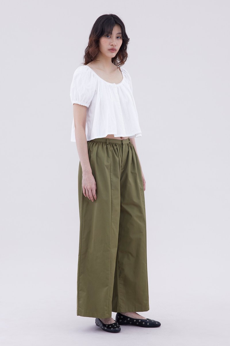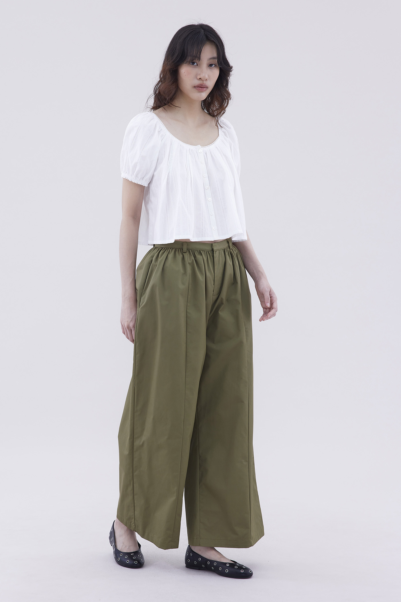 Go big or go home. Cut from crisp and softly structured cotton, these high-rise pants feature gathered wide legs, belt loops, and a front zip and buckle closure. Worn in a relaxed fit.