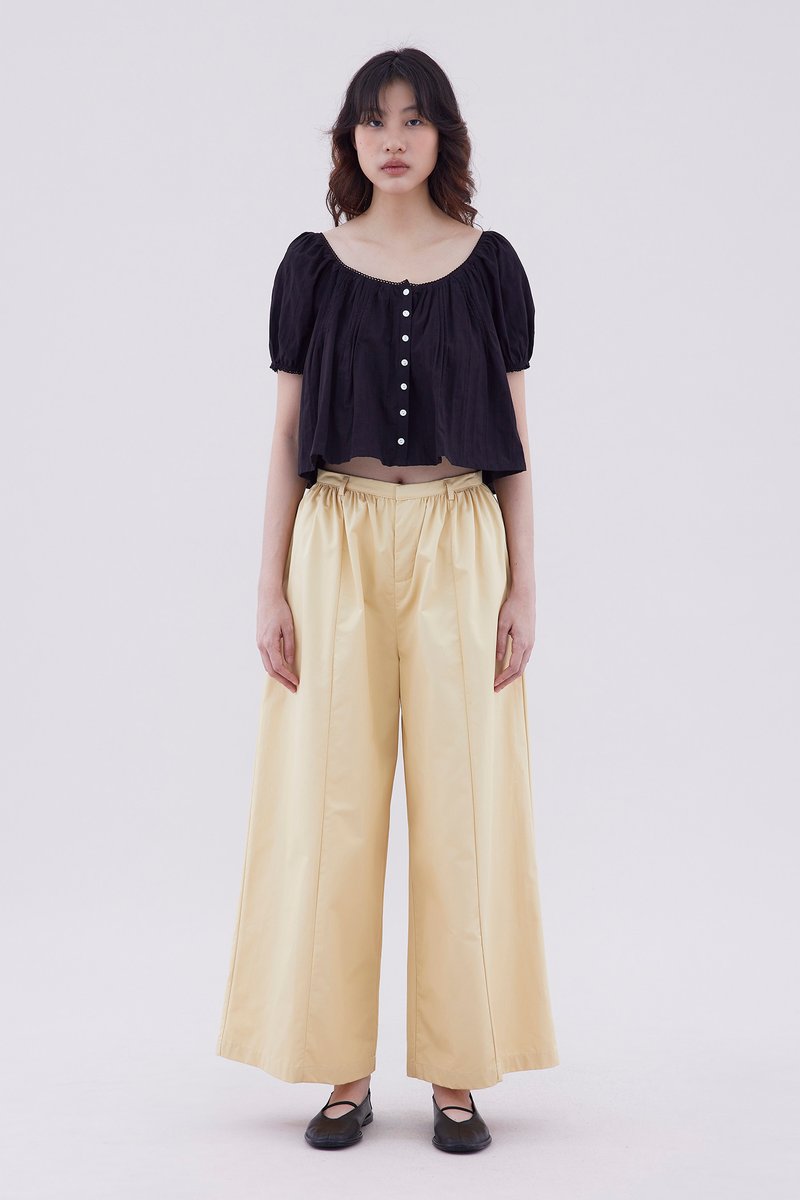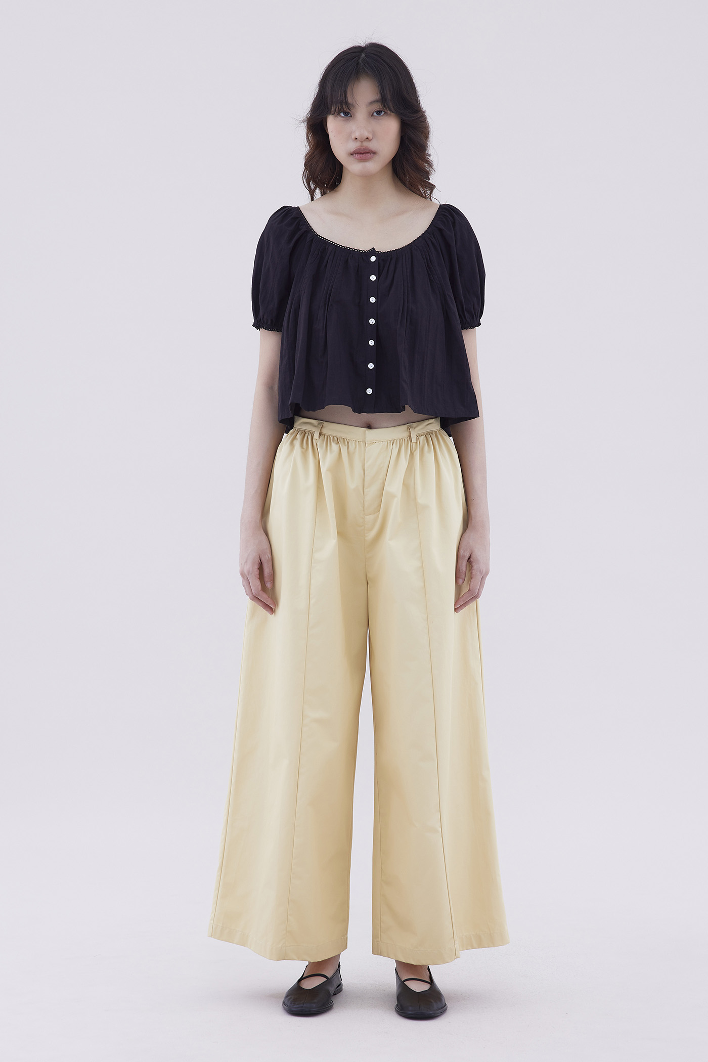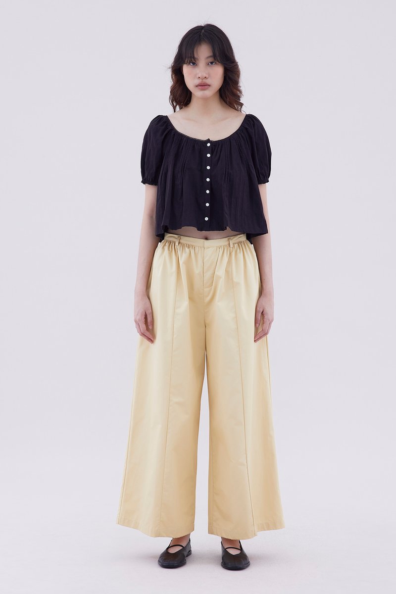 Go big or go home. Cut from crisp and softly structured cotton, these high-rise pants feature gathered wide legs, belt loops, and a front zip and buckle closure. Worn in a relaxed fit.