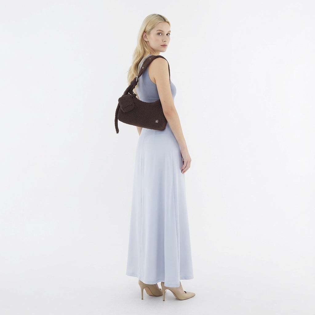 From The Editor’s Market’s first bag line comes our debut piece, Jil — a medium-sized, everyday shoulder bag available in three different fabrics: nylon, metallic and teddy. The teddy version is crafted from cosy, furry fabric that is lightly padded for a gently structured finish. Features include a top zip closure, an inner pocket, polished metal hardware, an adjustable buckle strap, as well as a detachable snap pouch: Jac. Each bag also comes with a silver dust bag.