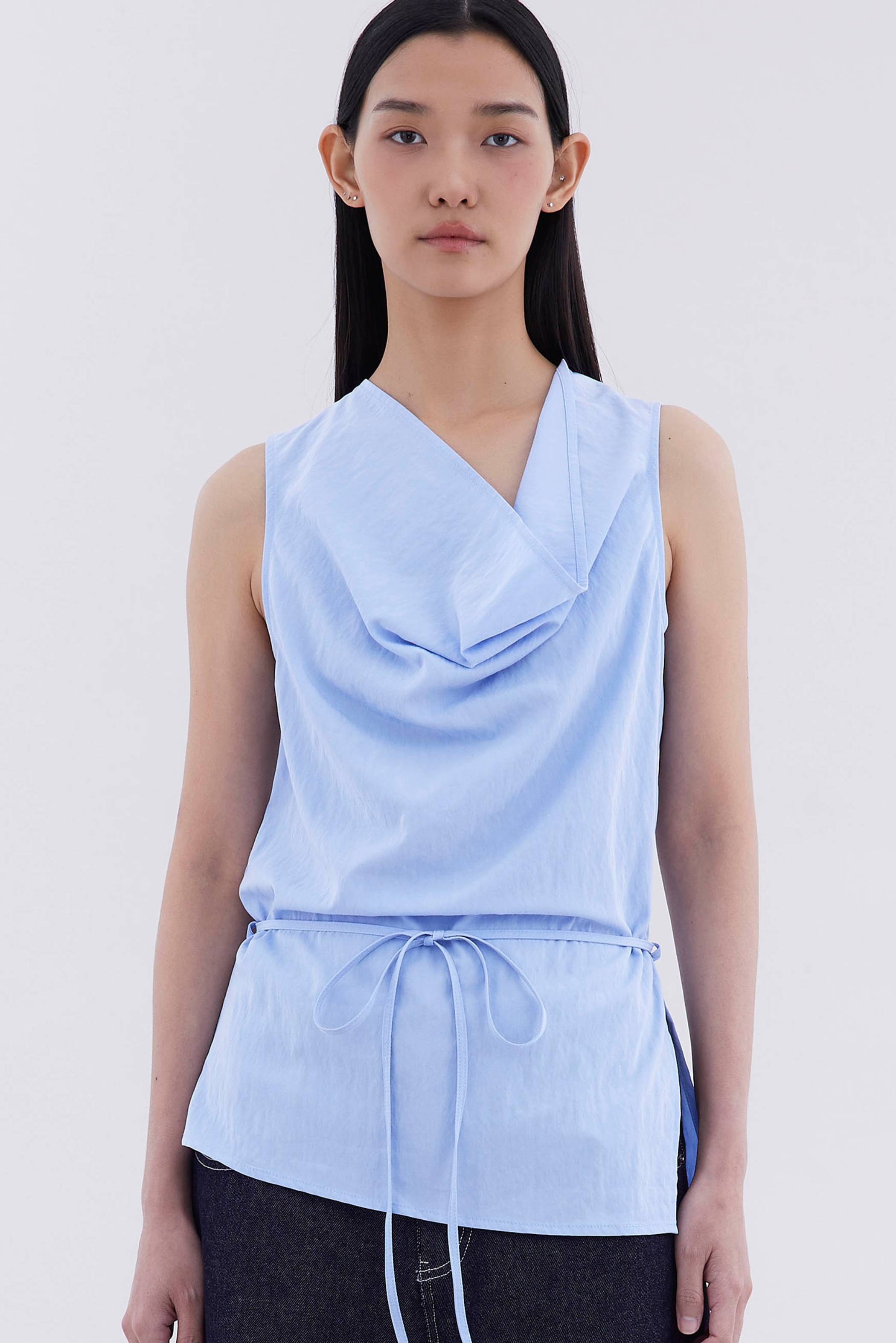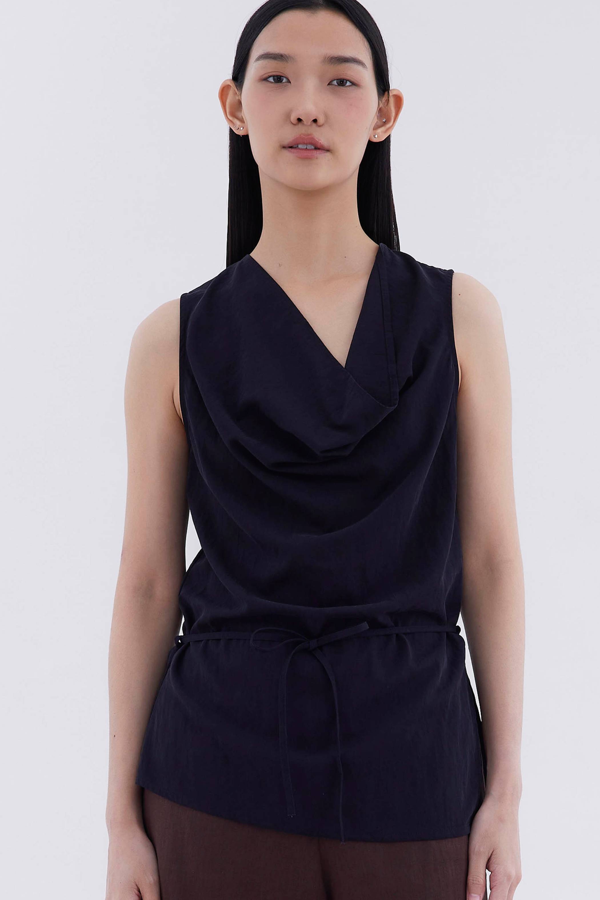 Bold statement. Made from light and smooth fabric, this sleeveless top features a cowl neckline, removable waist tie-strap and side zip closure. Worn in a relaxed fit.