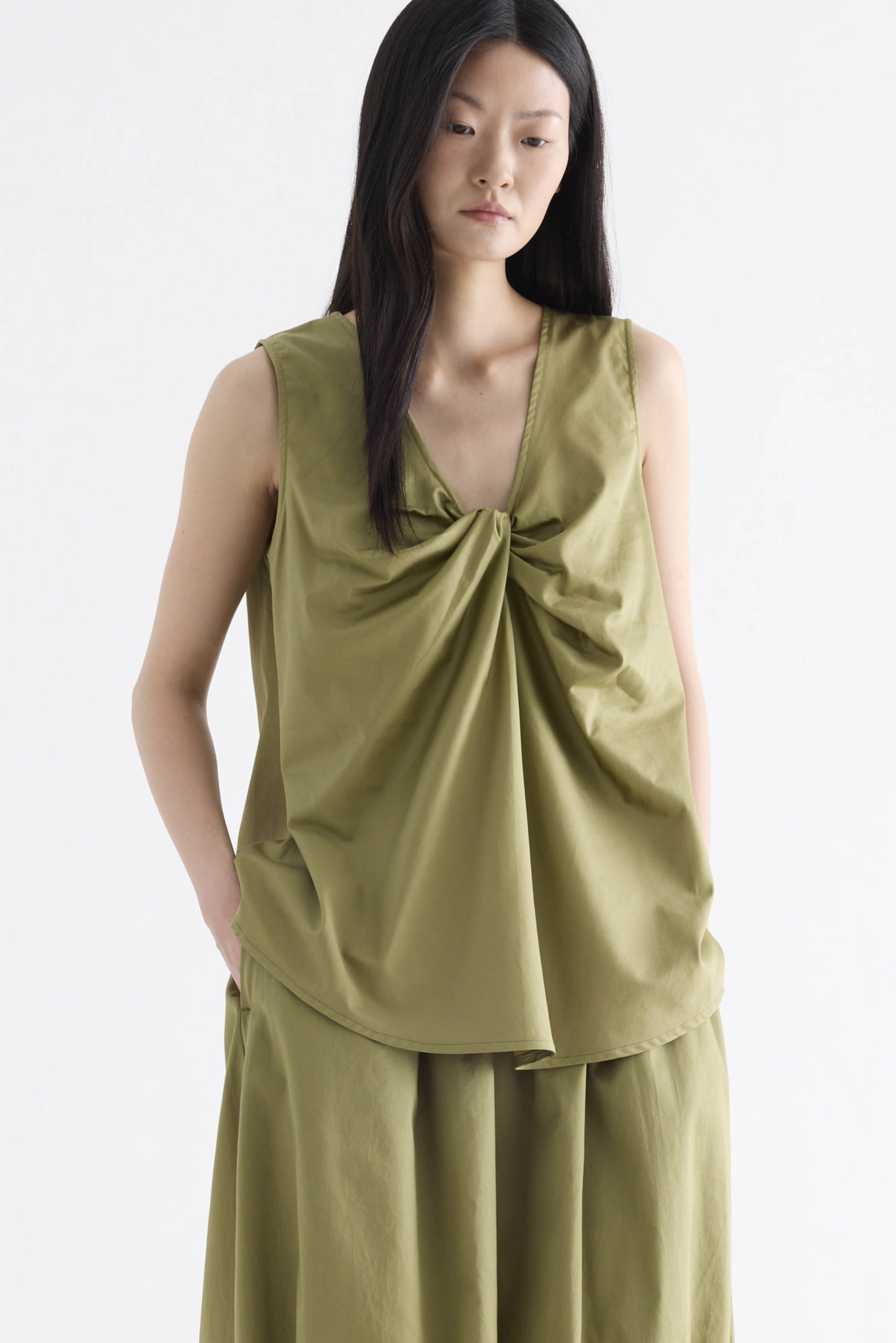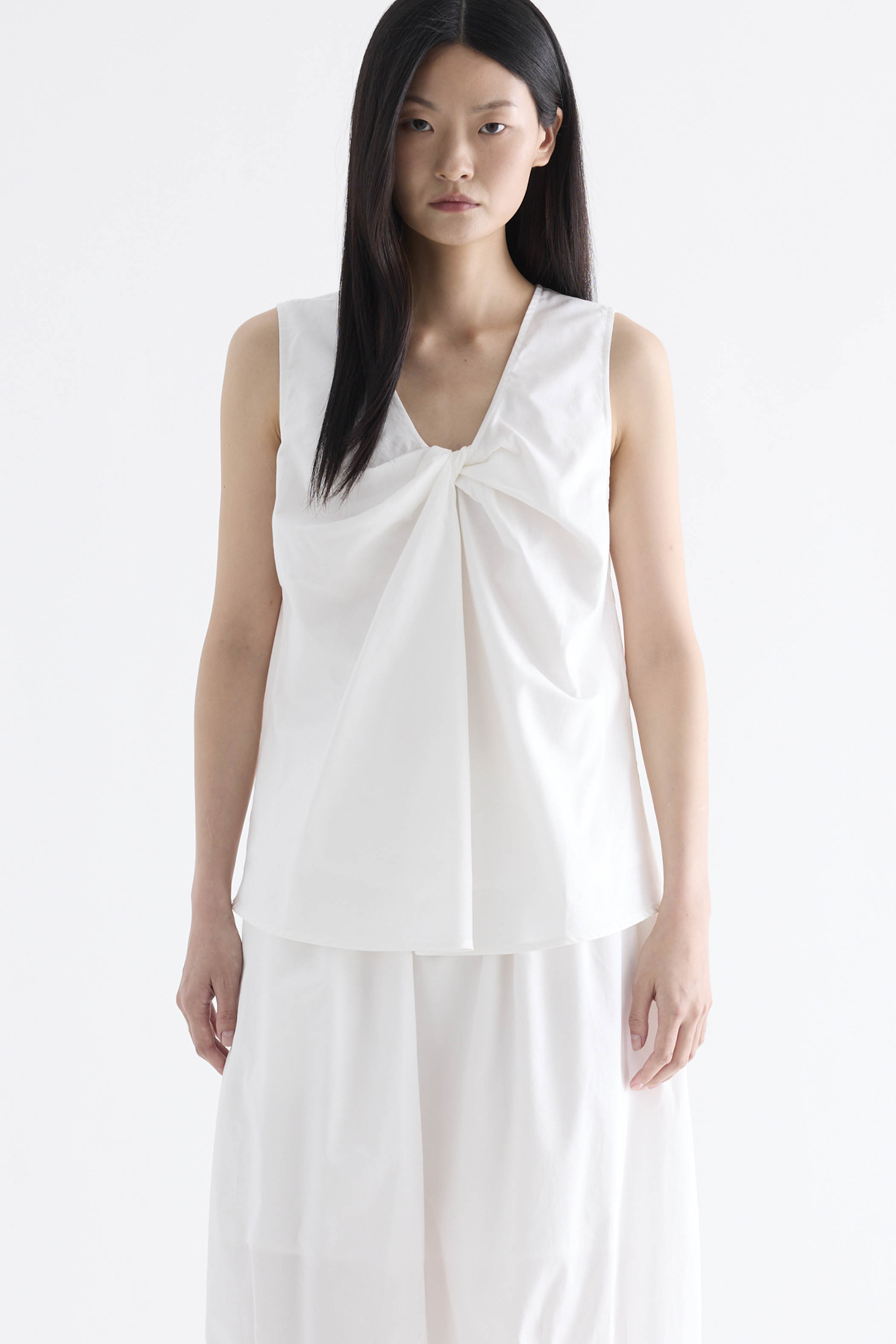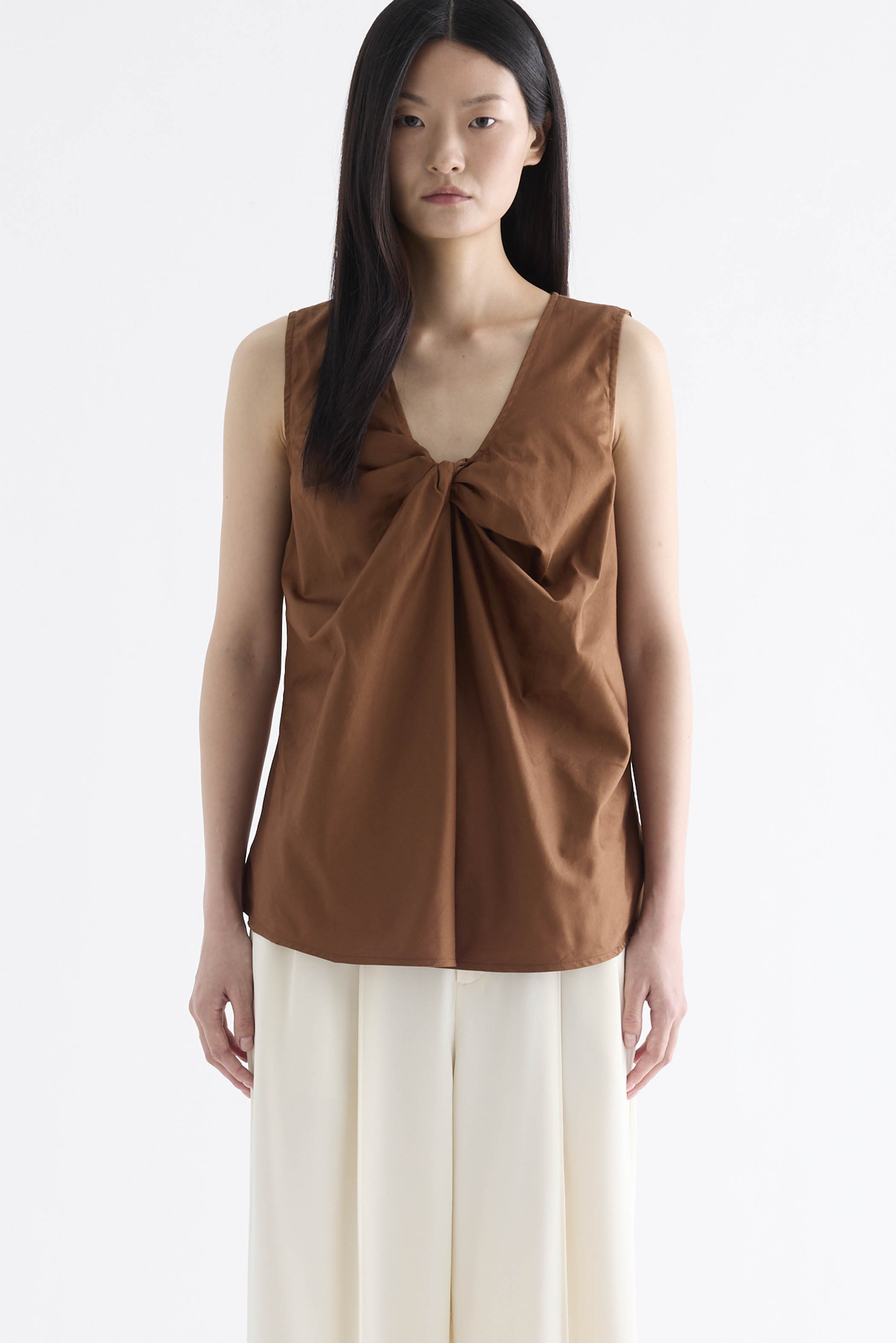 From the Postscript collection. Cut from fully lined cotton with a light and crisp finish, this sleeveless top features a V-neckline with a statement front twist, and a gently flared silhouette. Worn in a relaxed fit.