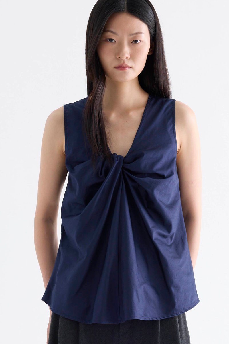 From the Postscript collection. Cut from fully lined cotton with a light and crisp finish, this sleeveless top features a V-neckline with a statement front twist, and a gently flared silhouette. Worn in a relaxed fit.