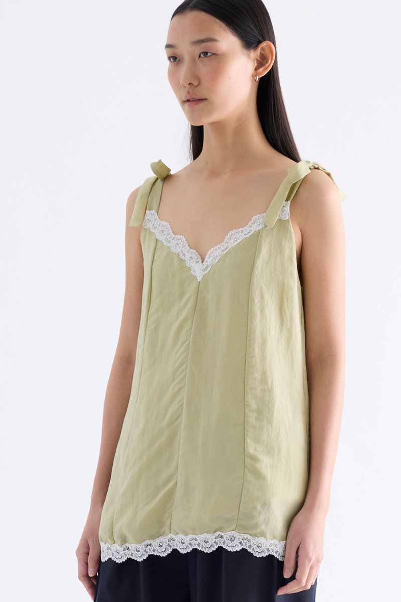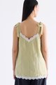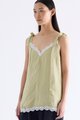 Go to new lengths. Made from light fabric with a soft sheen, this longline slip top features a lace-trimmed V-neckline, self-tying shoulder straps and a panelled construction. Worn in a relaxed fit.