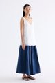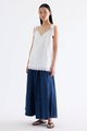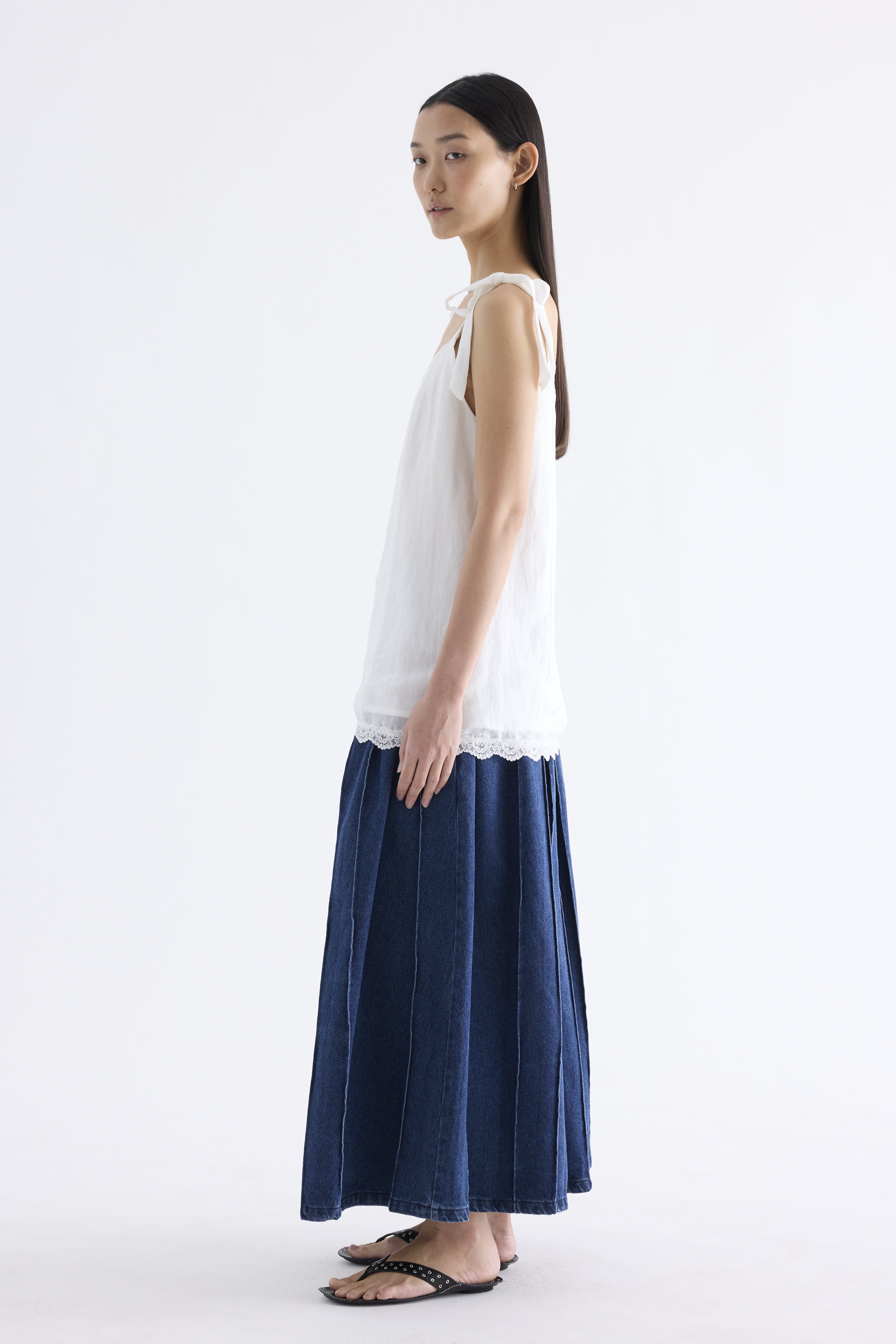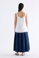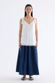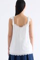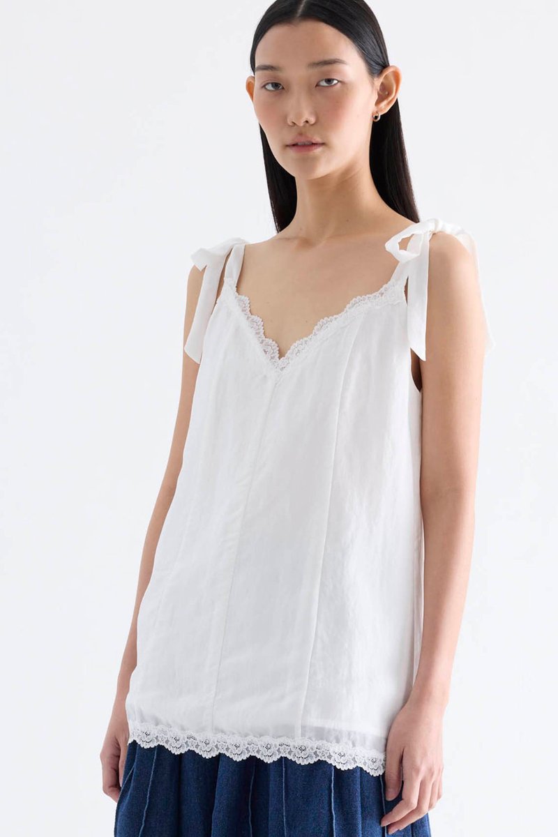 Go to new lengths. Made from light fabric with a soft sheen, this longline slip top features a lace-trimmed V-neckline, self-tying shoulder straps and a panelled construction. Worn in a relaxed fit.