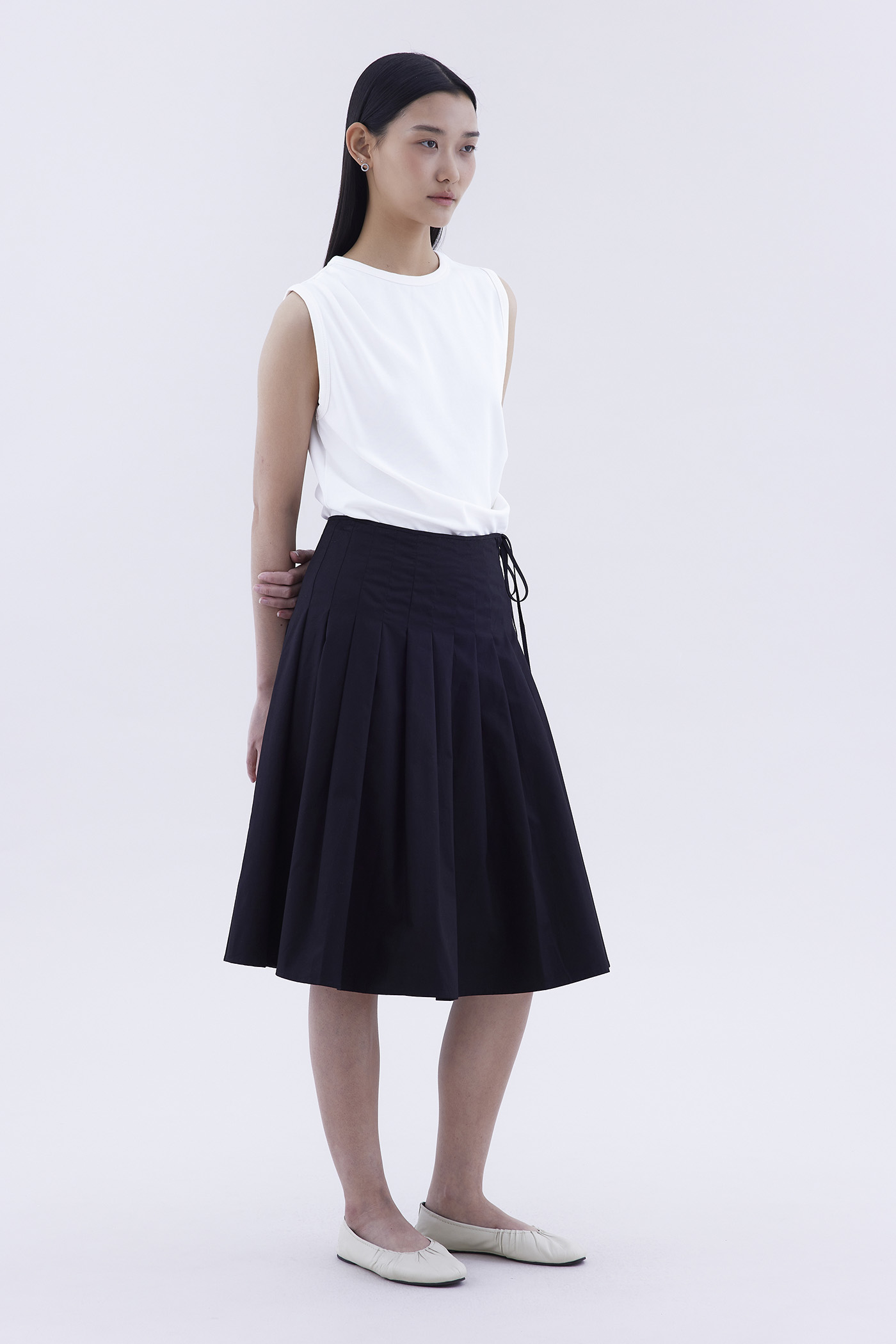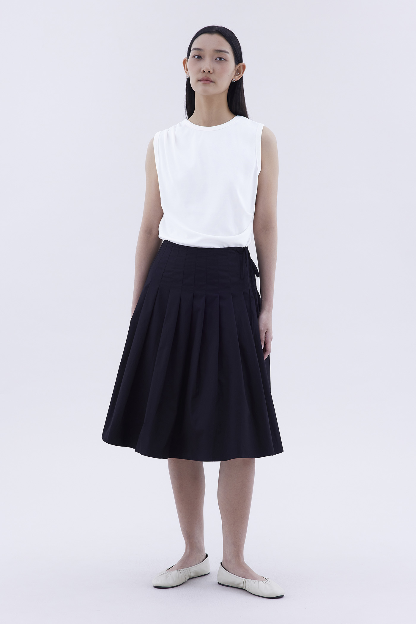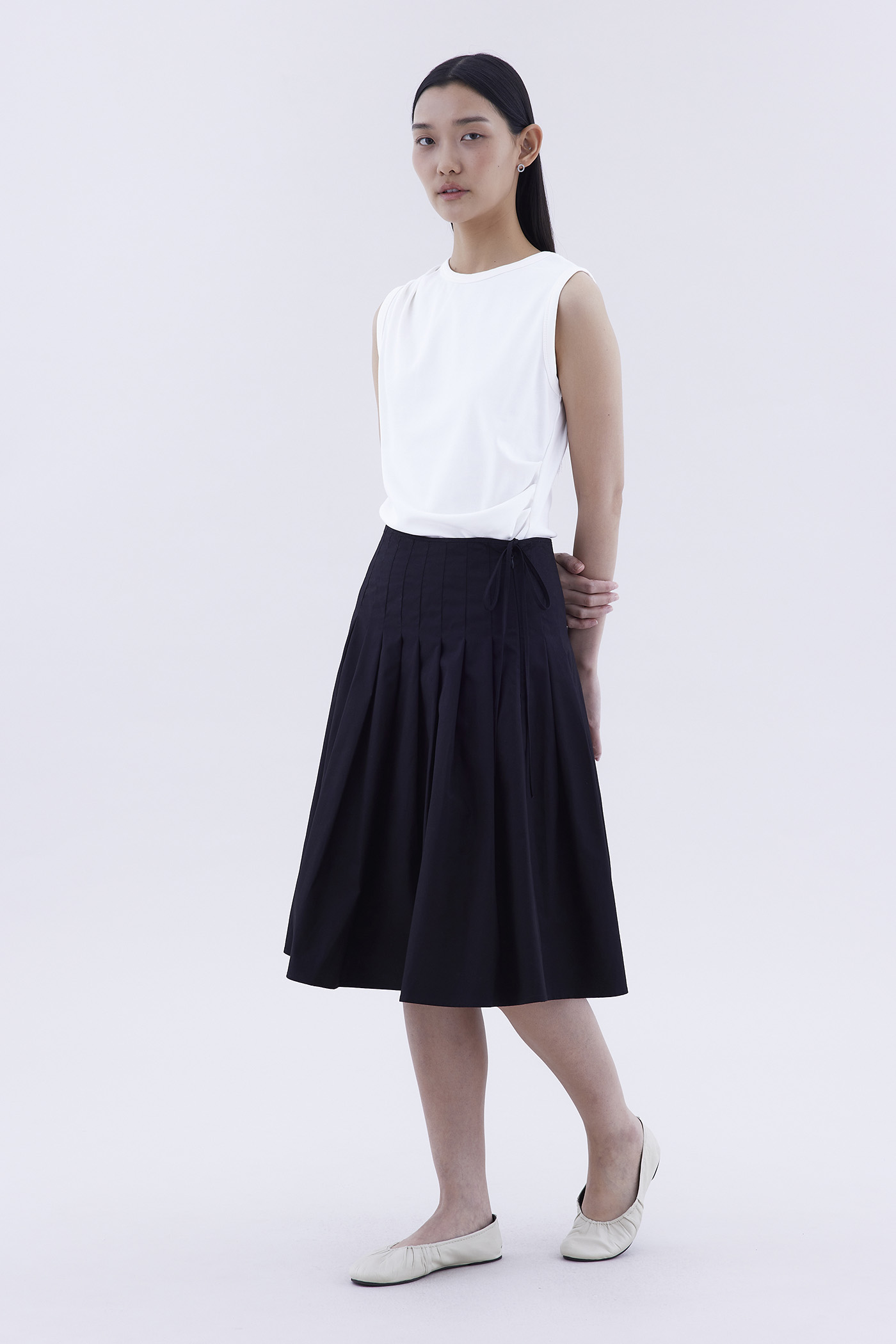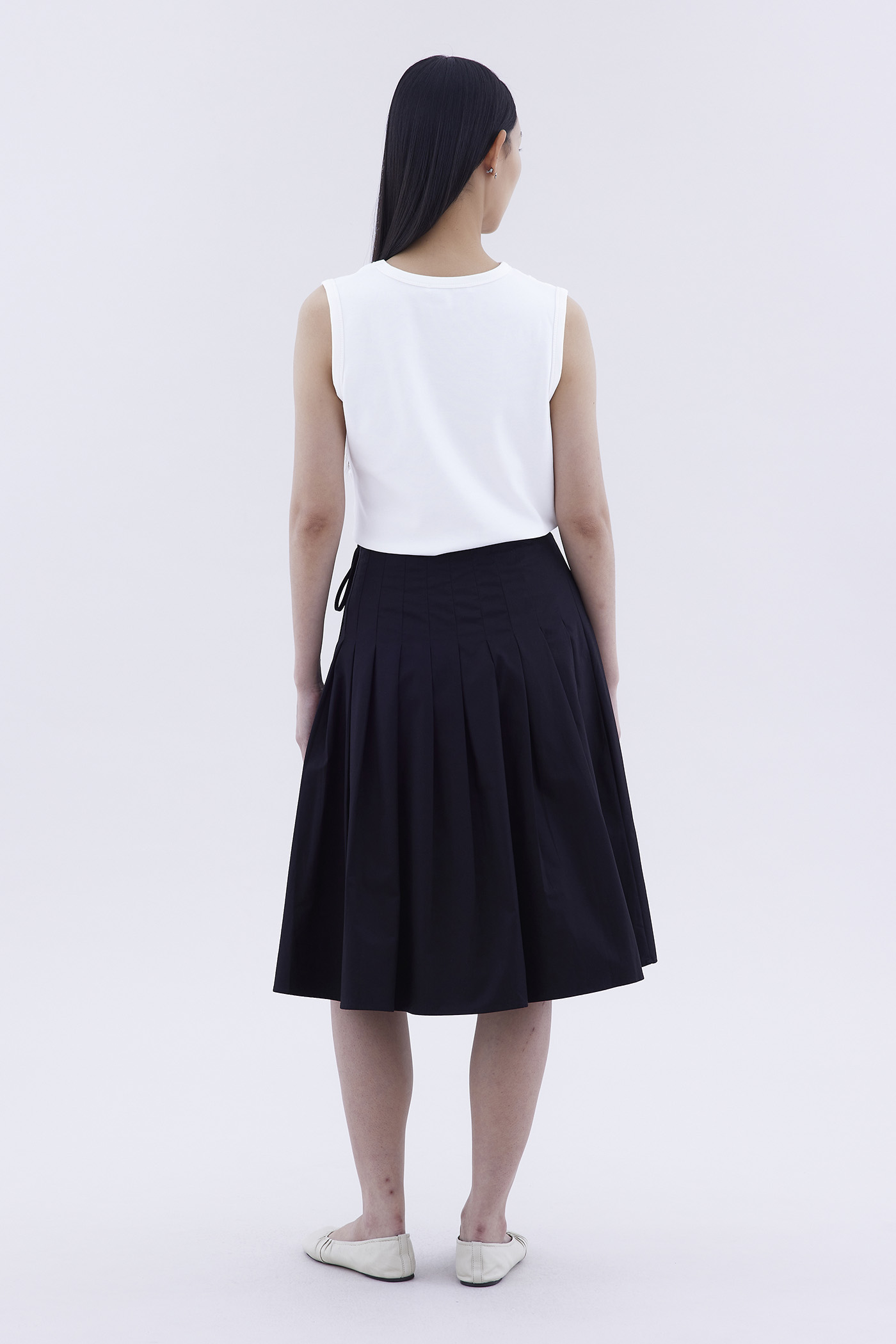 Feeling preppy. Made from crisp and softly structured cotton, this knee-length skirt features pleats, a waist tie-strap and a side zip closure. Fits slim in an A-line silhouette.