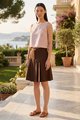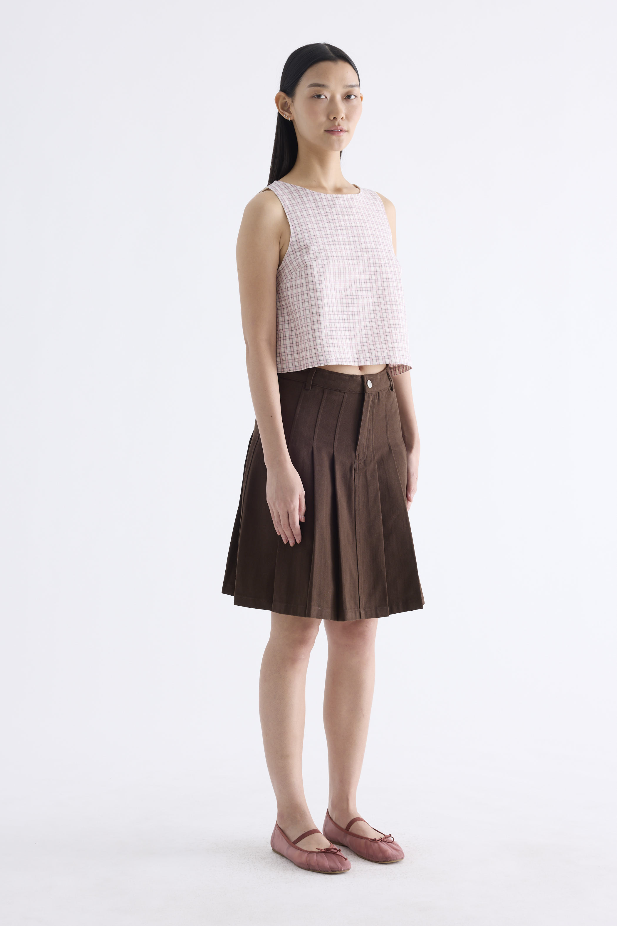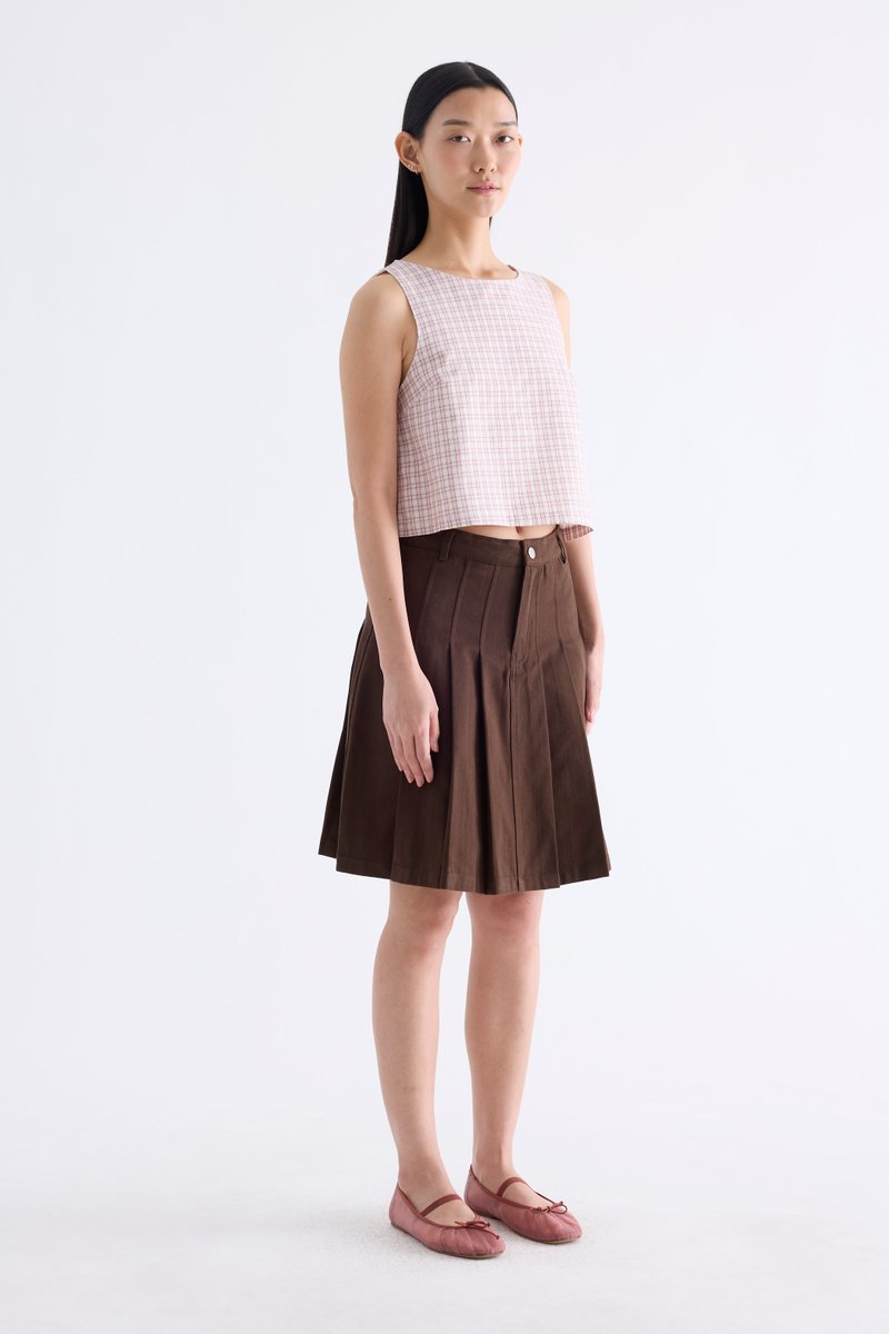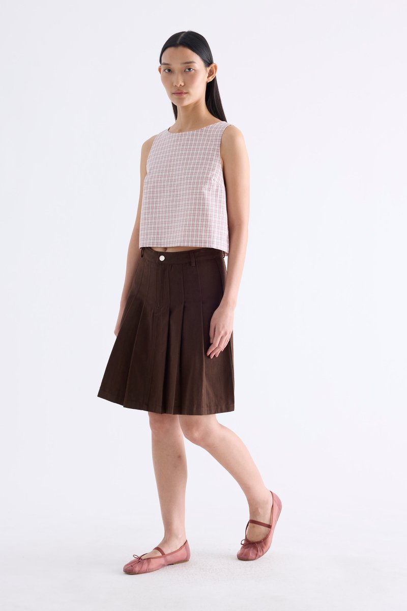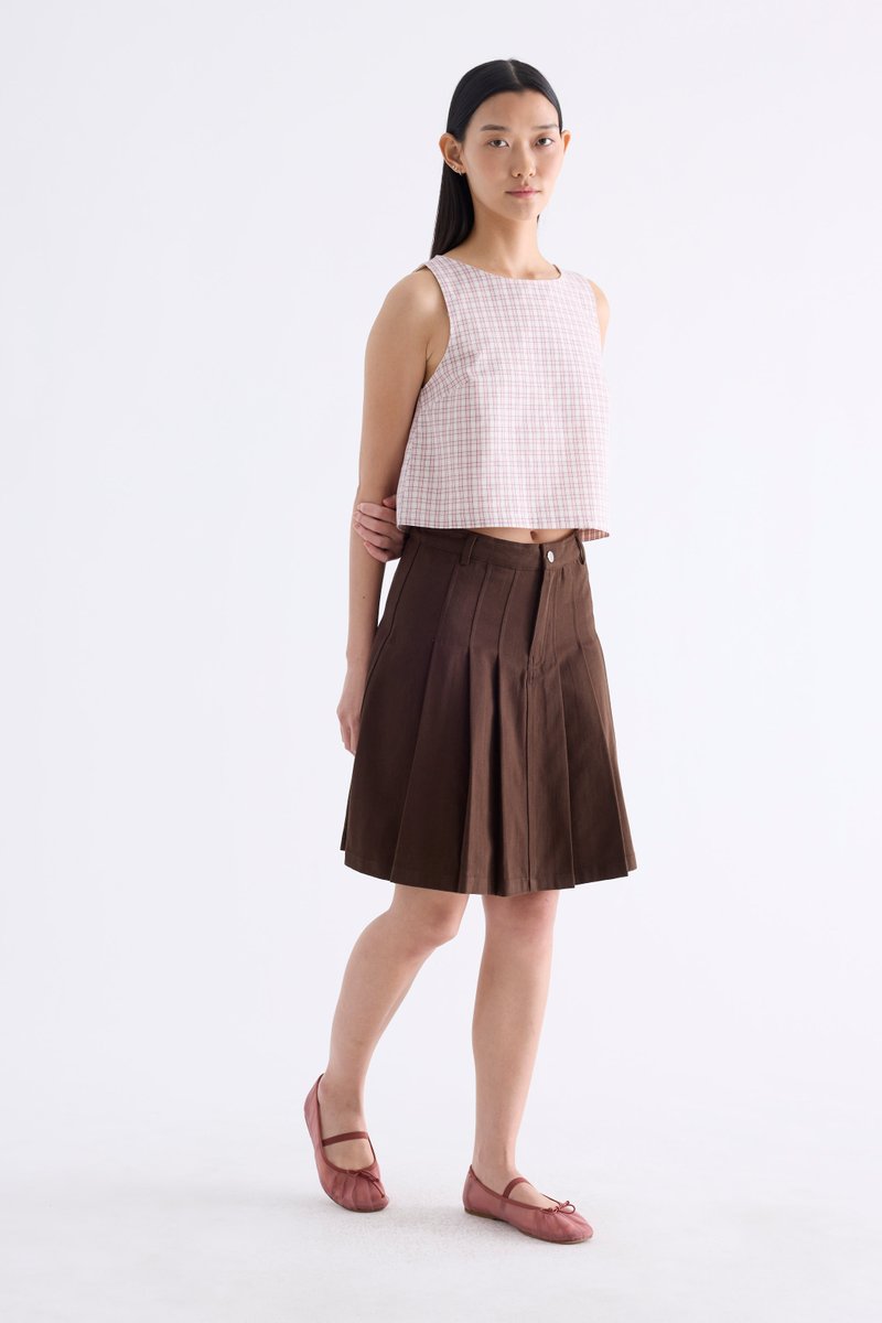 Feeling preppy. Made from softly structured cotton denim, this knee-length skirt features pleats, belt loops, and a front zip and button closure. Fits slim in an A-line silhouette.