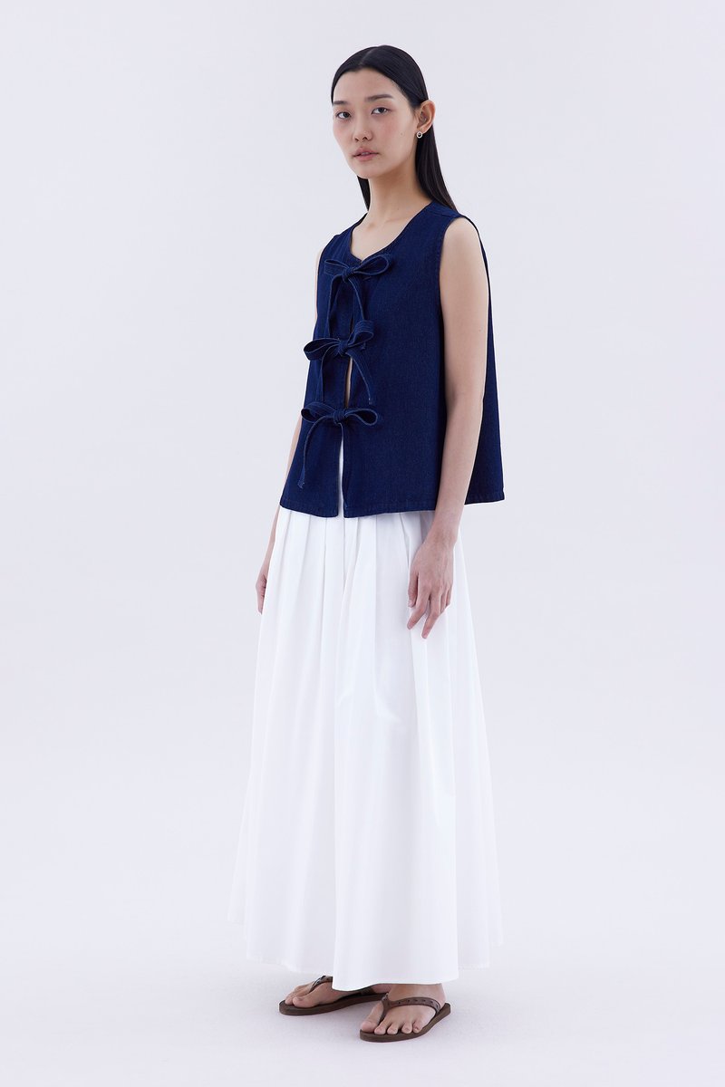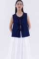 Bold and blue. Cut from softly structured cotton denim, this sleeveless top features a round neckline and an open front with tie-strap closures. Worn in a slim fit.