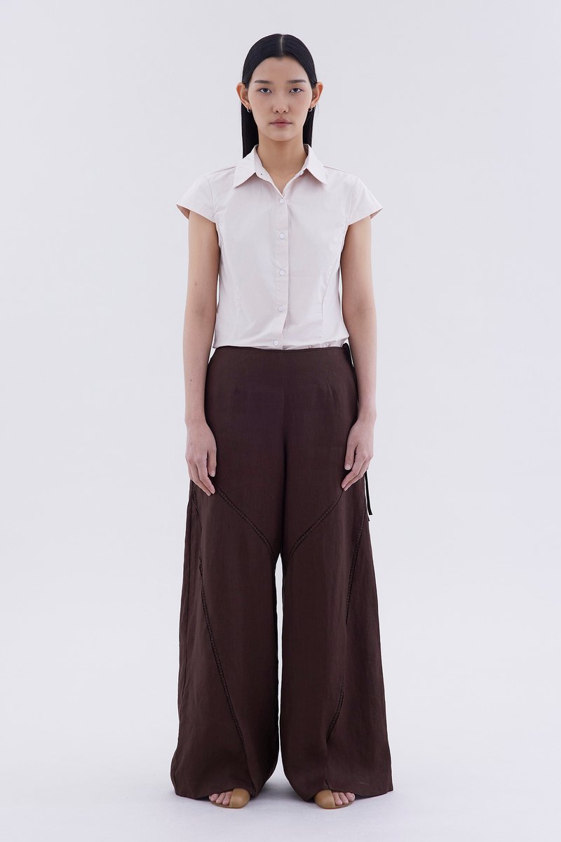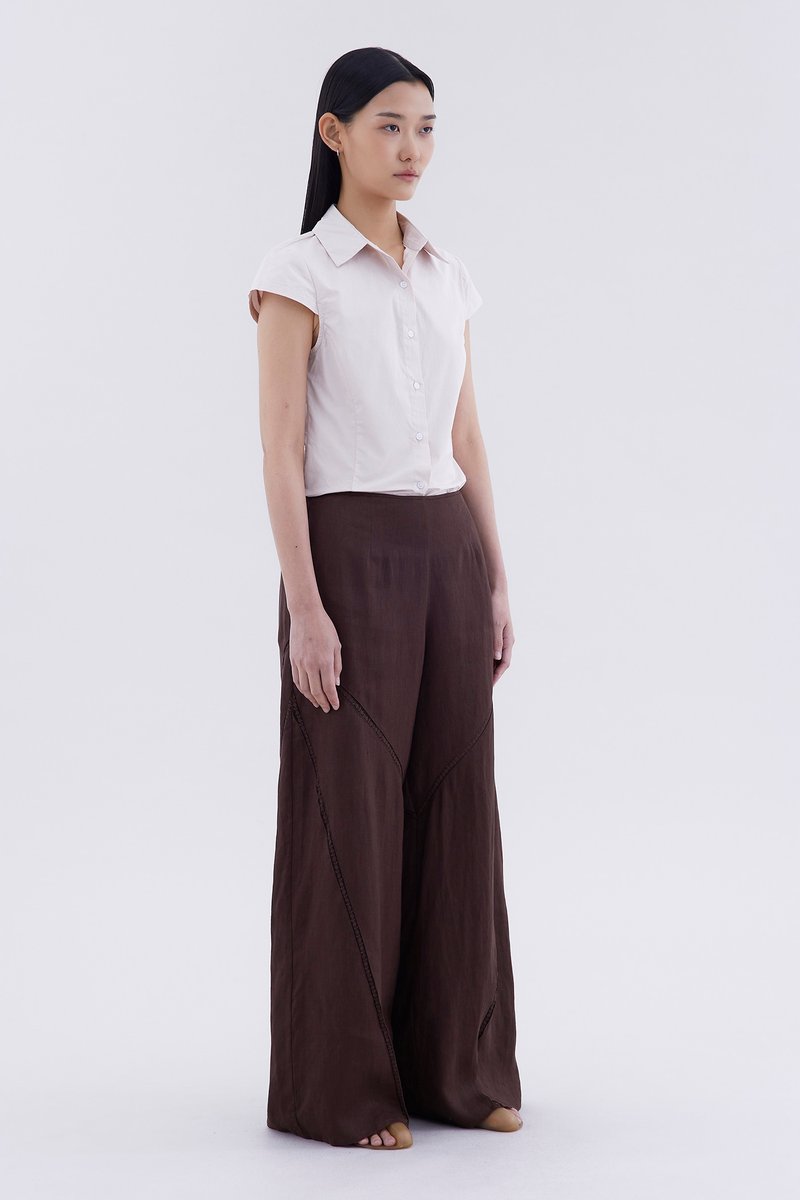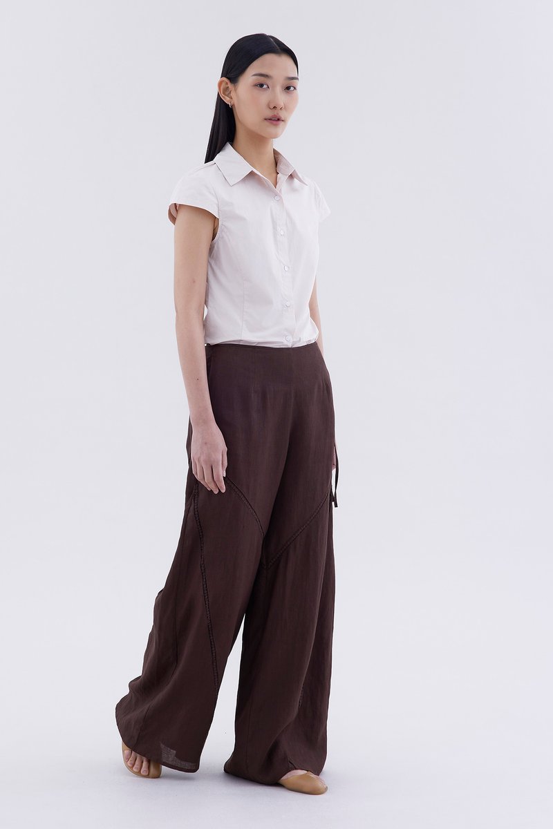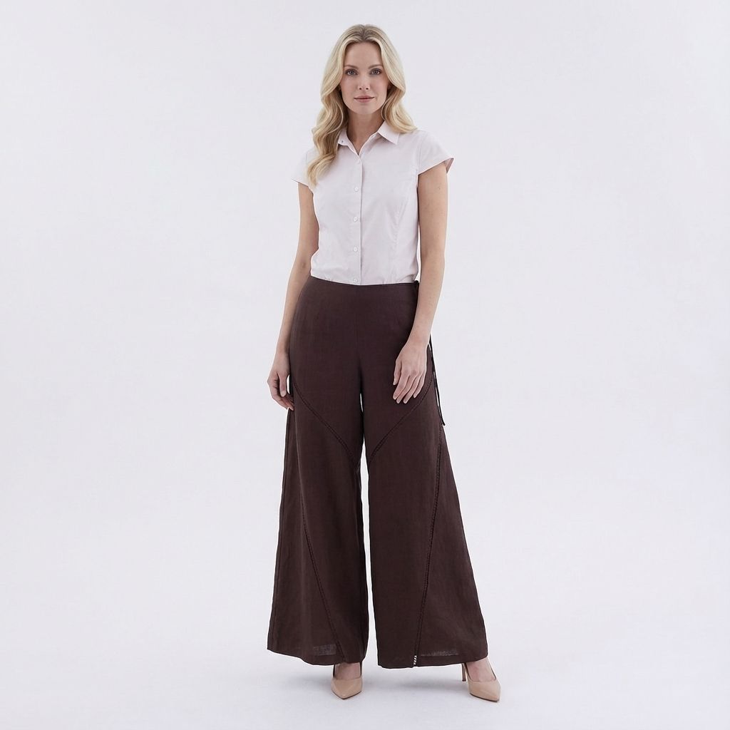 Details that count. Cut from airy and gently tailored 100% linen, these pants feature angled lace-trimmed panels, wide straight legs, as well as a seamless waist with a tie-strap and side zip closure.