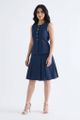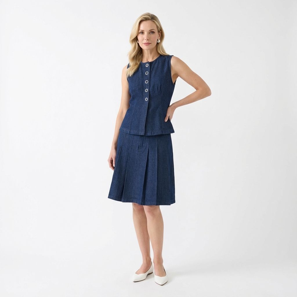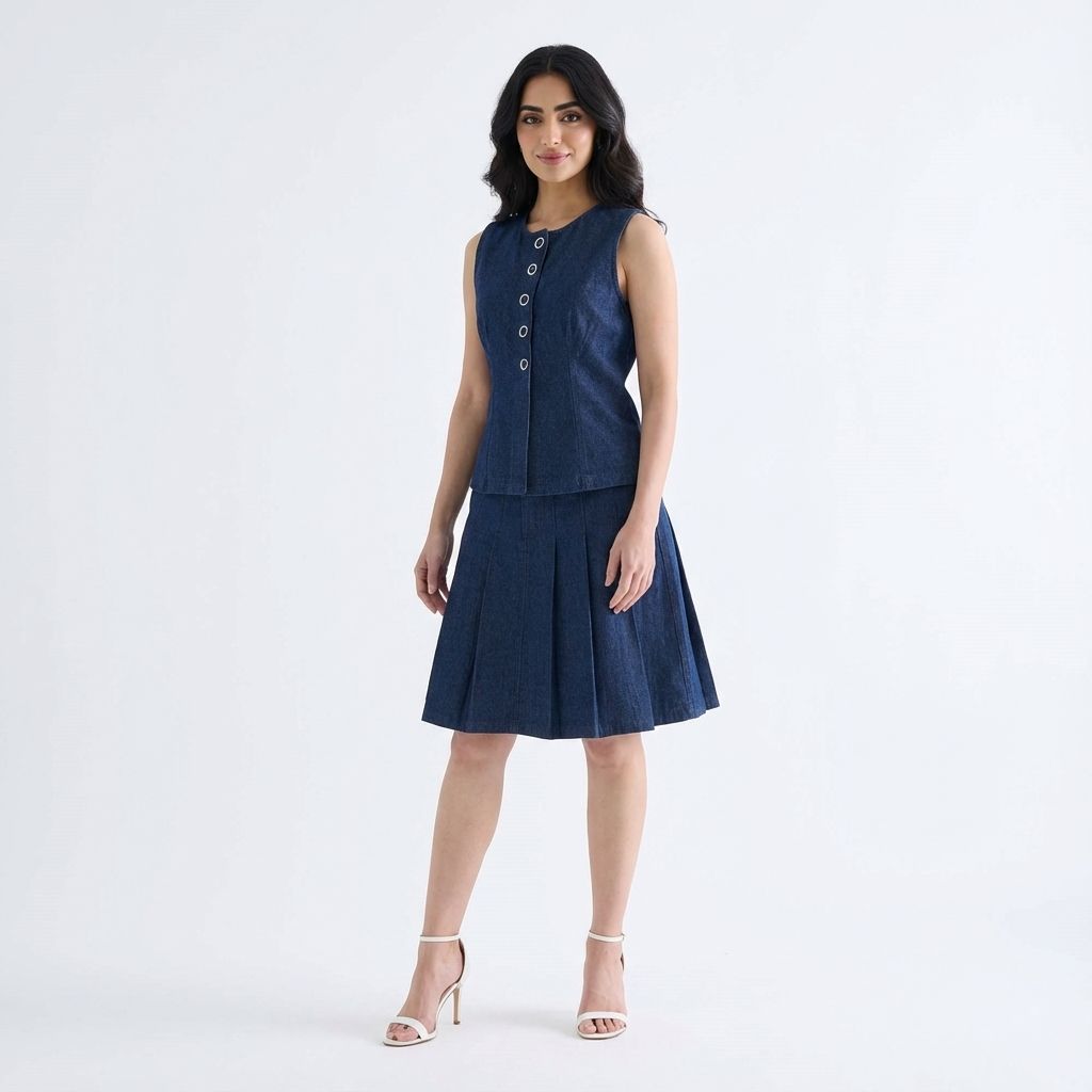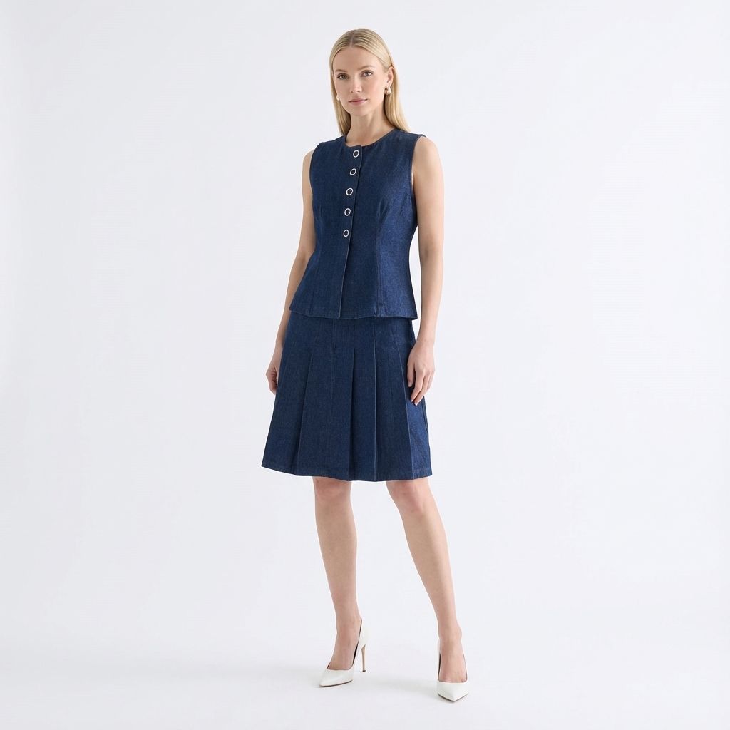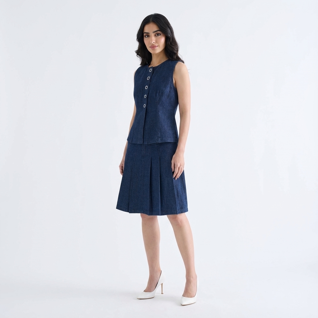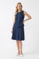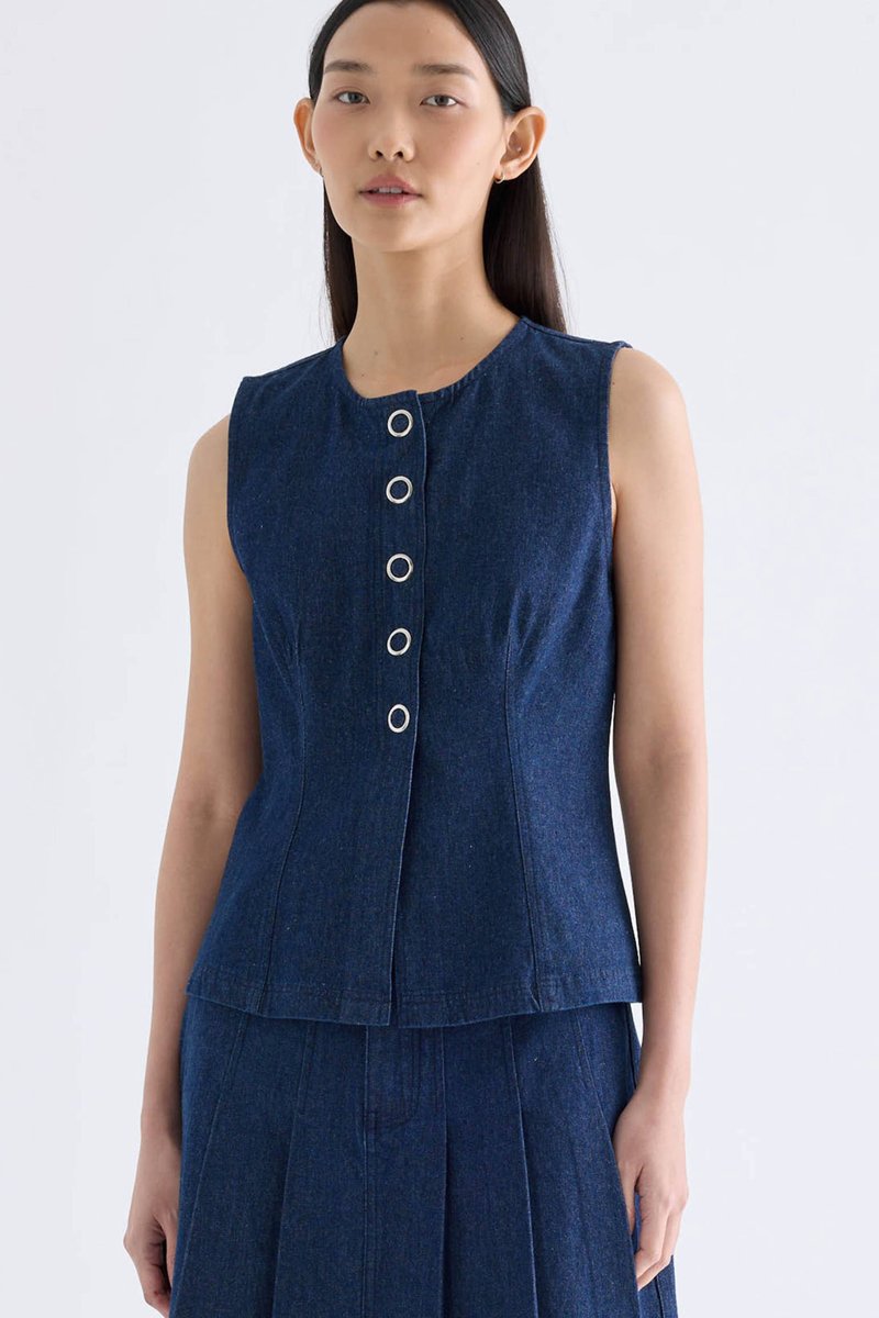 A true-blue essential. Made from softly structured cotton denim, this sleeveless top features a round neckline, sleek panelling and front snap buttons. Worn in a slim fit.