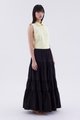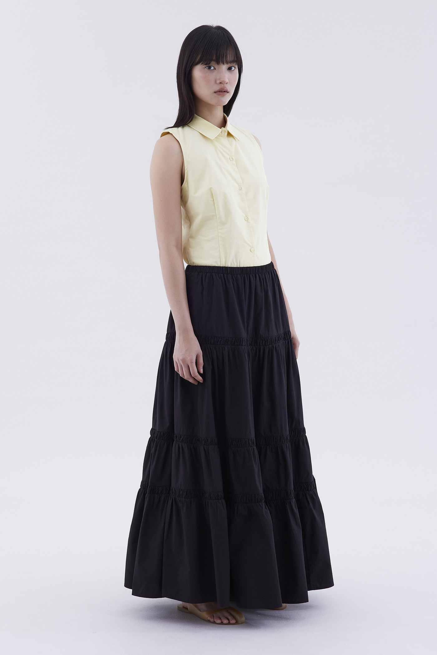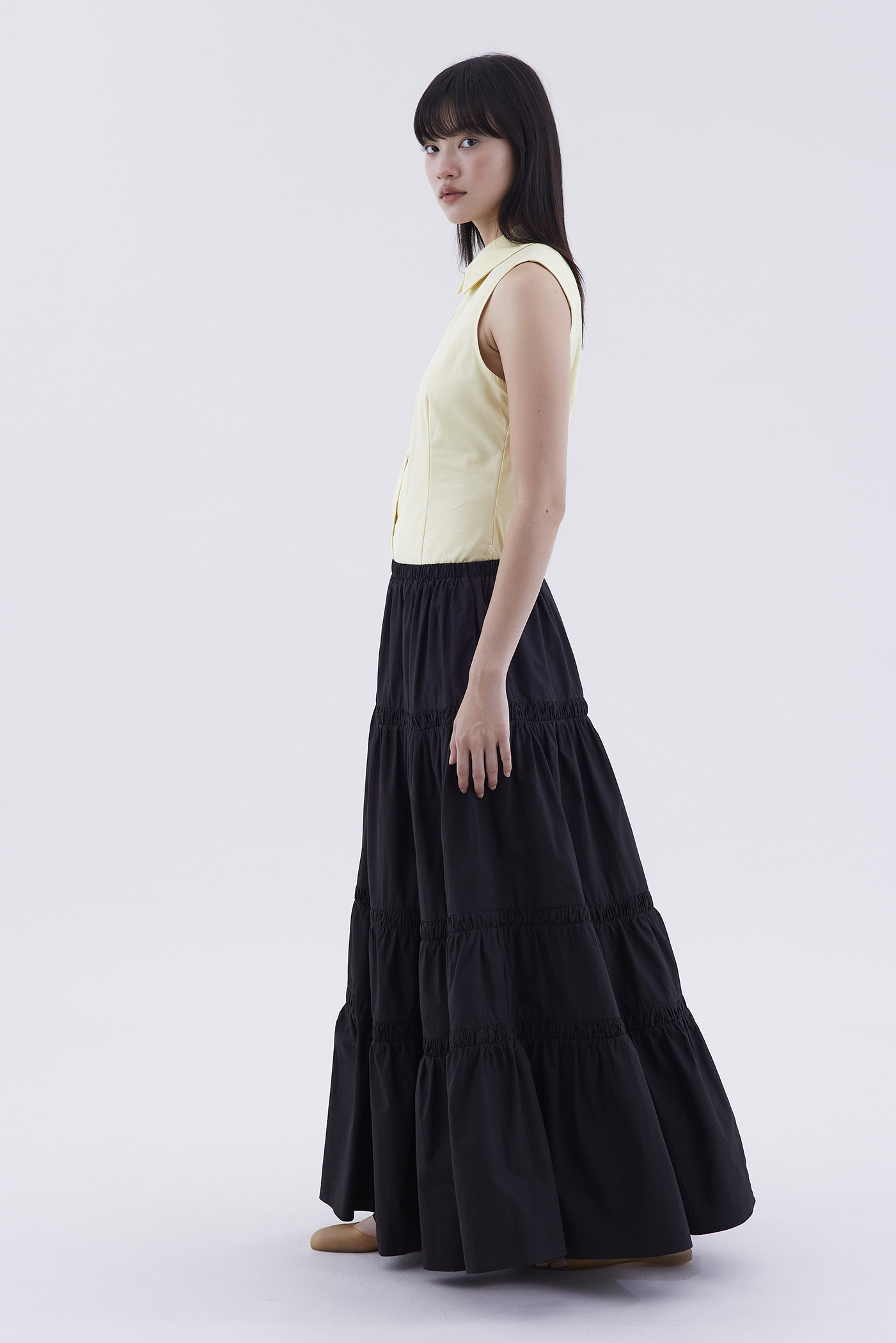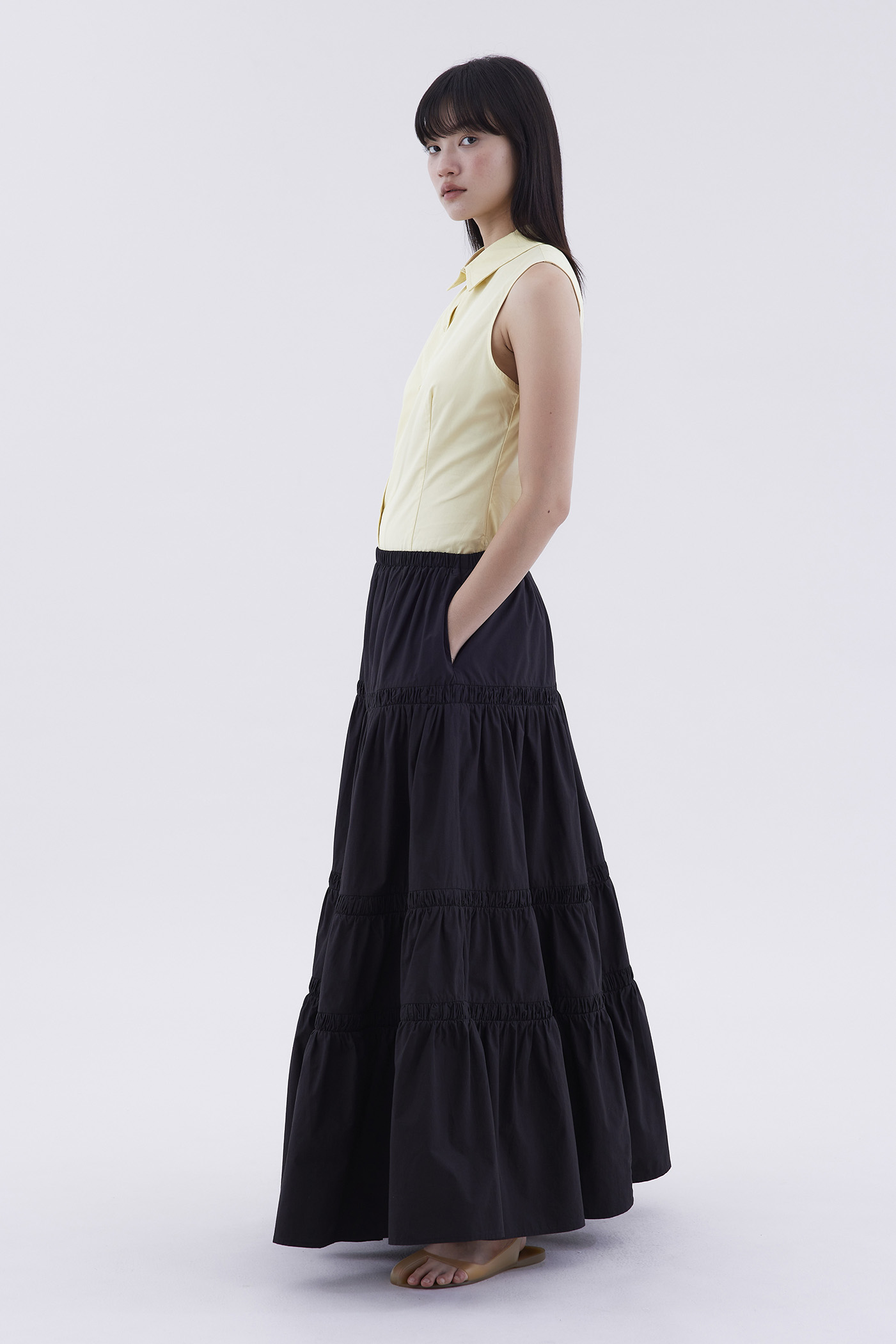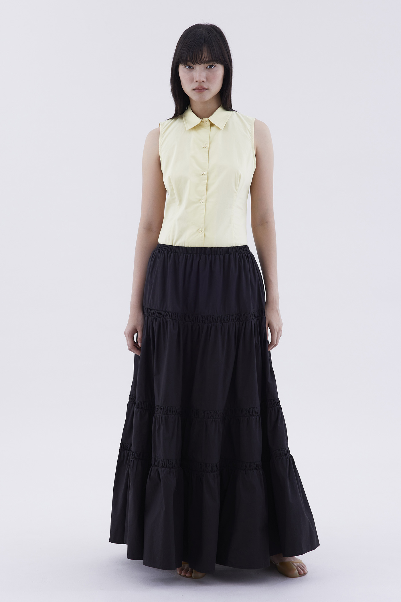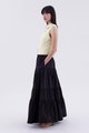 Go with the flow. Made from crisp and softly structured cotton, this maxi skirt features an elasticated waistband and a tiered A-line silhouette. Worn in a relaxed fit.
