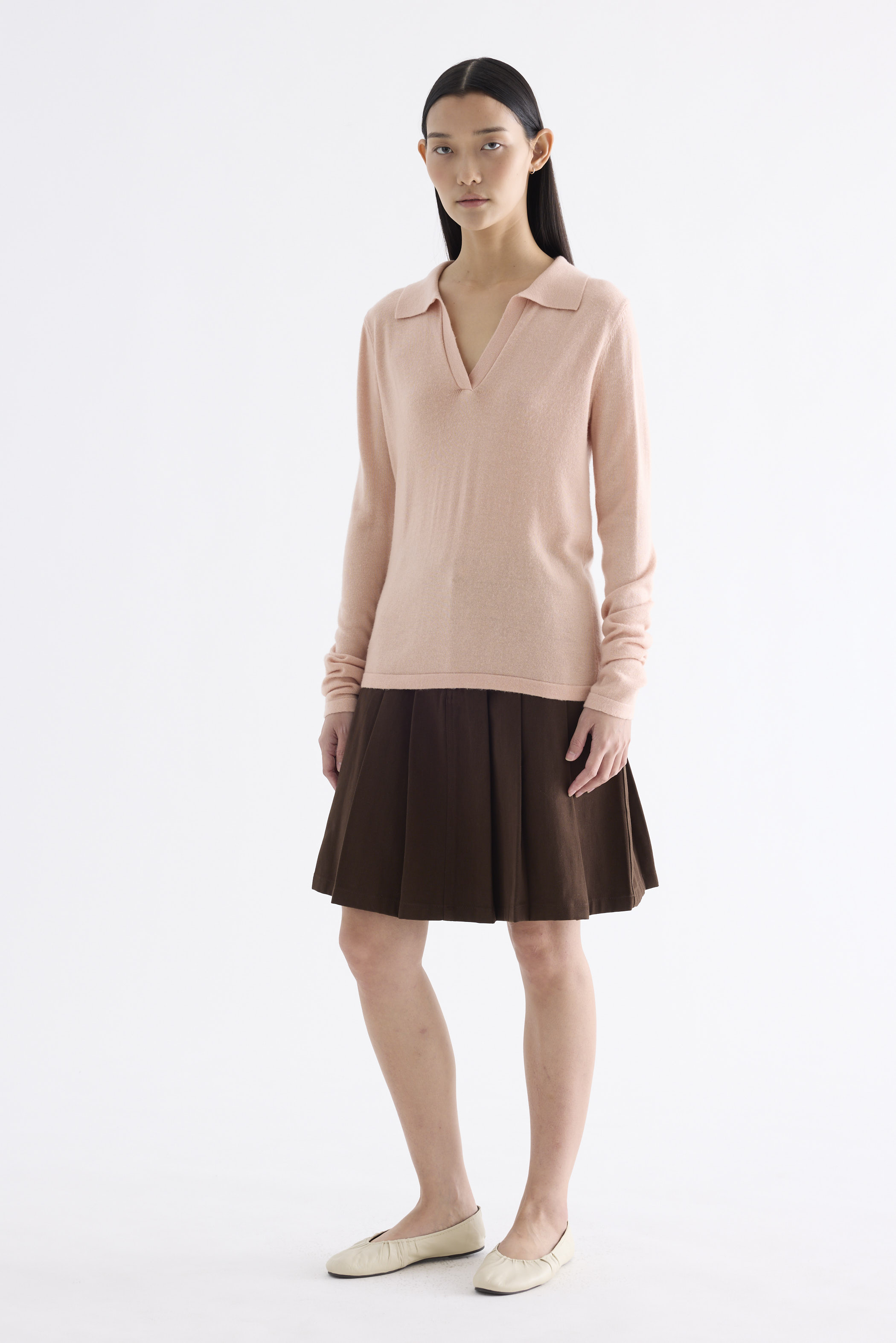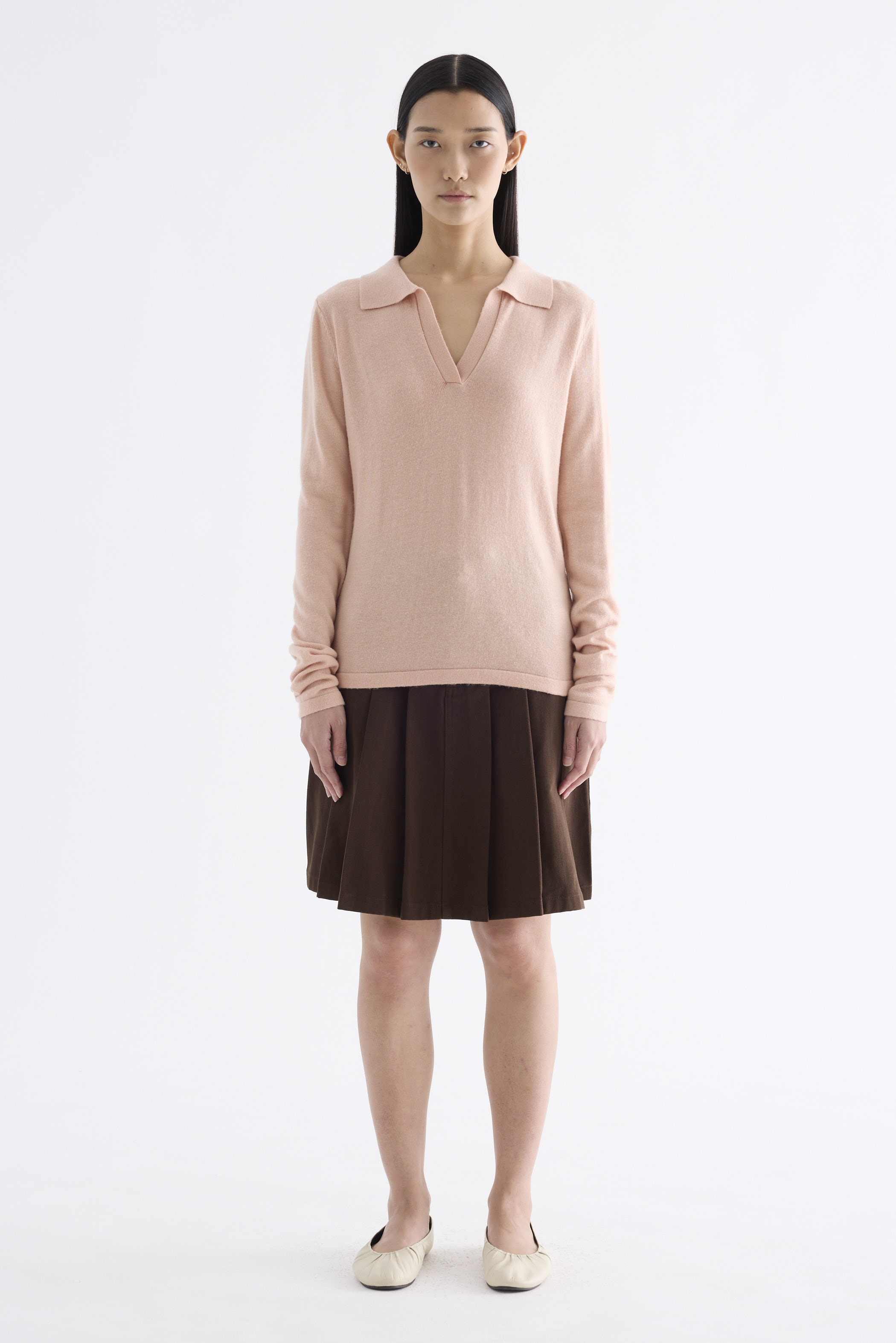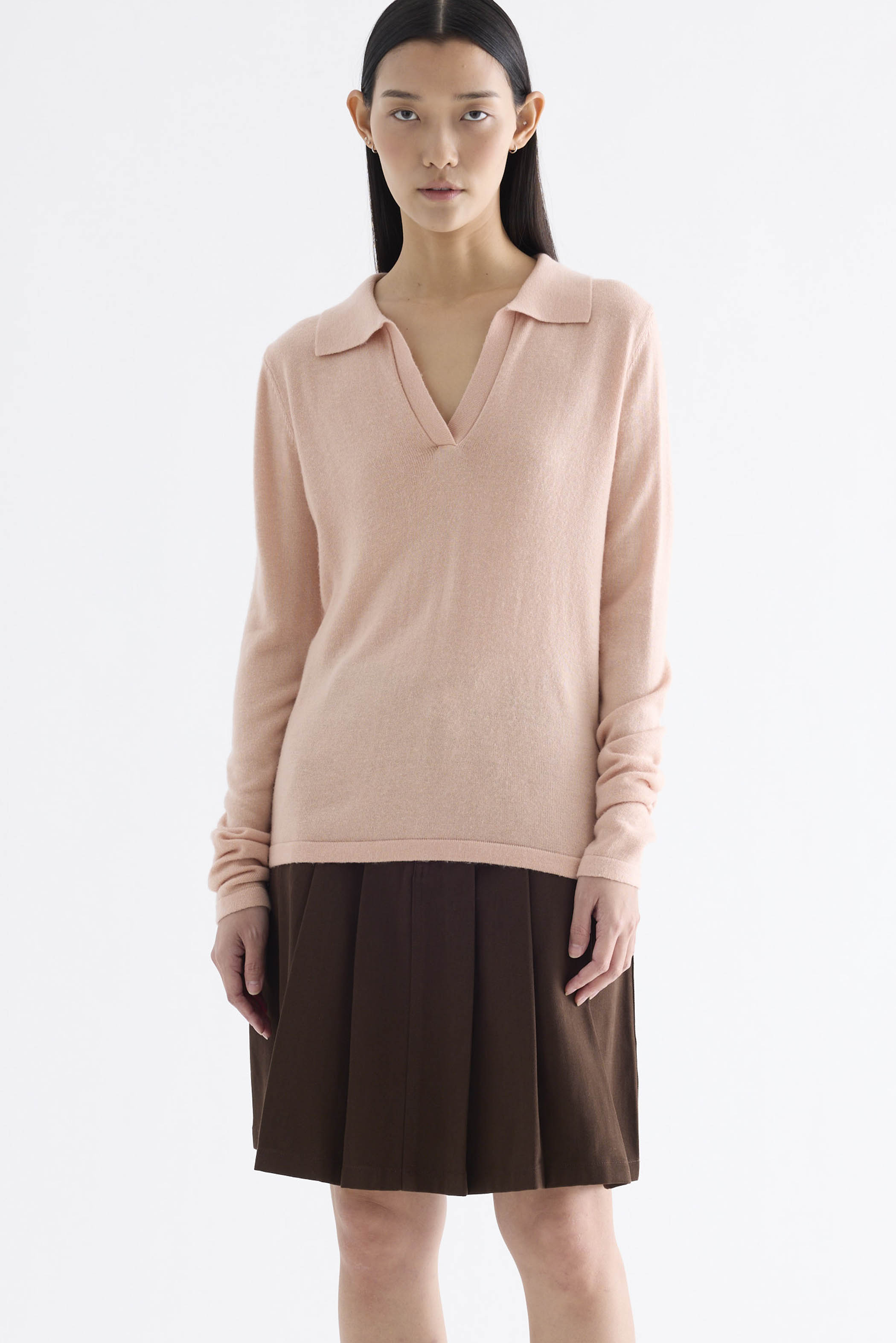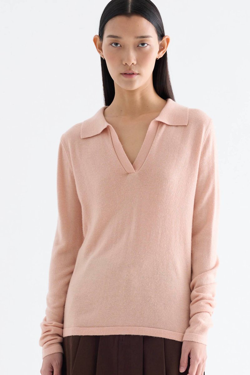 Snug enough. Made from soft and cosy knit, this sweater top features a collared V-neckline and slim fit.
