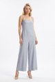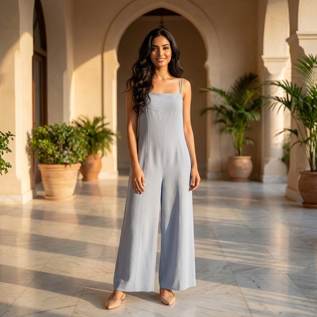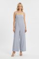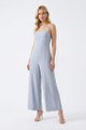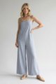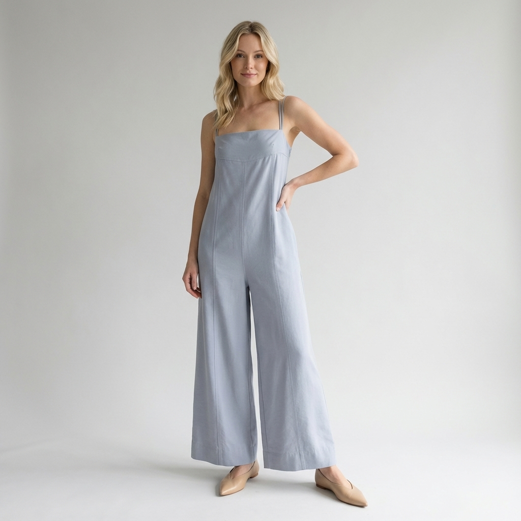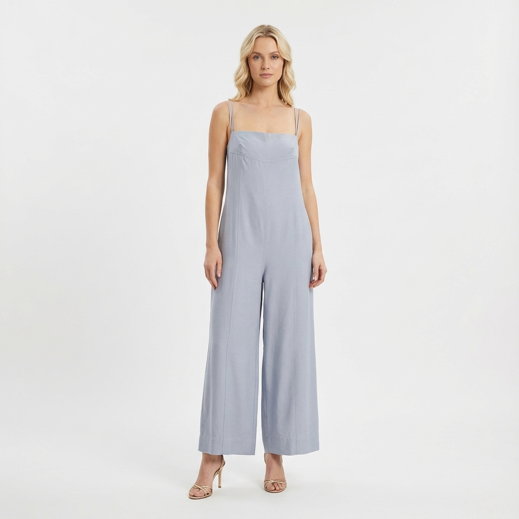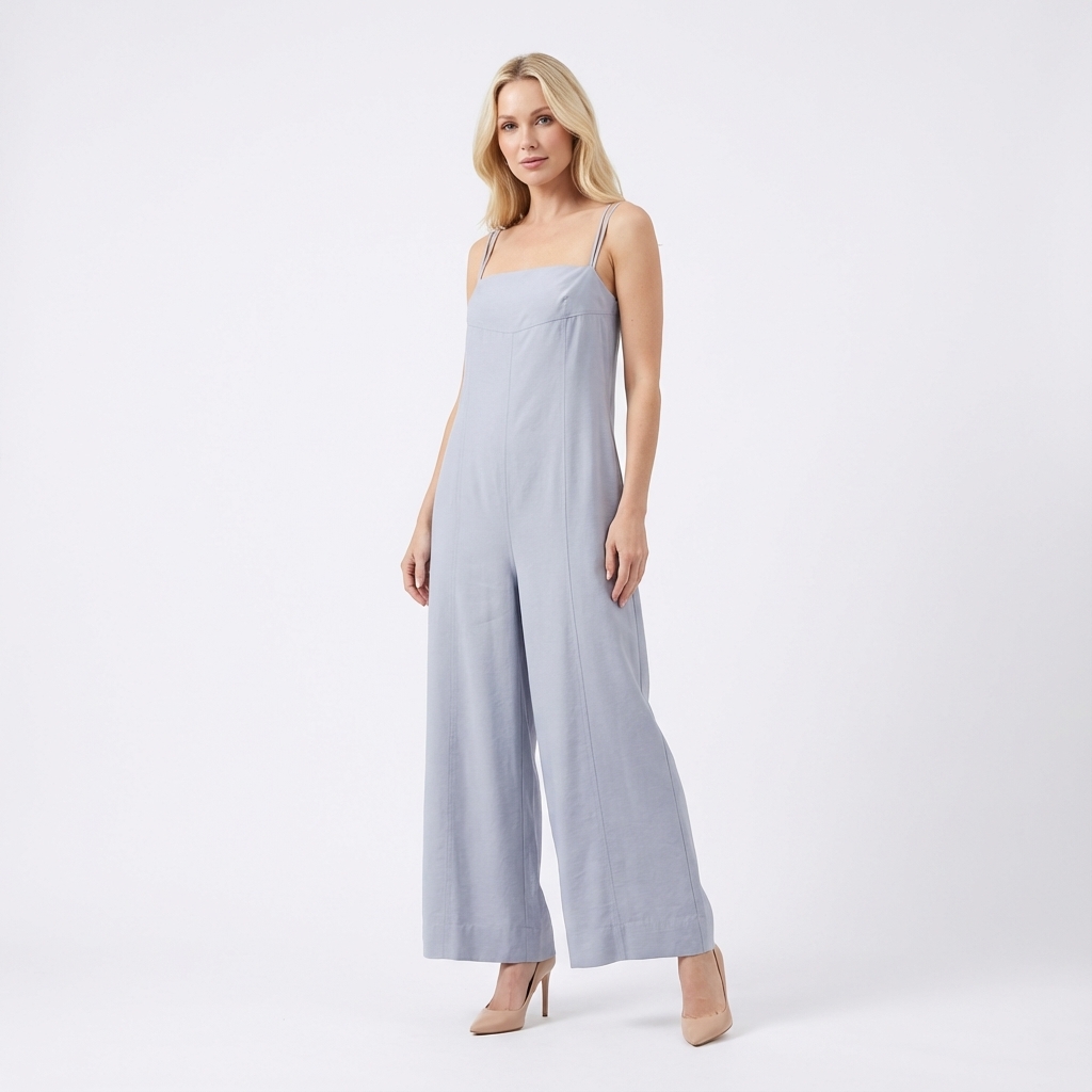 One piece wonder. Cut from smooth and drapey fabric, this sleeveless jumpsuit features double non-adjustable shoulder straps, a straight neckline, front panelling and wide legs. Fits relaxed with a back zip closure.