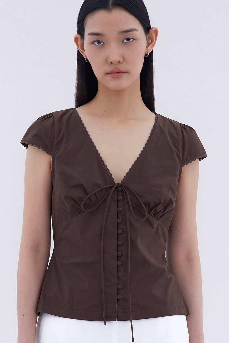 Details that count. Made from crisp and softly structured cotton, this lace-trimmed blouse features a V-shaped bustier neckline with a tie-strap, cap sleeves, front loop buttons and a back tie-strap. Worn in a slim fit with a side zip closure.