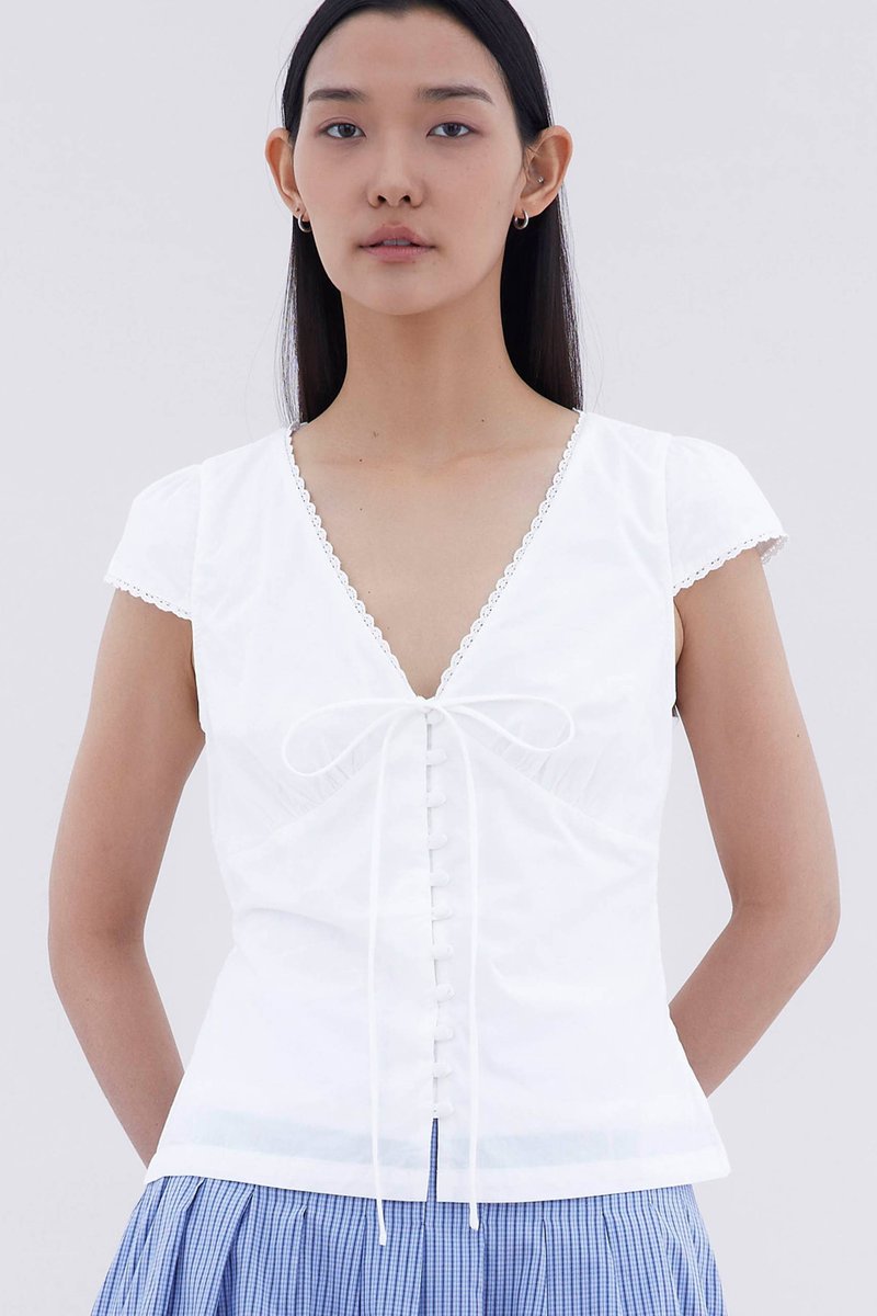 Details that count. Made from crisp and softly structured cotton, this lace-trimmed blouse features a V-shaped bustier neckline with a tie-strap, cap sleeves, front loop buttons and a back tie-strap. Worn in a slim fit with a side zip closure.